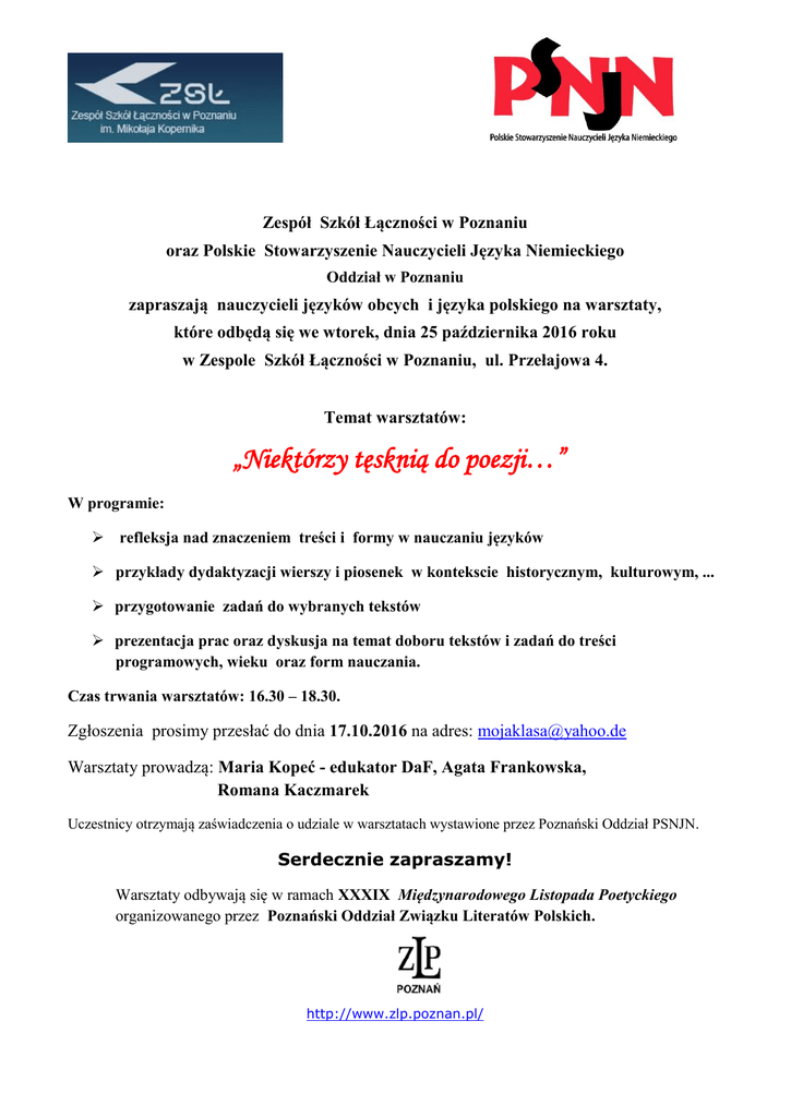 Zespół Szkół Łączności w Poznaniu oraz Polskie Stowarzyszenie Nauczycieli Języka Niemieckiego Oddział w Poznaniu zapraszają nauczycieli języków obcych i języka polskiego na warsztaty, które odbędą się we wtorek, dnia 25 października 2016 roku w Zespole Szkół Łączności w Poznaniu, ul. Przełajowa 4. Temat warsztatów: „Niektórzy tęsknią do poezji…” W programie: refleksja nad znaczeniem treści i formy w nauczaniu języków przykłady dydaktyzacji wierszy i piosenek w kontekscie historycznym, kulturowym, ... przygotowanie zadań do wybranych tekstów prezentacja prac oraz dyskusja na temat doboru tekstów i zadań do treści programowych, wieku oraz form nauczania. Czas trwania warsztatów: 16.30 – 18.30. Zgłoszenia prosimy przesłać do dnia 17.10.2016 na adres: [email protected] Warsztaty prowadzą: Maria Kopeć - edukator DaF, Agata Frankowska, Romana Kaczmarek Uczestnicy otrzymają zaświadczenia o udziale w warsztatach wystawione przez Poznański Oddział PSNJN. Serdecznie zapraszamy! Warsztaty odbywają się w ramach XXXIX Międzynarodowego Listopada Poetyckiego organizowanego przez Poznański Oddział Związku Literatów Polskich. http://www.zlp.poznan.pl/