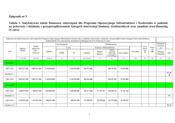 Załącznik nr 3 Tabela 1. Indykatywna tabela finansowa zobowiązań dla Programu Operacyjnego Infrastruktura i Środowisko w podziale na priorytety i działania z przyporządkowaniem kategorii interwencji funduszy strukturalnych oraz zasadom cross-financing (w euro) Indykatywna tabela finansowa zobowiązań dla Programu Operacyjnego Infrastruktura i Środowisko w podziale na priorytety i działania z przyporządkowaniem kategorii interwencji funduszy strukturalnych oraz oznaczonymi działaniami podlegającymi cross-financing (w euro) Unia Europejska Lata Ogółem POIiŚ Środki publiczne (UE + krajowe) 1=2+10 2=3+6 3 697 431 305 3 697 431 305 Wkład krajowy w tym Ogółem 3=4+5 Krajowy wkład publiczny EFRR FS Ogółem Budżet państwa Budżet jednostek samorządu terytorialnego 4 5 6=7+8+9 7 8 Inne ogółem 9 Prywatne 10 Crossfinanc ing % Pożyc zki EBI 11 12 Kategorii interwen cji Strategia lizbońska Inne 13 14 Priorytet I 2007-2013 3 142 816 609 3 142 816 609 554 614 696 456 741 841 97 872 855 44, 45, 46 Działanie 1.1 2007-2013 3 697 431 305 3 697 431 305 3 142 816 609 3 142 816 609 554 614 696 1 208 077 636 1 208 077 636 1 026 865 990 1 026 865 990 181 211 646 456 741 841 97 872 855 126 848 151 27 181 748 Priorytet II 2007-2013 27 181 747 44 Działanie 2.1 2007-2013 1 010 872 339 1 010 872 339 859 241 488 859 241 488 151 630 851 22 078 006 107 474 838 22 078 007 50, 53 Działanie 2.2 1 Indykatywna tabela finansowa zobowiązań dla Programu Operacyjnego Infrastruktura i Środowisko w podziale na priorytety i działania z przyporządkowaniem kategorii interwencji funduszy strukturalnych oraz oznaczonymi działaniami podlegającymi cross-financing (w euro) Unia Europejska Lata Ogółem POIiŚ 1=2+10 2007-2013 Środki publiczne (UE + krajowe) 2=3+6 Wkład krajowy w tym Ogółem 3=4+5 Krajowy wkład publiczny EFRR FS Ogółem Budżet państwa Budżet jednostek samorządu terytorialnego 4 5 6=7+8+9 7 8 Inne ogółem 9 197 205 297 197 205 297 167 624 502 167 624 502 29 580 795 5 103 741 19 373 313 5 103 741 655 045 306 655 045 306 556 788 510 556 788 510 98 256 796 73 971 219 19 372 737 4 912 840 Prywatne 10 Crossfinanc ing % Pożyc zki EBI 11 12 Kategorii interwen cji Strategia lizbońska Inne 13 14 Priorytet III 2007-2013 53 Działanie 3.1 2007-2013 582 591 501 582 591 501 495 202 776 495 202 776 87 388 725 63 576 990 19 372 737 4 438 998 53 Działanie 3.2 2007-2013 61 378 363 61 378 363 52 171 608 52 171 608 9 206 755 8 732 913 473 842 53 Działanie 3.3 2007-2013 11 075 442 11 075 442 9 414 126 834 528 335 335 586 912 250 000 000 9 414 126 1 661 316 1 661 316 Priorytet IV 2007-2013 250 000 000 85 586 912 85 586 912 498 941 423 54 Działanie 4.1 2007-2013 798 672 456 628 399 336 399 336 57 292 2 57 292 342 044 Indykatywna tabela finansowa zobowiązań dla Programu Operacyjnego Infrastruktura i Środowisko w podziale na priorytety i działania z przyporządkowaniem kategorii interwencji funduszy strukturalnych oraz oznaczonymi działaniami podlegającymi cross-financing (w euro) Unia Europejska Lata Ogółem POIiŚ 1=2+10 Środki publiczne (UE + krajowe) 2=3+6 Wkład krajowy w tym Ogółem 3=4+5 Krajowy wkład publiczny EFRR FS Ogółem Budżet państwa Budżet jednostek samorządu terytorialnego 4 5 6=7+8+9 7 8 Inne ogółem 9 Prywatne 10 154 657 138 59 976 157 46 376 277 46 376 277 13 599 880 13 599 880 121 796 771 49 032 644 36 539 031 36 539 031 12 493 613 12 493 613 14 46 38 212 420 15 392 786 11 463 726 11 463 726 3 929 060 3 929 060 22 819 634 47 472 842 378 192 121 240 141 355 343 141 355 343 50 765 897 50 765 897 280 721 138 44 Działanie 4.6 2007-2013 13 72 764 127 Działanie 4.5 2007-2013 12 Inne 48 Działanie 4.4 2007-2013 11 Strategia lizbońska 94 680 981 Działanie 4.3 2007-2013 Pożyc zki EBI Kategorii interwen cji 44 Działanie 4.2 2007-2013 Crossfinanc ing % 46 220 956 18 607 457 13 866 287 13 866 287 4 741 170 4 741 170 27 613 499 Priorytet V 2007-2013 105 647 060 105 647 060 89 800 000 89 800 000 15 847 060 12 561 529 1 325 824 1 959 707 51 Działanie 5.1 2007-2013 72 021 665 72 021 665 61 218 415 61 218 415 10 803 250 3 8 709 775 1 042 106 1 051 369 Indykatywna tabela finansowa zobowiązań dla Programu Operacyjnego Infrastruktura i Środowisko w podziale na priorytety i działania z przyporządkowaniem kategorii interwencji funduszy strukturalnych oraz oznaczonymi działaniami podlegającymi cross-financing (w euro) Unia Europejska Lata Ogółem POIiŚ 1=2+10 Środki publiczne (UE + krajowe) 2=3+6 Wkład krajowy w tym Ogółem 3=4+5 Krajowy wkład publiczny EFRR FS Ogółem Budżet państwa Budżet jednostek samorządu terytorialnego 4 5 6=7+8+9 7 8 Inne ogółem 9 Prywatne 10 Crossfinanc ing % Pożyc zki EBI 11 12 Kategorii interwen cji Strategia lizbońska Inne 13 14 51 Działanie 5.2 2007-2013 7 055 375 7 055 375 5 997 068 5 997 068 1 058 307 1 058 307 51 Działanie 5.3 2007-2013 16 554 180 16 554 180 14 071 053 14 071 053 2 483 127 2 483 127 51 Działanie 5.4 2007-2013 10 015 840 10 015 840 8 513 464 8 513 464 1 502 376 310 320 283 718 908 338 Do 100% crossfinancing 8 513 464 Priorytet VI 2007-2013 10 652 968 051 10 415 958 087 8 890 465 187 8 890 465 187 1 525 492 900 1 472 551 724 52 941 176 237 009 964 1 000 000 000 21 Działanie 6.1 2007-2013 9 337 680 748 9 337 680 748 7 937 028 636 7 937 028 636 1 400 652 112 1 347 710 936 21 Działanie 6.2 2007-2013 52 941 176 1 000 000 000 705 826 434 705 826 434 599 952 469 599 952 469 105 873 965 105 873 965 29 Działanie 6.3 4 22 Indykatywna tabela finansowa zobowiązań dla Programu Operacyjnego Infrastruktura i Środowisko w podziale na priorytety i działania z przyporządkowaniem kategorii interwencji funduszy strukturalnych oraz oznaczonymi działaniami podlegającymi cross-financing (w euro) Unia Europejska Lata 2007-2013 Ogółem POIiŚ Środki publiczne (UE + krajowe) Wkład krajowy w tym Ogółem Krajowy wkład publiczny EFRR FS Ogółem Budżet państwa Budżet jednostek samorządu terytorialnego 4 5 6=7+8+