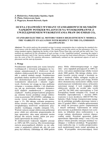 Zeszyty Problemowe – Maszyny Elektryczne Nr 78/2007 59 J. Hickiewicz, Politechnika Opolska, Opole P. Pluta, Elektrownia Opole J. Węgrzyn, Remak-Rozruch, Opole OCENA CELOWOŚCI WYMIANY STANDARDOWYCH SILNIKÓW NAPĘDÓW POTRZEB WŁASNYCH NA WYSOKOSPRAWNE Z UWZGLĘDNIENIEM WYKORZYSTANIA PRAW DO EMISJI CO2 STANDARD ELECTRICAL MOTORS VERSUS HIGH-EFFICIENCY MODELS. THE VIABILITY EVALUATION WITH RESPECT TO THE CO2 EMISSION ALLOWANCES Abstract: The article analyzes the potential savings in energy consumption due to replacing the standard electrical motors with the high-efficient substitutes. The starting point for this article are the parameters of the existing standard engines supplying the facility of the Opole Power Plant (the coal mill and the mill's fan). Two methods are employed for the calculation of such savings: (1) the “simplified method” assuming the engine’s nominal efficiency and (2) the “precise method” taking into account the load related efficiency. Considered are also the costs of the C02 emission allowances. Additionally outlined are the operational aspects of such replacement and the start-up dynamics. 1. Wstęp Przedmiotem opracowania jest ocena korzyści wynikających z inwestycji polegającej na wymianie zainstalowanych w Elektrowni Opole silników elektrycznych 6kV na nowoczesne silniki o małych stratach energii. Przedstawiono przykłady analizy możliwych do uzyskania efektów ekonomicznych przy wymianie silników wentylatorów młynowych i młynów węglowych. Zwrócono też uwagę na inne problemy związane z wymianą silników i ich eksploatacją, jak np. porównanie własności dynamicznych silników standardowych i „energooszczędnych”. Analizę przeprowadzono prognozując zmienne koszty produkcji energii elektrycznej na poziomie 100 zł/MWh i zakładając coroczny wzrost jednostkowego kosztu zmiennego o 1%. Dla takiego wariantu przeprowadzono również ocenę efektów ekonomicznych uwzględniającą możliwość zwiększenia przychodów wynikającą z handlu emisjami CO2. Wartość zużycia energii elektrycznej pobieranej przez silnik jest odwrotnie proporcjonalna do jego sprawności, taką samą zależność można przyjąć dla zużycia zasobu, jakim jest przyznane uprawnienie do emisji CO2. W elektrowniach większość napędów pracuje ze 100% lub 50% rezerwą. Dla równomiernego zużycia poszczególnych silników są one załączane w ustalonych cyklach tak, aby ich czas pracy był zbliżony. Zakładając ok. 6000 godzin pracy bloku elektroenergetycznego w ciągu roku – przy napędach pracujących ze 100% rezerwy, czas pracy pojedynczego silnika wynosi około 3000 godzin. Dla takiego silnika, zrównanie kosztów zużytej energii z kosztami zakupu i instalacji silnika, następuje zwykle po okresie około roku. Biorąc pod uwagę 20-letni okres ekonomicznej użyteczności silnika, koszt amortyzacji jest wielokrotnie niższy od kosztów zużywanej energii. Z tych względów silnik elektryczny określa się zwykle jako wyrób „tani”[4]. Od 2005 roku wprowadzono w Unii Europejskiej handel emisjami CO2. Został on formalnie zapoczątkowany 1 stycznia 2005r. wejściem w życie dyrektywy 2003/87/WE Parlamentu i Rady Europy transponowanej następnie do polskiego porządku prawnego ustawą z dnia 22 grudnia 2004 r. o handlu uprawnieniami do emisji do powietrza gazów cieplarnianych i innych substancji. Uprawnienia do emisji przyznawane są podmiotom objętym tym systemem, na kilkuletni okres rozliczeniowy i są swego rodzaju określeniem wartości dopuszczalnej emisji. Przydział uprawnień (jedno uprawnienie odpowiada emisji 1 tony CO2) ma pokryć własne potrzeby emisyjne instalacji wynikające z wielkości produkcji. Wygospodarowana nadwyżka (np. w wyniku przeprowadzonych modernizacji) może zostać sprzedana na rynku. W przypadku niewystarczającej ilości 60 Zeszyty Problemowe – Maszyny Elektryczne Nr 78/2007 uprawnień, prowadzący instalację musi dokupić ilość potrzebną do prowadzenia produkcji. Rozporządzenie Rady Ministrów z 27 grudnia 2005 r. w sprawie przyjęcia Krajowego Planu Rozdziału Uprawnień do emisji dwutlenku węgla na lata 2005-2007, przydzieliło przedsiębiorstwom limit uprawnień do wypuszczenia do atmosfery określonych ilości dwutlenku węgla rocznie. Między innymi limit taki został przyznany Elektrowni Opole. Każde przedsiębiorstwo, które otrzymało limit uprawnień, jest zobowiązane rozliczyć się z nich. Musi w tym celu sporządzić roczny raport z rozliczenia uprawnień do 31 grudnia. Na podstawie raportu liczba praw odpowiadająca rzeczywistej emisji w danym roku ulega umorzeniu. Do 31 marca następnego roku raport z wykorzystania uprawnień powinien być zweryfikowany przez audytorów. Jeżeli raport potwierdzi nadwyżkę rzeczywistej emisji nad przyznanymi uprawnieniami, na wniosek przedsiębiorstwa, właściwy organ może wyrazić zgodę na pokrycie tej różnicy uprawnieniami przyznanymi na następny rok okresu rozliczeniowego. Warunkiem wyrażenia zgody jest zobowiązanie się przedsiębiorstwa do odpowiedniego zmniejszenia emisji, lub do zakupu uprawnień do emisji w następnym roku okresu rozliczeniowego. W innym przypadku przedsiębiorstwo musi kupić uprawnienia na rynku, lub w najgorszym przypadku, uiścić karę pieniężną. Do dnia dzisiejszego nie opracowano jeszcze obowiązującego standardu rachunkowego dotyczącego wyceny uprawnień do emisji CO2. Jednak wprowadzona zasada limitowania i handlu uprawnieniami uprawnia do traktowania ich jak zasób, który upraszczając, można bądź zużyć, bądź sprzedać. Wobec tego zużycie uprawnień do emisji CO2, przez urządzenia, które biorą udział w procesie technologicznym w elektrowni i są zasilane energią produkowaną w instalacji wytwórczej, powinno być uwzględniane w analizie opłacalności modernizacji tych urządzeń. Rok 2007 jest pod względem cen praw do emisji CO2 rokiem bardzo niestabilnym – cena praw do emisji CO2 w