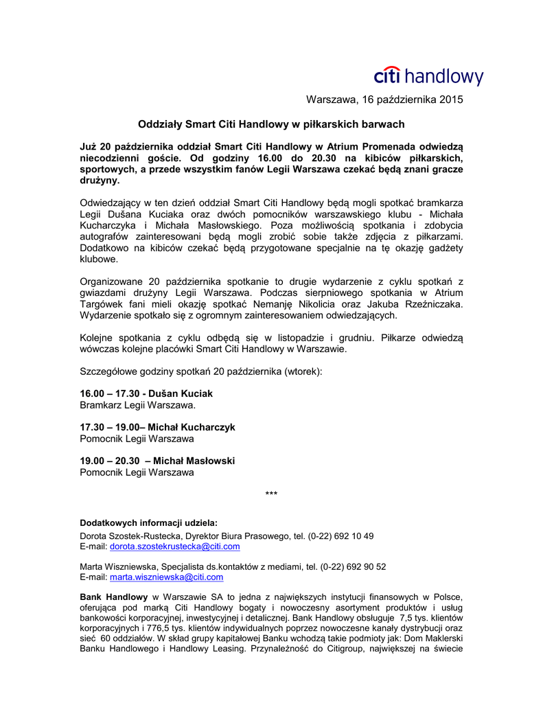 Warszawa, 16 października 2015 Oddziały Smart Citi Handlowy w piłkarskich barwach Już 20 października oddział Smart Citi Handlowy w Atrium Promenada odwiedzą niecodzienni goście. Od godziny 16.00 do 20.30 na kibiców piłkarskich, sportowych, a przede wszystkim fanów Legii Warszawa czekać będą znani gracze drużyny. Odwiedzający w ten dzień oddział Smart Citi Handlowy będą mogli spotkać bramkarza Legii Dušana Kuciaka oraz dwóch pomocników warszawskiego klubu - Michała Kucharczyka i Michała Masłowskiego. Poza możliwością spotkania i zdobycia autografów zainteresowani będą mogli zrobić sobie także zdjęcia z piłkarzami. Dodatkowo na kibiców czekać będą przygotowane specjalnie na tę okazję gadżety klubowe. Organizowane 20 października spotkanie to drugie wydarzenie z cyklu spotkań z gwiazdami drużyny Legii Warszawa. Podczas sierpniowego spotkania w Atrium Targówek fani mieli okazję spotkać Nemanję Nikolicia oraz Jakuba Rzeźniczaka. Wydarzenie spotkało się z ogromnym zainteresowaniem odwiedzających. Kolejne spotkania z cyklu odbędą się w listopadzie i grudniu. Piłkarze odwiedzą wówczas kolejne placówki Smart Citi Handlowy w Warszawie. Szczegółowe godziny spotkań 20 października (wtorek): 16.00 – 17.30 - Dušan Kuciak Bramkarz Legii Warszawa. 17.30 – 19.00– Michał Kucharczyk Pomocnik Legii Warszawa 19.00 – 20.30 – Michał Masłowski Pomocnik Legii Warszawa *** Dodatkowych informacji udziela: Dorota Szostek-Rustecka, Dyrektor Biura Prasowego, tel. (0-22) 692 10 49 E-mail: [email protected] Marta Wiszniewska, Specjalista ds.kontaktów z mediami, tel. (0-22) 692 90 52 E-mail: [email protected] Bank Handlowy w Warszawie SA to jedna z największych instytucji finansowych w Polsce, oferująca pod marką Citi Handlowy bogaty i nowoczesny asortyment produktów i usług bankowości korporacyjnej, inwestycyjnej i detalicznej. Bank Handlowy obsługuje 7,5 tys. klientów korporacyjnych i 776,5 tys. klientów indywidualnych poprzez nowoczesne kanały dystrybucji oraz sieć 60 oddziałów. W skład grupy kapitałowej Banku wchodzą takie podmioty jak: Dom Maklerski Banku Handlowego i Handlowy Leasing. Przynależność do Citigroup, największej na świecie instytucji finansowej, zapewnia klientom Banku Handlowego dostęp do usług finansowych w ponad 100 krajach. Citi (NYSE:C) to wiodąca globalna instytucja finansowa, mająca około 200 milionów klientów w ponad 140 krajach. Poprzez swoje dwie odrębne jednostki operacyjne: Citicorp i Citi Holdings, Citi obsługuje klientów indywidualnych, korporacyjnych, rządowych i instytucjonalnych zapewniając im bogaty wachlarz produktów i usług finansowych w zakresie bankowości detalicznej, bankowości korporacyjnej i inwestycyjnej, usług maklerskich i zarządzania aktywami. Dodatkowe informacje można uzyskać na stronie internetowej www.citigroup.com lub www.citi.com.