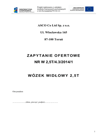 Projekt realizowany z udziałem środków finansowych pochodzących z Unii Europejskiej PO IG 4.3 ASCO Co Ltd Sp. z o.o. Ul. Włocławska 165 87-100 Toruń ZAPYTANIE OFERTOWE NR W 2,5T/4.3/2014/1 WÓZEK WIDŁOWY 2,5T Otrzymałem …………………(data, pieczęć, podpis)………………… 1 Projekt realizowany z udziałem środków finansowych pochodzących z Unii Europejskiej PO IG 4.3 1. WPROWADZENIE Firma ASCO powstała w 1987 roku. ASCO jest kooperantem renomowanych firm europejskich i dostarcza im wyroby oraz usługi najwyższej jakości zgodnie z ustalonymi wymogami. Firma ASCO jest firmą typowo usługową i realizuje produkcje pod potrzeby klientów. Naszym priorytetem jest wysoka jakość i wysoka elastyczność działania – krótkie terminy realizacji zleceń. Firma specjalizuje się w produkcji: a) części maszyn dla rolnictwa i leśnictwa b) części i elementy do pojazdów mechanicznych c) różnorodnych konstrukcji stalowych i detali i wyrobów dla budownictwa d) usługowym cięciu laserem 2. CELE ZAPYTANIA OFERTOWEGO Zapytanie ofertowe związane z wyborem dostawcy wózka widłowego 1T w ramach projektu „ Wdrożenie technologii specjalnego łączenia elementów i unikalnej kontroli ich jakości” realizowanego w ramach Programu Operacyjnego Innowacyjna Gospodarka na lata 2007-2013, Priorytet 4: Inwestycje w innowacyjne przedsięwzięcia, Działanie 4.3: Kredyt Technologiczny. 3. PRZEDMIOT ZAPYTANIA OFERTOWEGO Celem niniejszego zapytania ofertowego jest wybór dostawcy jednokierunkowego o nośności 1T i zakresie pracy masztu 2m. wózka widłowego Założenia techniczne dotyczące przedmiotu prac Zamawiający udostępni zainteresowanym oferentom na spotkaniu przy odbiorze zapytania ofertowego. 4. OSOBY UPRAWNIONE DO KONTAKTU Z OFERENTEM Osobą uprawnioną do porozumiewania się z Wykonawcami jest: Krzysztof Garwoliński Tel. +48 56 654 74 68 Faks: +48 56 654 73 65 e-mail: [email protected] 5. WYBÓR OFERENTA 2 Projekt realizowany z udziałem środków finansowych pochodzących z Unii Europejskiej PO IG 4.3 Ocena zgodności ofert z wymaganiami Zamawiającego przeprowadzona zostanie wyłącznie na podstawie analizy dokumentów i materiałów, jakie Oferent zawarł w swej ofercie. Ocenie podlegać będzie zarówno formalna, jak i merytoryczna zgodność oferty z wymaganiami. Zamawiający zastrzega sobie prawo sprawdzania w toku oceny ofert wiarygodności przedstawionych przez Oferentów dokumentów, wykazów, danych i informacji. 5.1 Kryterium wyboru oraz ich waga Kryterium Cena Waga 100 % Wybór oferenta dokonany zostanie na podstawie największej ilości uzyskanych punktów, zgodnie z poniższym wzorem: Ocena końcowa = ∑ P(k) P(k) = waga * M(k), gdzie M(k) oznacza liczbę punktów w danym kryterium, przy czym w każdym kryterium maksymalnie można uzyskać 100 punktów. Liczba punków przyznanych oferentowi w danym kryterium zostanie obliczona zgodnie ze wzorem. M(k) =100 – {(100/n)*[n – (n – k + 1)]} n – liczba oferentów, k – kolejność w kryterium 6. SPOSÓB OCENY OFERTY – USZCZEGÓŁOWNIE KRYTERIÓW Ocena zgodności ofert z wymaganiami Zamawiającego przeprowadzona zostanie na podstawie analizy dokumentów i materiałów, jakie Oferent zawarł w swej ofercie. Ocenie podlegać będzie zarówno formalna jak i merytoryczna zgodność oferty z wymaganiami. Zamawiający zastrzega sobie prawo sprawdzania w toku oceny ofert wiarygodności oferentów oraz przedstawionych przez Oferentów dokumentów, wykazów, danych i informacji. 7. TERMINY I MIEJSCE SKLADANIA OFERT 3 Projekt realizowany z udziałem środków finansowych pochodzących z Unii Europejskiej PO IG 4.3 Ofertę należy przesłać na adres e-mail osoby upoważnionej lub złożyć w siedzibie zamawiającego pod adresem adres: ASCO Co Ltd Sp. z o.o. Ul. Włocławska 165 87-100 Toruń • Termin składania ofert: 16.10.2014 • Termin oceny ofert: 17.10.2014 8. SPOSÓB PRZYGOTOWANIA OFERTY • Oferta może być dostarczona w formie papierowej lub elektronicznej (plik w formacie pdf lub word). • Oferta powinna zawierać, co najmniej wypełniony formularz ofertowy lub dokument równoważny. • Każdy Oferent może złożyć tylko jedną ofertę. • Żadne dokumenty wchodzące w skład oferty, w tym również te przedstawiane w formie oryginałów, nie podlegają zwrotowi przez Zamawiającego. Oferent ponosi wszelkie koszty związane z przygotowaniem i złożeniem oferty. • Nie dopuszcza się składania ofert częściowych ani wariantowych • Podana w ofercie cena ofertowa musi uwzględniać wszystkie wymagania Zamawiającego określone w opisie przedmiotu zamówienia oraz zawierać wszelkie koszty, jakie poniesie Oferent z tytułu należytej oraz zgodnej z obowiązującymi przepisami realizacji przedmiotu zamówienia. • Wszystkie ceny powinny być podane w PLN. 9. TERMIN ZWIĄZANIA OFERTĄ Oferent (o ile nie zaznaczy inaczej) pozostaje związany złożoną ofertą przez 60 dni. Bieg terminu związania ofertą rozpoczyna się wraz z upływem terminu składania ofert. 10. ZAWIADOMIENIE O WYBORZE Oferent o wyborze jego oferty zostanie powiadomiony poprzez e-mail lub telefonicznie. Toruń dn. 12.09.2014 r. 4 Projekt realizowany z udziałem środków finansowych pochodzących z Unii Europejskiej PO IG 4.3 Załącznik nr 1 /miejscowość, data/ FORMULARZ OFERTOWY Dane Oferenta: Podejmujemy się wykonania działań będących przedmiotem zapytania ofertowego z dnia 12.09.2014 r. zgodnie z wiedzą techniczną, obowiązującymi przepisami oraz normami i należytą starannością. 1.1. Zakres i cena Rodzaj aktywu System ogrzewania Cena netto Podatek VAT Cena brutto i wentylacji hali 1.2. Gwarancja: ………………………………………………………………………………………… …………………………………………………………………………………………. 1.3. Warunki i termin płatności: ……………………………………………………