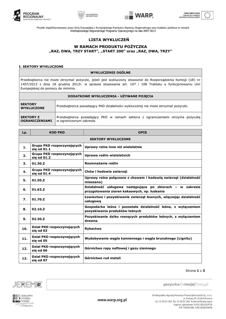 LISTA WYKLUCZEŃ W RAMACH PRODUKTU POŻYCZKA „RAZ, DWA, TRZY START”, „START 200” oraz „RAZ, DWA, TRZY” I. SEKTORY WYKLUCZONE WYKLUCZENIE OGÓLNE Przedsiębiorca nie może otrzymać pożyczki, jeżeli jest wykluczony stosownie do Rozporządzenia Komisji (UE) nr 1407/2013 z dnia 18 grudnia 2013r. w sprawie stosowania art. 107 i 108 Traktatu o funkcjonowaniu Unii Europejskiej do pomocy de minimis. DODATKOWE WYKLUCZENIA - UŻYWANE POJĘCIA SEKTORY WYKLUCZONE Przedsiębiorca posiadający PKD działalności wykluczonej nie może otrzymać pożyczki. SEKTORY Z OGRANICZENIAMI Przedsiębiorca posiadający PKD w ramach sektora z ograniczeniami otrzyma pożyczkę w ograniczonym zakresie. Lp. KOD PKD OPIS SEKTORY WYKLUCZONE 1. Grupa PKD rozpoczynających Uprawy rolne inne niż wieloletnie się od 01.1 2. Grupa PKD rozpoczynających Uprawa roślin wieloletnich się od 01.2 3. 01.30.Z 4. 5. Rozmnażanie roślin Grupa PKD rozpoczynających Chów i hodowla zwierząt się od 01.4 Uprawy rolne połączone z chowem i hodowlą zwierząt (działalność 01.50.Z mieszana) 6. 01.63.Z Działalność usługowa następująca po zbiorach przygotowania ziaren kakaowych, np. łuskania – w zakresie 7. 01.70.Z Łowiectwo i pozyskiwanie zwierząt łownych, włączając działalność usługową 8. 02.10.Z Gospodarka leśna i pozostała działalność leśna, z wyłączeniem pozyskiwania produktów leśnych 9. 02.30.Z Pozyskiwanie dziko rosnących produktów leśnych, z wyłączeniem drewna 10. Dział PKD rozpoczynających się od 03 Rybactwo 11. Dział PKD rozpoczynających się od 05 Wydobywanie węgla kamiennego i węgla brunatnego (Lignitu) 12. Dział PKD rozpoczynających się od 06 Górnictwo ropy naftowej i gazu ziemnego 13. Dział PKD rozpoczynających się od 07 Górnictwo rud metali Strona 1 z 3 14. 10.11.Z Przetwarzanie i konserwowanie mięsa, z wyłączeniem z drobiu 15. 10.12.Z Przetwarzanie i konserwowanie mięsa z drobiu 16. 10.13.Z Produkcja wyrobów z mięsa, włączając wyroby z mięsa drobiowego 17. 10.20.Z Przetwarzanie i konserwowanie ryb, skorupiaków i mięczaków 18. 10.31.Z Przetwórstwo i konserwowanie ziemniaków 19. 10.32.Z Produkcja soków z owoców i warzyw 20. 10.39.Z Pozostałe przetwarzanie i konserwowanie owoców i warzyw 21. 10.41.Z Produkcja olejów i pozostałych tłuszczów płynnych 22. 10.42.Z Produkcja margaryny i podobnych tłuszczów jadalnych 23. 10.51.Z Przetwórstwo mleka i wyrobów serów, z wyłączeniem produkcji masła 24. 10.61.Z Wytwarzanie produktów przemiału zbóż 25. 10.62.Z Wytwarzanie skrobi i produktów skrobiowych 26. 10.73.Z Produkcja makaronów, klusek, kuskusu i podobnych wyrobów mącznych - tylko tych, które zawierają w masie ponad 20% ryb, skorupiaków, mięczaków lub innych bezkręgowców wodnych 27. 10.81.Z Produkcja cukru 28. 10.84.Z Produkcja przypraw – w zakresie produkcji octu 29. 10.89.Z Produkcja pozostałych artykułów spożywczych, gdzie indziej nieklasyfikowana dotyczy podmiotów zajmujących się działalnością – w zakresie produkcji wyrobów z jaj, miodu i karmelu 30. 10.91.Z Produkcja gotowej paszy dla zwierząt gospodarskich 31. 10.92.Z Produkcja gotowej karmy dla zwierząt domowych 32. 11.01.Z Destylowanie, rektyfikowanie i mieszanie alkoholi 33. 11.02.Z Produkcja win gronowych 34. 11.03.Z Produkcja cydru i pozostałych win owocowych 35. 11.04.Z Produkcja pozostałych fermentowanych 36. 13.10.D Produkcja przędzy z pozostałych włókien tekstylnych, włączając produkcję nici - dotyczy podmiotów zajmujących się działalnością w zakresie wydobywania włókna ze słomy lnianej i konopnej 37. 20.14.Z Produkcja pozostałych podstawowych chemikaliów organicznych – w zakresie produkcji alkoholu etylowego niedestylowanych mięsa napojów Strona 2 z 3 38. 46.21.Z Sprzedaż hurtowa zboża, nieprzetworzonego tytoniu, nasion i pasz dla zwierząt - dotyczy podmiotów zajmujących się działalnością w zakresie sprzedaży hurtowej zboża, rzepaku lub wprowadzania do obrotu materiału siewnego roślin rolniczych i warzywnych 39. 46.22.Z Sprzedaż hurtowa kwiatów i roślin 40. 46.31.Z Sprzedaż hurtowa owoców i warzyw 41. 46.32.Z Sprzedaż hurtowa mięsa i wyrobów z mięsa 42. 46.33.Z Sprzedaż hurtowa mleka, wyrobów mleczarskich, jaj, olejów i tłuszczów jadalnych - dotyczy podmiotów zajmujących się działalnością w zakresie sprzedaży hurtowej mleka i wyrobów mleczarskich 43. 52.10.B Magazynowanie i przechowywanie pozostałych towarów - dotyczy podmiotów zajmujących się działalnością w zakresie usługowego zamrażania i przechowywania produktów rolnych II. SEKTORY Z OGRANICZENIAMI Lp. KOD PKD OPIS SEKTORY Z OGRANICZENIAMI TRANSPORT - ZAKAZ FINANSOWANIA ZAKUPU ŚRODKA TRANSPORTU I URZĄDZEŃ TRANSPORTOWYCH 1. 49.41.Z Transport drogowy towarów TRANSPORT - PRÓG POMOCY DO 100 TYS. EURO (na cel inny niż zakup środka transportu i urządzeń transportowych) 1. 49.41.Z Transport drogowy towarów Strona 3 z 3