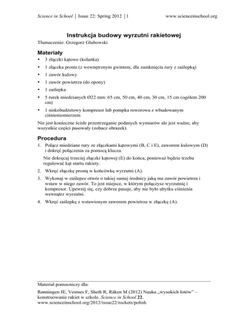 Science in School ⏐ Issue 22: Spring 2012 ⏐1 www.scienceinschool.org Instrukcja budowy wyrzutni rakietowej Tłumaczenie: Grzegorz Glubowski Materiały • 3 złączki kątowe (kolanka) • 1 złączka prosta (z wewnętrznym gwintem, dla zamknięcia rury z zaślepką) • 1 zawór kulowy • 1 zawór powietrza (do opony) • 1 zaślepka • 5 rurek miedzianych Ø22 mm: 65 cm, 50 cm, 40 cm, 30 cm, 15 cm (ogółem 200 cm) • 1 niskobudżetowy kompresor lub pompka rowerowa z wbudowanym ciśnieniomierzem Nie jest konieczne ścisłe przestrzeganie podanych wymiarów ale jest ważne, aby wszystkie części pasowały (zobacz obrazek). Procedura 1. Połącz miedziane rury ze złączkami kątowymi (B, C i E), zaworem kulowym (D) i dokręć połączenia za pomocą klucza. Nie dokręcaj trzeciej złączki kątowej (E) do końca, ponieważ będzie trzeba regulować kąt startu rakiety. 2. Wkręć złączkę prostą w końcówkę wyrzutni (A). 3. Wykonaj w zaślepce otwór o takiej samej średnicy jaką ma zawór powietrza i wstaw w niego zawór. To jest miejsce, w którym połączysz wyrzutnię i kompresor. Upewnij się, czy dobrze pasuje, aby nie było ubytku ciśnienia wewnątrz wyrzutni. 4. Wkręć zaślepkę z wstawionym zaworem powietrza w złączkę (A). Materiał pomocniczy dla: Rønningen JE, Vestnes F, Sheth R, Råken M (2012) Nauka „wysokich lotów” – konstruowanie rakiet w szkole. Science in School 22. www.scienceinschool.org/2012/issue22/rockets/polish Science in School ⏐ Issue 22: Spring 2012 ⏐2 www.scienceinschool.org Rysunek 1: Składanie wyrzutni: A) połączenia złączki prostej, zaślepki i zaworu powietrza; B) złączka kątowa (dobrze dokręcona); C) złączka kątowa (dobrze dokręcona); D) zawór kulowy, którym wypuszczane jest powietrze z wyrzutni; E) trzecia złączka kątowa (dokręcona tak, aby umożliwić regulacje) Zdjęcie dzięki uprzejmości Frida Vestnes / Team Space Camp Podziękowania Przedstawione tu instrukcje zostały przygotowane w Norwegian Centre for SpaceRelated Education (NAROM) i przetłumaczone przez Team Space Camp. Materiał pomocniczy dla: Rønningen JE, Vestnes F, Sheth R, Råken M (2012) Nauka „wysokich lotów” – konstruowanie rakiet w szkole. Science in School 22. www.scienceinschool.org/2012/issue22/rockets/polish