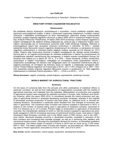Jan PAWLAK Instytut Technologiczno-Przyrodniczy w Falentach, Oddział w Warszawie ŚWIATOWY RYNEK CIĄGNIKÓW ROLNICZYCH Streszczenie Na podstawie danych liczbowych, pochodzących z roczników i innych publikacji urzędów statystycznych poszczególnych krajów, a także z opracowań organizacji związanych z rynkiem maszyn rolniczych i materiałów pochodzących ze stron internetowych, dokonano analizy zróżnicowania produkcji i podaży krajowej ciągników rolniczych w latach 2000–2010 w wybranych krajach Europy, Azji, Ameryki Północnej i Południowej. W latach 2000–2010 produkcja i podaż krajowa ciągników w krajach rozwijających się objętych analizą zwiększała się, podczas gdy w większości krajów rozwiniętych utrzymywała się na wyrównanym poziomie bądź miała tendencję malejącą. Wahania w poszczególnych latach były wywołane zmianami koniunktury w rolnictwie. W 2010 r. wartość wskaźnika liczby fabrycznie nowych ciągników dostarczanych do rolnictwa, w odniesieniu do liczby ciągników użytkowanych w rolnictwie krajów objętych analizą, wynosiła od 5,6 (Grecja) do 131,3 (Indie). Obecny etap motoryzacji rolnictwa w krajach rozwijających się, którego cechą charakterystyczną jest to, że ciągniki przychodzące do rolnictwa praktycznie w całości są przeznaczane na powiększanie zasobów mechanicznej siły pociągowej, w krajach wysoko rozwiniętych Europy Zachodniej miał miejsce już w latach 50. XX w., a w USA – nawet wcześniej. Zmiany strukturalne, zachodzące w krajach rozwiniętych, polegające na zmniejszaniu liczby gospodarstw rolnych i zwiększaniu przeciętnego ich obszaru oraz osiągnięcie stanu ich nasycenia mechaniczną siłą pociągową powodują, że zmniejsza się ilościowy popyt na ciągniki, a zwiększają wymagania jakościowe. Podaż krajowa ciągników we Francji była w 2010 r. aż o 71,6% mniejsza niż w 1957 r. Wartość wskaźnika podaży krajowej ciągników fabrycznie nowych w przeliczeniu na 1000 ciągników użytkowanych w rolnictwie Francji wynosiła w 1957 r. – 215,8, a w 2010 r. – 27,6. Słowa kluczowe: ciągnik, produkcja, podaż krajowa, wyposażenie, tendencja rozwoju WORLD MARKET OF AGRICULTURAL TRACTORS Summary On the basis of numerical data from the annuals and other publications of statistical offices in particular countries, as well as from elaborations of organizations connected with the market of agricultural machines and materials from the websites, differentiation of production and supplies of agricultural tractors were analysed for selected countries in Europe, Asia, Northern and Southern America, within the years 2000–2010. In considered decade the inland production and supplies of agricultural tractors in analysed developing countries increased, whereas in the majority of developed countries production of tractors was kept either, on stabilized level, or showed decreasing tendency. Fluctuations in particular years resulted from the changes of economic situation in agriculture. The numerical index of brand new tractors supplied to agriculture in 2010, in relation to the number of tractors being used in agriculture of analysed countries, amounted to from 5.6 (Greece) up to 131.3 (India). Present stage of motorization in agriculture of developing countries, the characteristic attribute of which is, that the tractors supplied to agriculture are practically assigned in total for increasing resources of mechanical tractive power, took place in highly developed West European countries, just in the fiftieth years of 20th century, and in the USA – even earlier. Structural changes occurring in developed countries, consisted in reduction of the farm numbers and increasing their average acreage, as well as in achieving their satiation with mechanical tractive power, decrease the quantitative demand for tractors, at intensified qualitative requirements. The inland supply of tractors in France in 2010 was as much as by 71.6% lower, than in 1957. The inland supply index of brand new tractors, as accounted per 1000 tractors being used in French agriculture, amounted to 215.8 in 1957, and 27.6 in 2010. Key words: tractor, production, inland supply, equipment, development tendency