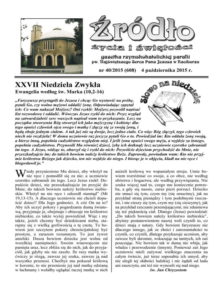 gazetka rzymskokatolickiej parafii pw. Najświętszego Serca Pana Jezusa w Raciborzu nr 40/2015 (608) 4 października 2015 r. XXVII Niedziela Zwykła Ewangelia według św. Marka (10,2-16) „Faryzeusze przystąpili do Jezusa i chcąc Go wystawić na próbę, pytali Go, czy wolno męŜowi oddalić Ŝonę. Odpowiadając zapytał ich: Co wam nakazał MojŜesz? Oni rzekli: MojŜesz pozwolił napisać list rozwodowy i oddalić. Wówczas Jezus rzekł do nich: Przez wzgląd na zatwardziałość serc waszych napisał wam to przykazanie. Lecz na początku stworzenia Bóg stworzył ich jako męŜczyznę i kobietę: dlatego opuści człowiek ojca swego i matkę i złączy się ze swoją Ŝoną, i będą oboje jednym ciałem. A tak juŜ nie są dwoje, lecz jedno ciało. Co więc Bóg złączył, tego człowiek niech nie rozdziela! W domu uczniowie raz jeszcze pytali Go o to. Powiedział im: Kto oddala Ŝonę swoją, a bierze inną, popełnia cudzołóstwo względem niej. I jeśli Ŝona opuści swego męŜa, a wyjdzie za innego, popełnia cudzołóstwo. Przynosili Mu równieŜ dzieci, Ŝeby ich dotknął; lecz uczniowie szorstko zabraniali im tego. A Jezus, widząc to, oburzył się i rzekł do nich: Pozwólcie dzieciom przychodzić do Mnie, nie przeszkadzajcie im; do takich bowiem naleŜy królestwo BoŜe. Zaprawdę, powiadam wam: Kto nie przyjmie królestwa BoŜego jak dziecko, ten nie wejdzie do niego. I biorąc je w objęcia, kładł na nie ręce i błogosławił je.” W tedy przyniesiono Mu dzieci, aby włoŜył na nie ręce i pomodlił się za nie; a uczniowie szorstko zabraniali im tego. Lecz Jezus rzekł: Dopuśćcie dzieci, nie przeszkadzajcie im przyjść do Mnie; do takich bowiem naleŜy królestwo niebieskie. WłoŜył na nie ręce i odszedł stamtąd” (Mt 19,13-15). A dlaczego uczniowie nie chcieli dopuścić dzieci? Dla Jego godności. A cóŜ On na to? Aby ich uczyć pokory i pogardzania dumą światową, przyjmuje je, obejmuje i obiecuje im królestwo niebieskie, co takŜe wyŜej powiedział. Więc i my takŜe, jeŜeli chcemy być dziedzicami nieba, starajmy się z wielką gorliwością o tę cnotę. To bowiem jest szczytem pokory chrześcijańskiej być prostym, a zarazem rozumnym. To jest Ŝywot anielski. Dusza bowiem dziecka jest wolna od wszelkiej namiętności. Swoim winowajcom nie pamięta uraz, lecz zbliŜa się do nich, jak do przyjaciół, jak gdyby nic nie zaszło. Ile razy matka wyćwiczy je rózgą, zawsze jej szuka, zawsze ją nad wszystko przenosi. Choćbyś mu pokazał królową w koronie, to nie przeniesie jej nad matkę odzianą w łachmany i wolałby oglądać raczej matkę w nich aniŜeli królową we wspaniałym stroju. Umie bowiem rozróŜniać co swoje, a co obce, nie według ubóstwa i bogactwa, ale według przywiązania. Nie szuka więcej nad to, czego mu koniecznie potrzeba, a gdy się nassie, zaraz pierś porzuci. Dziecko nie smuci się tym, czym my (się smucimy), jak na przykład stratą pieniędzy i tym podobnymi rzeczami, i nie cieszy się tym, czym my (się cieszymy), jak na przykład rzeczami przemijającymi; nie zdumiewa się teŜ pięknością ciał. Dlatego (Jezus) powiedział: „Do takich bowiem naleŜy królestwo niebieskie”, abyśmy postanowieniem naszej woli czynili to, co dzieci mają z natury. Gdy bowiem faryzeusze nie dlaczego innego, jak ze złości i zarozumiałości to czynili, co czynili, dlatego przykazuje uczniom, aby zawsze byli skromni, wskazując na tamtych, ich zaś pouczając. Nic bowiem tak w dumę nie wbija, jak władza i przewodzenie (innym). PoniewaŜ zaś Jego uczniowie mieli zaŜywać wielkiego znaczenia na całym świecie, juŜ teraz usposabia ich umysł, aby nie ulegli tej słabości ludzkiej i nie Ŝądali od ludu ani zaszczytu, ani teŜ nie wynosili się nad niego. św. Jan Chryzostom 2 Źródło - gazetka Poniedziałek – 5 października 2015 – św. Faustyny Kowalskiej, dziewicy Łk 10,25-37 630 Za † Marię Cieślik, †† z pokrewieństwa i dusze w czyśćcu cierpiące 700 Za †† rodziców Rut i Tadeusza Mizioch, dziadków z obu stron i dusze w czyśćcu cierpiące o dar Ŝycia wiecznego 1800 1. Za † mamę Eugenię z okazji urodzin i za † ojca Antoniego 2. Do Miłosierdzia BoŜego za †† Katarzynę Kukuczka, Tadeusza Kukuczka, Huberta Cyranek, Stanisława Poznańskiego oraz za †† z rodzin z obu stron NaboŜeństwo róŜańcowe o dobre przeŜycie Jubileuszu Roku Miłosierdzia Wtorek – 6 października 2015 Łk 10,38-42 630 Za † Jerzego Nowak (od lokatorów z ulicy Polnej 6) 800 W języku niemieckim: Für † Anton Sollich Do BoŜej Opatrzności i Anioła StróŜa w intencji wnuka Jakuba z prośbą o zdrowie i BoŜe 900 błogosławieństwo dla całej rodziny Skwareckich 1800 1. Za † Ŝonę i mamę Paulinę Nawrat w 2. rocznicę śmierci 2. Za † ojca Józefa w dniu urodzin, †† dziadków Machowskich i Koczy, całe †† pokrewieństwo i dusze w czyśćcu cierpiące NaboŜeństwo róŜańcowe w intencji naszych rodzin Środa – 7 października 2015 – NMP RóŜańcowej Łk 11,1-4 630 Za †† rodziców Teodora i Antoninę Libowskich, braci Leona i Zygfryda, Gertrudę Iskra i dusze w czyśćcu cierpiące 700 Za † Henryka Cibis (od rodziny Pacułtów z Wadowic) 1715 NaboŜeństwo róŜańcowe o pokój na Bliskim Wschodzie 1800 1. Za †† Ŝonę Marię i syna Piotra Zuber oraz pokrewieństwo z rodziny Zuber i Matuszek 2. Za † męŜa Franciszka Schulz w 15. rocznicę śmierci, †† rodziców i pokrewieństwo z obu stron oraz † ks. Proboszcza Alojzego Jurczyka Czwartek – 8 października 2015 Łk 11,5-13 630 Za † Eryka Chmel (od sąsiadów z ulicy Pomnikowej 26) 700 Do BoŜej Opatrzności w intencji Janiny Błaszczyk z okazji 80. rocznicy urodzin z podziękowaniem za otrzymane łaski, z prośbą o BoŜe błogosławieństwo i zdrowie dla Jubilatki i całej rodziny 1630 NaboŜeństwo róŜańcowe dla dzieci 1800 1. Do Miłosierdzia BoŜego za † męŜa Mariana Janczy w 3. roczn