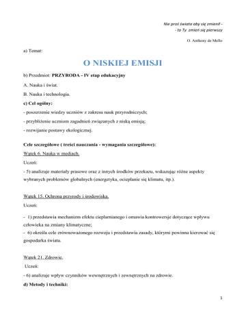 Nie proś świata aby się zmienił - to Ty zmień się pierwszy O. Anthony de Mello a) Temat: O NISKIEJ EMISJI b) Przedmiot: PRZYRODA - IV etap edukacyjny A. Nauka i świat. B. Nauka i technologia. c) Cel ogólny: - poszerzenie wiedzy uczniów z zakresu nauk przyrodniczych; - przybliżenie uczniom zagadnień związanych z niską emisją; - rozwijanie postawy ekologicznej. Cele szczegółowe ( treści nauczania - wymagania szczegółowe): Wątek 6. Nauka w mediach. Uczeń: - 5) analizuje materiały prasowe oraz z innych środków przekazu, wskazując różne aspekty wybranych problemów globalnych (energetyka, ocieplanie się klimatu, itp.). Wątek 15. Ochrona przyrody i środowiska. Uczeń: - 1) przedstawia mechanizm efektu cieplarnianego i omawia kontrowersje dotyczące wpływu człowieka na zmiany klimatyczne; - 6) określa cele zrównoważonego rozwoju i przedstawia zasady, którymi powinna kierować się gospodarka świata. Wątek 21. Zdrowie. Uczeń: - 6) analizuje wpływ czynników wewnętrznych i zewnętrznych na zdrowie. d) Metody i techniki: 1 - moderacja wizualna; - stoliki eksperckie; - praca z tekstem źródłowym i kartami pracy; - gra dydaktyczna; - projekcja filmu, - dyskusja z elementami burzy mózgów; - ranking. e) Szczegółowy przebieg lekcji: FAZA WSTĘPNA ( 10 minut) : Nauczyciel przy wejściu do klasy rozdaje uczniom karteczki przedstawiające różne przedmioty, umożliwiające podział na pięć zespołów. Uczniowie, którzy otrzymali karteczkę z rysunkiem tego samego przedmiotu tworzą jedną grupę i siadają razem ( załącznik nr 1). Ćwiczenie I - Prezentacja zdjęć. O czym będziemy rozmawiać ? Młodzież próbuje odgadnąć tematykę prezentowanego przez nauczyciela zdjęcia. Nauczyciel dla utrudnienia ćwiczenia pokazuje zdjęcia po przykryciu czarną kartką, w której zostały wycięte kółka, które pozwalają na identyfikację tylko wybranych jego fragmentów ( załącznik nr 2). Zespół, który najdokładniej opisze to, co przedstawia fotografia otrzymuje 1 punkt. Kolejnym zadaniem młodzieży jest ustalenie tematyki lekcji, grupa, która najbardziej precyzyjnie ją opisze otrzymuje 2 punkty. Nauczyciel wprowadza młodzież w problematykę lekcji i krótko omawia jej strukturę. FAZA REALIZACYJNA : Nauczyciel dzieli klasę na nowe pięć grup ( np. poprzez odliczenie do 5). Młodzież tworzy grupę ekspertów z zakresu tematyki zawartej w otrzymanym fragmencie tekstu źródłowego. Część I ( 15 minut) Uczenie się w grupach eksperckich Nauczyciel poleca uczniom zapoznanie się z otrzymanym tekstem źródłowym. Każdy zespół otrzymuje inną część artykułu p. Małgorzaty Masłowskiej - Bandosz do przestudiowania. 2 Zadaniem każdej grupy jest podczas określonego czasu zapamiętać i zrozumieć jak najwięcej wiadomości z otrzymanego od nauczyciela fragmentu tekstu ( załącznik nr 3). Część II ( 20 minut) Uczenie się we współpracy w grupach Nauczyciel poleca zmianę składu grup, w ten sposób, aby w każdej grupie był jeden ekspert z danego tematu. Uczniowie w nowych grupach dzielą się wiadomościami, które uzyskali w pierwszej części lekcji. Każdy uczeń wyjaśnia pozostałym zagadnienie, z którego ,,jest ekspertem''. Uczniowie uczą się od siebie nawzajem, wymieniają poglądy i informacje. Część III ( 10 minut) Samoocena Nauczyciel rozwiązuje grupy eksperckie i poleca uczniom powrót do grup, które utworzyli po wejściu do klasy. Zadaniem uczniów pracujących w zespołach jest jak ułożenie domina otrzymanego od nauczyciela. Grupa, która wykonana zadanie najszybciej otrzymuje 10 punktów ( załącznik nr 4) . Omówienie - Nauczyciel podsumowuje pracę na tej części zajęć i uczniom tworzącym najbardziej aktywny zespół, który uzyskał w trakcie lekcji najwięcej punktów wystawia oceny bardzo dobre za pracę na lekcji. Część IV ( 15 minut) Kalkulator Zadaniem uczniów, pracujących w tych samych zespołach jest ustalenie parametrów spalania przedmiotów których rysunki otrzymali przy podziale na grupy w fazie wstępnej lekcji i wypełnienie kart pracy ( załącznik nr 5) . Po wykonaniu ćwiczenia nauczyciel weryfikuje jego poprawność poprzez wykorzystanie animacji dostępnych na stronie internetowej akcji (słowa.. - Abrys). Nauczyciel podsumowując tą część zajęć prezentuje film pokazujący, jak może wyglądać życie mieszkańców miasteczka, w którym powietrze zanieczyszczone jest tak mocno, że aby przeżyć należy nosić specjalne kombinezony ochronne ( Nie musi tak być… | Walczmy razem o czyste powietrze). 3 FAZA PODSUMOWUJĄCA ( 20 minut): Nauczyciel inicjuje dyskusję nt. świadomości społecznej problemu, następnie rozdaje kartki samoprzylepne i poleca uczniom zapisanie wszystkich pomysłów dotyczących działań jakie mogą podjąć w szkole i w najbliższej okolicy na rzecz zwiększenia świadomości społecznej w zakresie zanieczyszczeń powietrza spowodowanych niską emisją. Młodzież przykleja kartki na tablicy. Wybrany uczeń odczytuje pomysły. Nauczyciel rozdaje uczniom po trzy kolorowe cenki za pomocą których decydują oni o wyborze najlepszych według nich pomysłów, które maja szansę na realizację w szkole lub najbliższej okolicy. Zadanie domowe: Wybrane przez młodzież działanie powinno być zobowiązaniem dla całej społeczności szkolnej i zostać zrealizowane przy wsparciu grona pedagogicznego, rodziców i pracowników szkoły. f) Środki dydaktyczne: - karteczki do podziału na grupy ( można wykorzystać obrazki ze strony internetowej akcji słowa.. Abrys) - załącznik nr 1; - zdjęcia wprowadzające w tematykę lekcji ( można wykorzystać zdjęcia ze strony internetowej Niska emisja – niska świadomość | Walczmy razem o czyste powietrze - załącznik nr 2; - nieprzezroczysta kartka z wyciętymi kilkoma kółkami o różnych średnicach- załącznik nr 2; - teksty źródłowe dla grup ( artykuł p. Małgorzaty Masłowskiej -Bandosz Nisk