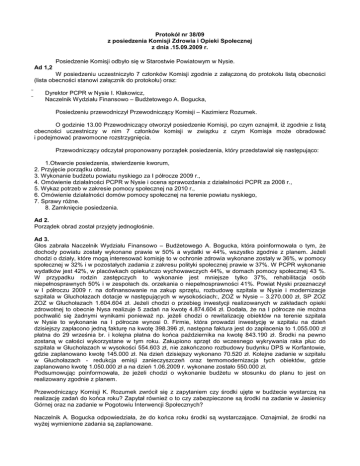 Protokół nr 38/09 z posiedzenia Komisji Zdrowia i Opieki Społecznej z dnia .15.09.2009 r. Posiedzenie Komisji odbyło się w Starostwie Powiatowym w Nysie. Ad 1,2 W posiedzeniu uczestniczyło 7 członków Komisji zgodnie z załączoną do protokołu listą obecności (lista obecności stanowi załącznik do protokołu) oraz: Dyrektor PCPR w Nysie I. Kłakowicz, Naczelnik Wydziału Finansowo – BudŜetowego A. Bogucka, Posiedzeniu przewodniczył Przewodniczący Komisji – Kazimierz Rozumek. O godzinie 13.00 Przewodniczący otworzył posiedzenie Komisji, po czym oznajmił, iŜ zgodnie z listą obecności uczestniczy w nim 7 członków komisji w związku z czym Komisja moŜe obradować i podejmować prawomocne rozstrzygnięcia. Przewodniczący odczytał proponowany porządek posiedzenia, który przedstawiał się następująco: 1.Otwarcie posiedzenia, stwierdzenie kworum, 2. Przyjęcie porządku obrad, 3. Wykonanie budŜetu powiatu nyskiego za I półrocze 2009 r., 4. Omówienie działalności PCPR w Nysie i ocena sprawozdania z działalności PCPR za 2008 r., 5. Wykaz potrzeb w zakresie pomocy społecznej na 2010 r., 6. Omówienie działalności domów pomocy społecznej na terenie powiatu nyskiego, 7. Sprawy róŜne. 8. Zamknięcie posiedzenia. Ad 2. Porządek obrad został przyjęty jednogłośnie. Ad 3. Głos zabrała Naczelnik Wydziału Finansowo – BudŜetowego A. Bogucka, która poinformowała o tym, Ŝe dochody powiatu zostały wykonane prawie w 50% a wydatki w 44%, wszystko zgodnie z planem. JeŜeli chodzi o działy, które mogą interesować komisję to w ochronie zdrowia wykonane zostały w 36%, w pomocy społecznej w 32% i w pozostałych zadania z zakresu polityki społecznej prawie w 37%. W PCPR wykonanie wydatków jest 42%, w placówkach opiekuńczo wychowawczych 44%, w domach pomocy społecznej 43 %. W przypadku rodzin zastępczych to wykonanie jest mniejsze tylko 37%, rehabilitacja osób niepełnosprawnych 50% i w zespołach ds. orzekania o niepełnosprawności 41%. Powiat Nyski przeznaczył w I półroczu 2009 r. na dofinansowanie na zakup sprzętu, rozbudowę szpitala w Nysie i modernizacje szpitala w Głuchołazach dotacje w następujących w wysokościach:, ZOZ w Nysie – 3.270.000 zł, SP ZOZ ZOZ w Głuchołazach 1.604.604 zł. JeŜeli chodzi o przebieg inwestycji realizowanych w zakładach opieki zdrowotnej to obecnie Nysa realizuje 5 zadań na kwotę 4.874.604 zł. Dodała, Ŝe na I półrocze nie moŜna pochwalić się Ŝadnymi wynikami poniewaŜ np. jeŜeli chodzi o rewitalizację obiektów na terenie szpitala w Nysie to wykonanie na I półrocze wynosi 0. Firmie, która prowadzi inwestycję w szpitalu na dzień dzisiejszy zapłacono jedną fakturę na kwotę 398.396 zł, następna faktura jest do zapłacenia to 1.055.000 zł płatna do 29 września br. i kolejna płatna do końca października na kwotę 843.190 zł. Środki na pewno zostaną w całości wykorzystane w tym roku. Zakupiono sprzęt do wczesnego wykrywania raka płuc do szpitala w Głuchołazach w wysokości 554.603 zł, nie zakończono rozbudowy budynku DPS w Korfantowie, gdzie zaplanowano kwotę 145.000 zł. Na dzień dzisiejszy wykonano 70.520 zł. Kolejne zadanie w szpitalu w Głuchołazach - redukcja emisji zanieczyszczeń oraz termomodernizacja tych obiektów, gdzie zaplanowano kwotę 1.050.000 zł a na dzień 1.06.2009 r. wykonane zostało 550.000 zł. Podsumowując poinformowała, Ŝe jeŜeli chodzi o wykonanie budŜetu w stosunku do planu to jest on realizowany zgodnie z planem. Przewodniczący Komisji K. Rozumek zwrócił się z zapytaniem czy środki ujęte w budŜecie wystarczą na realizację zadań do końca roku? Zapytał równieŜ o to czy zabezpieczone są środki na zadanie w Jasienicy Górnej oraz na zadanie w Pogotowiu Interwencji Społecznych? Naczelnik A. Bogucka odpowiedziała, Ŝe do końca roku środki są wystarczające. Oznajmiał, Ŝe środki na wyŜej wymienione zadania są zaplanowane. Radny Z. Majka przypomniał o tym, Ŝe zgodnie z sugestiami na poprzednim posiedzeniu komisja planowano powrócić do tematu dot. adaptacji obiektu w Jasienicy Górnej. Przewodniczący Komisji K. Rozumek oznajmił, Ŝe najlepszym rozwiązaniem byłoby aby Prewentorium, które juŜ zostało sprzedane było zaadaptowane na Dom Dziecka i Pogotowie Interwencji Społecznych. Członek Zarządu J. Dunaj poinformował o tym, Ŝe pierwszy kosztorys na adaptację budynku w Jasienicy opiewał na kwotę 1.080.000 zł z czym się nie zgodzono. Kolejny kosztorys po sprawdzeniu co jest konieczne do zrobienia a co jest w dobrym stanie i nie ma potrzeby aby remontować opiewał na kwotę około 500.000 zł łącznie z wyposaŜeniem obiektu. Radny Z. Majka oznajmił, Ŝe po wizji lokalnej obiektu w Jasienicy Górnej moŜe stwierdzić, Ŝe koszt adaptacji będzie bardzo duŜy. NaleŜy wziąć równieŜ pod uwagę fakt dot. przeznaczenia oraz przepisy europejskie i standaryzacje i wtedy naleŜałoby się zastanowić nad tym czy wykonać to zadanie. Dyrektor PCPR I. Kłakowicz poinformowała, Ŝe członkowie Zarządu równieŜ podchodzili ostroŜnie do przedmiotowego tematu, natomiast o ten obiekt sama zabiegała poniewaŜ obecna sytuacja jest bardzo niekomfortowa z powodu duŜej ilości dzieci. W związku z tym, Ŝe ma nastąpić zmiana przepisów, dotycząca nakładania się rodzinnych domów dziecka a z tego obiektu jest moŜliwość utworzenia dwóch domów dziecka. Dodała, Ŝe jest 14 czy 15 dzieci oczekujących i na razie jest wszystko w porządku ale jeŜeli będzie postanowienie Sądu na umieszczenie dziecka w placówce opiekuńczo wychowawczej, co jest zadaniem własnym powiatu a nie zostanie umieszczone to odpowiedzialność spoczywa na Staroście. Faktem jest, Ŝe cała taka sytuacja jest kontrolowana na bieŜąco tzn. wysyłany jest w celu zbadania sytuacji dziecka pracownik socjalny raz występuje się do innych powiatów z prośbą o umieszczenie dziecka. Ponadto powiedziała, Ŝe budynek w