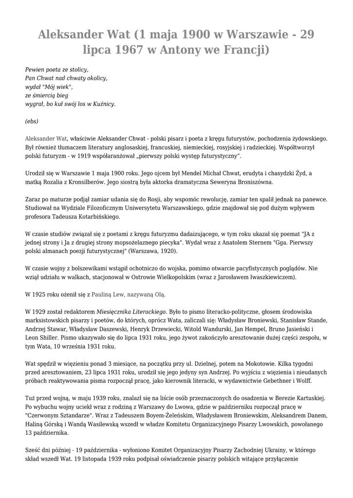 Aleksander Wat (1 maja 1900 w Warszawie - 29 lipca 1967 w Antony we Francji) Pewien poeta ze stolicy, Pan Chwat nad chwaty okolicy, wydał "Mój wiek", ze śmiercią bieg wygrał, bo kuł swój los w Kuźnicy. (ebs) Aleksander Wat, właściwie Aleksander Chwat - polski pisarz i poeta z kręgu futurystów, pochodzenia żydowskiego. Był również tłumaczem literatury anglosaskiej, francuskiej, niemieckiej, rosyjskiej i radzieckiej. Współtworzył polski futuryzm - w 1919 współaranżował „pierwszy polski występ futurystyczny”. Urodził się w Warszawie 1 maja 1900 roku. Jego ojcem był Mendel Michał Chwat, erudyta i chasydzki Żyd, a matką Rozalia z Kronsilberów. Jego siostrą była aktorka dramatyczna Seweryna Broniszówna. Zaraz po maturze podjął zamiar udania się do Rosji, aby wspomóc rewolucję, zamiar ten spalił jednak na panewce. Studiował na Wydziale Filozoficznym Uniwersytetu Warszawskiego, gdzie znajdował się pod dużym wpływem profesora Tadeusza Kotarbińskiego. W czasie studiów związał się z poetami z kręgu futuryzmu dadaizującego, w tym roku ukazał się poemat "JA z jednej strony i Ja z drugiej strony mopsożelaznego piecyka". Wydał wraz z Anatolem Sternem "Gga. Pierwszy polski almanach poezji futurystycznej" (Warszawa, 1920). W czasie wojny z bolszewikami wstąpił ochotniczo do wojska, pomimo otwarcie pacyfistycznych poglądów. Nie wziął udziału w walkach, stacjonował w Ostrowie Wielkopolskim (wraz z Jarosławem Iwaszkiewiczem). W 1925 roku ożenił się z Pauliną Lew, nazywaną Olą. W 1929 został redaktorem Miesięcznika Literackiego. Było to pismo literacko-polityczne, głosem środowiska marksistowskich pisarzy i poetów, do których, oprócz Wata, zaliczali się: Władysław Broniewski, Stanisław Stande, Andrzej Stawar, Władysław Daszewski, Henryk Drzewiecki, Witold Wandurski, Jan Hempel, Bruno Jasieński i Leon Shiller. Pismo ukazywało się do lipca 1931 roku, jego żywot zakończyło aresztowanie dużej części zespołu, w tym Wata, 10 września 1931 roku. Wat spędził w więzieniu ponad 3 miesiące, na początku przy ul. Dzielnej, potem na Mokotowie. Kilka tygodni przed aresztowaniem, 23 lipca 1931 roku, urodził się jego jedyny syn Andrzej. Po wyjściu z więzienia i nieudanych próbach reaktywowania pisma rozpoczął pracę, jako kierownik literacki, w wydawnictwie Gebethner i Wolff. Tuż przed wojną, w maju 1939 roku, znalazł się na liście osób przeznaczonych do osadzenia w Berezie Kartuskiej. Po wybuchu wojny uciekł wraz z rodziną z Warszawy do Lwowa, gdzie w październiku rozpoczął pracę w "Czerwonym Sztandarze". Wraz z Tadeuszem Boyem-Żeleńskim, Władysławem Broniewskim, Aleksandrem Danem, Haliną Górską i Wandą Wasilewską wszedł w władze Komitetu Organizacyjnego Pisarzy Lwowskich, powołanego 13 października. Sześć dni później - 19 października - wyłoniono Komitet Organizacyjny Pisarzy Zachodniej Ukrainy, w którego skład wszedł Wat. 19 listopada 1939 roku podpisał oświadczenie pisarzy polskich witające przyłączenie Zachodniej Ukrainy do Ukrainy Radzieckiej. W styczniu 1940 został aresztowany wraz z Władysławem Broniewskim, Tadeuszem Peiperem i Anatolem Sternem we Lwowie przez NKWD w zorganizowanej prowokacji. W więzieniu przebywał do 20 listopada 1941 roku. Więziono go we Lwowie, Kijowie, Łubiance i w Saratowie, następnie zesłano do Kazachstanu. W Ałma-Acie odnalazł żonę Paulinę (Olę) Watową i 9-letniego wówczas syna Andrzeja. Był następnie delegatem regionalnym Rządu RP, odmówił przyjęcia obywatelstwa radzieckiego. Do Polski wrócił w 1946 r., staraniem głównie Adama Ważyka. Pobyt na Łubiance wyleczył go z symaptii do komunizmu. W latach 1946-48 pracował jako redaktor naczelny Państwowego Instytutu Wydawniczego (PIW), od grudnia 1947 zasiadał w zarządzie polskiego PEN Clubu. Publikował w "Kuźnicy", "Odrodzeniu" i "Twórczości". W okresie stalinowskim zaprzestał aktywnej działalności literackiej, w 1953 roku zapadł na ciężką chorobę zespół opuszkowy Wallenberga, którą leczył w Szwecji i południowej Francji. W 1957 opublikował tom "Wiersze", za który otrzymał nagrodę "Nowej Kultury". Kolejny tom "Wiersze śródziemnomorskie" wydał już na Zachodzie. Kilkanaście miesięcy pracował we Włoszech jako redaktor polskiej serii w mediolańskim wydawnictwie Umberta Silvy. W latach 1961-63 przebywał we Francji, w Paryżu i Cabris. W 1964 roku objął posadę asystenta w Center for Slavic and East European Studies na Uniwersytecie Berkeley. Wtedy udzielił Czesławowi Miłoszowi serii biograficznych wywiadów, które ukazały się jako "Mój wiek". W następnym roku powrócił do Francji, w celach terapeutycznych wyjeżdżał na Majorkę. Przez cały ten okres nękały go ostre bóle głowy, z ich powodu 29 lipca 1967 roku popełnił samobójstwo poprzez przedawkowanie leków przeciwbólowych. Został pochowany na cmentarzu Les Champeaux w Montmorency. Stał się nieśmiertelny dzięki "Mojemu wiekowi". *** Żmije i ważki w dobrej zgodzie w naszym ogrodzie. Nędza i chwała w czułym objęciu przy wniebowzięciu. Głos oceanu, cisza pustyni uśpią mnie w skrzyni. I w kołysankę już przemieniony płacz mojej żony. Berkeley, luty 1965 *** Aleksander Wat, "Mój wiek. Pamiętnik mówiony" (wyd. Universitas, Kraków 2011): Determinujące było dojście do władzy Hitlera. To w ogóle był moment determinujący również w Rosji dla stalinizmu, bardzo istotny. I dla całego komunizmu. Dojście do władzy Hitlera przesądziło o późniejszej likwidacji polskiej partii i likwidacji starych kominternowskich działaczy, właśnie tych światopoglądowych, tych nie pragmatyków. I mam wrażenie, że pokolenie, które wyrosło na uniwersytetach i z walk uniwersyteckich, z bardzo konkretnych walk politycznych, manewrów politycznych z grupami faszystowskimi, było pokoleniem, które przyzwyczaiło się już wtedy jeść żaby, bo jak się jest 