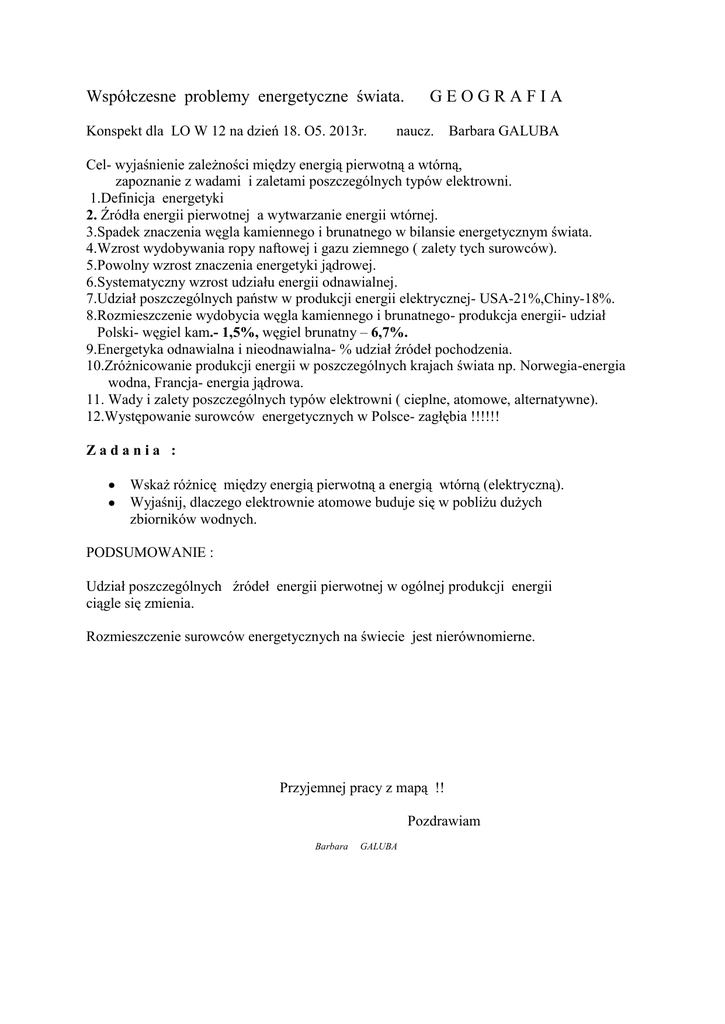 Współczesne problemy energetyczne świata. Konspekt dla LO W 12 na dzień 18. O5. 2013r. GEOGRAFIA naucz. Barbara GALUBA Cel- wyjaśnienie zależności między energią pierwotną a wtórną, zapoznanie z wadami i zaletami poszczególnych typów elektrowni. 1.Definicja energetyki 2. Źródła energii pierwotnej a wytwarzanie energii wtórnej. 3.Spadek znaczenia węgla kamiennego i brunatnego w bilansie energetycznym świata. 4.Wzrost wydobywania ropy naftowej i gazu ziemnego ( zalety tych surowców). 5.Powolny wzrost znaczenia energetyki jądrowej. 6.Systematyczny wzrost udziału energii odnawialnej. 7.Udział poszczególnych państw w produkcji energii elektrycznej- USA-21%,Chiny-18%. 8.Rozmieszczenie wydobycia węgla kamiennego i brunatnego- produkcja energii- udział Polski- węgiel kam.- 1,5%, węgiel brunatny – 6,7%. 9.Energetyka odnawialna i nieodnawialna- % udział źródeł pochodzenia. 10.Zróżnicowanie produkcji energii w poszczególnych krajach świata np. Norwegia-energia wodna, Francja- energia jądrowa. 11. Wady i zalety poszczególnych typów elektrowni ( cieplne, atomowe, alternatywne). 12.Występowanie surowców energetycznych w Polsce- zagłębia !!!!!! Zadania : Wskaż różnicę między energią pierwotną a energią wtórną (elektryczną). Wyjaśnij, dlaczego elektrownie atomowe buduje się w pobliżu dużych zbiorników wodnych. PODSUMOWANIE : Udział poszczególnych źródeł energii pierwotnej w ogólnej produkcji energii ciągle się zmienia. Rozmieszczenie surowców energetycznych na świecie jest nierównomierne. Przyjemnej pracy z mapą !! Pozdrawiam Barbara GALUBA