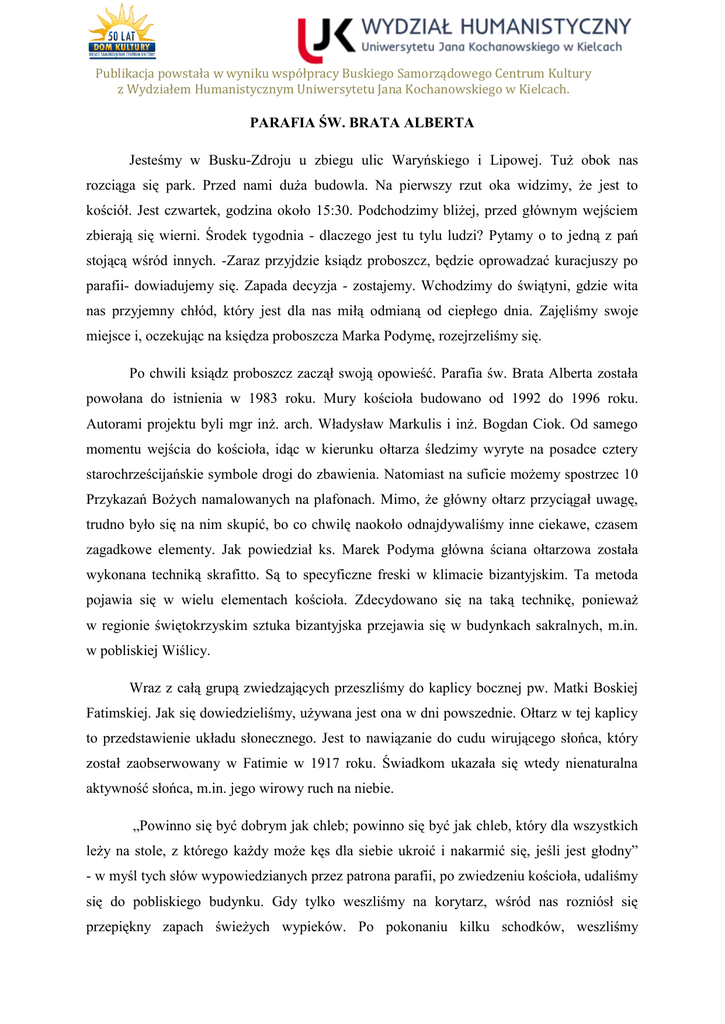 Publikacja powstała w wyniku współpracy Buskiego Samorządowego Centrum Kultury z Wydziałem Humanistycznym Uniwersytetu Jana Kochanowskiego w Kielcach. PARAFIA ŚW. BRATA ALBERTA Jesteśmy w Busku-Zdroju u zbiegu ulic Waryńskiego i Lipowej. Tuż obok nas rozciąga się park. Przed nami duża budowla. Na pierwszy rzut oka widzimy, że jest to kościół. Jest czwartek, godzina około 15:30. Podchodzimy bliżej, przed głównym wejściem zbierają się wierni. Środek tygodnia - dlaczego jest tu tylu ludzi? Pytamy o to jedną z pań stojącą wśród innych. -Zaraz przyjdzie ksiądz proboszcz, będzie oprowadzać kuracjuszy po parafii- dowiadujemy się. Zapada decyzja - zostajemy. Wchodzimy do świątyni, gdzie wita nas przyjemny chłód, który jest dla nas miłą odmianą od ciepłego dnia. Zajęliśmy swoje miejsce i, oczekując na księdza proboszcza Marka Podymę, rozejrzeliśmy się. Po chwili ksiądz proboszcz zaczął swoją opowieść. Parafia św. Brata Alberta została powołana do istnienia w 1983 roku. Mury kościoła budowano od 1992 do 1996 roku. Autorami projektu byli mgr inż. arch. Władysław Markulis i inż. Bogdan Ciok. Od samego momentu wejścia do kościoła, idąc w kierunku ołtarza śledzimy wyryte na posadce cztery starochrześcijańskie symbole drogi do zbawienia. Natomiast na suficie możemy spostrzec 10 Przykazań Bożych namalowanych na plafonach. Mimo, że główny ołtarz przyciągał uwagę, trudno było się na nim skupić, bo co chwilę naokoło odnajdywaliśmy inne ciekawe, czasem zagadkowe elementy. Jak powiedział ks. Marek Podyma główna ściana ołtarzowa została wykonana techniką skrafitto. Są to specyficzne freski w klimacie bizantyjskim. Ta metoda pojawia się w wielu elementach kościoła. Zdecydowano się na taką technikę, ponieważ w regionie świętokrzyskim sztuka bizantyjska przejawia się w budynkach sakralnych, m.in. w pobliskiej Wiślicy. Wraz z całą grupą zwiedzających przeszliśmy do kaplicy bocznej pw. Matki Boskiej Fatimskiej. Jak się dowiedzieliśmy, używana jest ona w dni powszednie. Ołtarz w tej kaplicy to przedstawienie układu słonecznego. Jest to nawiązanie do cudu wirującego słońca, który został zaobserwowany w Fatimie w 1917 roku. Świadkom ukazała się wtedy nienaturalna aktywność słońca, m.in. jego wirowy ruch na niebie. „Powinno się być dobrym jak chleb; powinno się być jak chleb, który dla wszystkich leży na stole, z którego każdy może kęs dla siebie ukroić i nakarmić się, jeśli jest głodny” - w myśl tych słów wypowiedzianych przez patrona parafii, po zwiedzeniu kościoła, udaliśmy się do pobliskiego budynku. Gdy tylko weszliśmy na korytarz, wśród nas rozniósł się przepiękny zapach świeżych wypieków. Po pokonaniu kilku schodków, weszliśmy Publikacja powstała w wyniku współpracy Buskiego Samorządowego Centrum Kultury z Wydziałem Humanistycznym Uniwersytetu Jana Kochanowskiego w Kielcach. do pomieszczenia z drewnianymi stołami i ławami, wypełnionego (zabytkowymi już) przyrządami do wyrobu chleba, przystrojonego gdzieniegdzie zbożem. Zapach pieczywa był teraz bardzo intensywny, ale przyjemny. "Piekarze Świętego Brata Alberta" to wspólnota, która dba o kultywowanie tradycji na terenie parafii. Pokazują oni zwiedzającym proces wyrobu ciasta oraz wypieku podpłomyków. Towarzyszą temu opowieści o historii i kulturze Ponidzia. W tej rozmowie nie brakuje również nawiązań do teraźniejszości, gdyż teren ten jest miejscem szybko rozwijającym się pod względem turystyki. Żywym przykładem na to stwierdzenie jest ilość osób uczestniczących w pokazie wypieku podpłomyków. Zwiedzanie kościoła to jedno, a uczestniczenie w projekcie „Od ziarenka do bochenka" - to druga, oryginalniejsza forma uczestnictwa w życiu parafii św. Brata Alberta w Busku-Zdroju. Dzięki tej inwestycji z 2010 roku i zakupu pieca chlebowego, każdy bezpłatnie może uczestniczyć w tym przedsięwzięciu, a następnie podzielić się z drugą osobą gorącym podpłomykiem, co z pewnością zbliża do siebie nieznanych sobie dotąd ludzi.