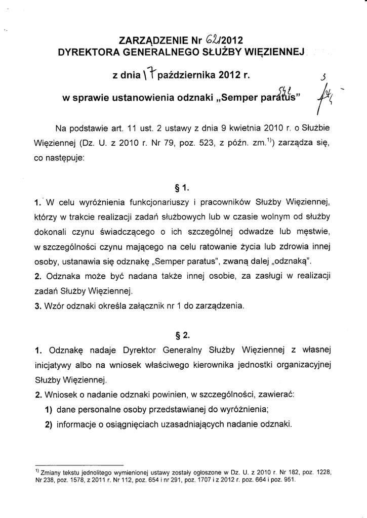 Zarządzenie nr 62/2012 Dyrektora Generalnego Służby Więziennej