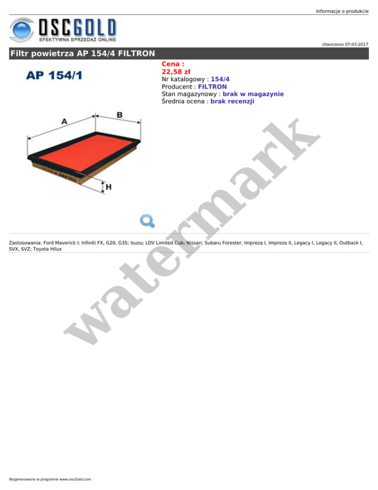 Informacje o produkcie Utworzono 07-03-2017 Filtr powietrza AP 154/4 FILTRON Cena : 22,58 zł er m ar k Nr katalogowy : 154/4 Producent : FILTRON Stan magazynowy : brak w magazynie Średnia ocena : brak recenzji w at Zastosowania: Ford Maverick I; Infiniti FX, G20, G35; Isuzu; LDV Limited Cub; Nissan; Subaru Forester, Impreza I, Impreza II, Legacy I, Legacy II, Outback I, SVX, SVZ; Toyota Hilux Wygenerowano w programie www.oscGold.com