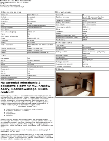 EchoDom Sp. z o.o. Biuro Nieruchomości Rynek Dębnicki 13/1, 30-319 Kraków tel. fax. e-mail:[email protected] www.nieruchomosci.echodom.pl Informacje ogólne Nieruchomość Oferta nr ECH-MS-9426 Standard 5 Rodzaj sprzedaż Opłaty w czynszu Lokalizacja Kraków prąd, CO, ochrona, fundusz remontowy, wywóz śmieci Dzielnica Krowodrza Opłaty wg liczników prąd Azory Rodzaj mieszkania jednopoziomowe Ulica Eliasza-Radzikowskiego Stan lokalu Do wprowadzenia Rodzaj budynku nowe budownictwo Mies. czynsz admin. 390,00 2 Okna nowe PCV 49.00 m² Instalacje nowa 3p Balkon jest 3 Powierzchnia działki [m2] 0.00 Cena 399000.00 PLN Powierzchnia użytkowa [m2] 49,00 Cena/m2 8142.86 Rok budowy 2009 Status aktualna Pomieszczenia Imię i nazwisko Alina Skalska tel. 0048-720-826638 Ilość pokoi 2 Podłogi pokoi drewniana Typ kuchni jasna z oknem Rodzaj kuchni aneks kuchenny - połączony z salonem Podłoga kuchni gres tak Typ łazienki nowa Widok na inne budynki Glazura łazienki nowego typu Gaz brak Podłoga łazienki gres miejska Wyposażenie łazienki wanna Otoczenie działki zabudowane Podłoga przedpokoi drewniana Ogrzewanie miejskie Zdjęcia Alarm nie Winda tak Usytuowanie dwustronne Drzwi antywłamaniowe nie Ilość kondygnacji 3 Rejon Ilość pokoi Pow. całkowita [m2] Piętro Ilość pięter w budynku Telefon komórkowy 0048-720-826-638 Telefon 0048-720-826-638 E-mail [email protected] Opis Plac zabaw Woda Na sprzedaż mieszkanie 2 pokojowe o pow 49 m2. Kraków Azory, Radzikowskiego. Blisko centrum! Prezentujemy państwu na sprzedaż mieszkanie znajdujące się na osiedlu bloków 3 piętrowych z 2009 r. Osiedle zadbane, bloki w bardzo dobrym stanie technicznym, klatki zabezpieczone domofonem. Osiedle ogrodzone, miejsca parkingowe ogólnodostępne dla mieszkańców. Mieszkanie usytuowane jest na ostatnim piętrze. Mieszkanie ma usytuowanie dwustronne, okna wychodzą na pł i wschód wiąże się z tym to że mieszkanie jest jasne. Mieszkanie składa się z: nowoczesnej kuchni wyposażonej w sprzęty Agd, 2 pokoi 1 dzienny 2 sypialnia, łazienki, przedpokoju , balkonu. Mieszkanie jest gotowe do zamieszkania, nie wymaga wkładu finansowego. Mieszkanie wykończone z wysokiej jakości materiałów. W przedpokoju mieści się duża, funkcjonalna, wbudowana ściana, w łazienkach i kuchni płytki Max-Fliz, podłogi w pokojach panele drewniane. Okna instalacje nowe, mieszkanie było zamieszkane od 2011 r. Koszty 390 zł ogrzewanie i woda miejska, osobno płatny prąd. W mieszkaniu nie ma gazu! Lokalizacja bardzo dobra kilka minut pieszą przystanek autobusowy dojazd na pętla tramwajowa Krowodrza górka, połączenie z każdą dzielnicą Krakowa. Nieopodal parki, sklepy, hipermarkety, eskapada Opolska, szkoły, przedszkola, uczelnie. Serdecznie polecam i zapraszam na prezentację nieruchomości! Więcej ofert na EchoDom.pl! BIURO NIERUCHOMOŚCI EchoDom Sp. z o.o.- szeroki wybór ofert. Kompleksowa obsługa przy sprzedaży, wynajmie nieruchomości. Atrakcyjne propozycje kredytowe, sporządzane wedle potrzeb Klientów. ZAPEWNIAMY PROFESJONALIZM I BEZPIECZEŃSTWO ZAWIERANYCH TRANSAKCJI! © Wszelkie prawa zastrzeżone - EchoDom