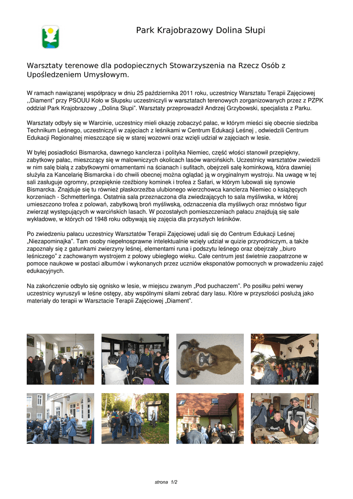 Park Krajobrazowy Dolina Słupi Warsztaty terenowe dla podopiecznych Stowarzyszenia na Rzecz Osób z Upośledzeniem Umysłowym. W ramach nawiązanej współpracy w dniu 25 października 2011 roku, uczestnicy Warsztatu Terapii Zajęciowej ,,Diament” przy PSOUU Koło w Słupsku uczestniczyli w warsztatach terenowych zorganizowanych przez z PZPK oddział Park Krajobrazowy ,,Dolina Słupi”. Warsztaty przeprowadził Andrzej Grzybowski, specjalista z Parku. Warsztaty odbyły się w Warcinie, uczestnicy mieli okazję zobaczyć pałac, w którym mieści się obecnie siedziba Technikum Leśnego, uczestniczyli w zajęciach z leśnikami w Centrum Edukacji Leśnej , odwiedzili Centrum Edukacji Regionalnej mieszczące się w starej wozowni oraz wzięli udział w zajęciach w lesie. W byłej posiadłości Bismarcka, dawnego kanclerza i polityka Niemiec, część włości stanowił przepiękny, zabytkowy pałac, mieszczący się w malowniczych okolicach lasów warcińskich. Uczestnicy warsztatów zwiedzili w nim salę białą z zabytkowymi ornamentami na ścianach i sufitach, obejrzeli salę kominkową, która dawniej służyła za Kancelarię Bismarcka i do chwili obecnej można oglądać ją w oryginalnym wystroju. Na uwagę w tej sali zasługuje ogromny, przepięknie rzeźbiony kominek i trofea z Safari, w którym lubowali się synowie Bismarcka. Znajduje się tu również płaskorzeźba ulubionego wierzchowca kanclerza Niemiec o książęcych korzeniach - Schmetterlinga. Ostatnia sala przeznaczona dla zwiedzających to sala myśliwska, w której umieszczono trofea z polowań, zabytkową broń myśliwską, odznaczenia dla myśliwych oraz mnóstwo figur zwierząt występujących w warcińskich lasach. W pozostałych pomieszczeniach pałacu znajdują się sale wykładowe, w których od 1948 roku odbywają się zajęcia dla przyszłych leśników. Po zwiedzeniu pałacu uczestnicy Warsztatów Terapii Zajęciowej udali się do Centrum Edukacji Leśnej „Niezapominajka”. Tam osoby niepełnosprawne intelektualnie wzięły udział w quizie przyrodniczym, a także zapoznały się z gatunkami zwierzyny leśnej, elementami runa i podszytu leśnego oraz obejrzały ,,biuro leśniczego” z zachowanym wystrojem z połowy ubiegłego wieku. Całe centrum jest świetnie zaopatrzone w pomoce naukowe w postaci albumów i wykonanych przez uczniów eksponatów pomocnych w prowadzeniu zajęć edukacyjnych. Na zakończenie odbyło się ognisko w lesie, w miejscu zwanym „Pod puchaczem”. Po posiłku pełni werwy uczestnicy wyruszyli w leśne ostępy, aby wspólnymi siłami zebrać dary lasu. Które w przyszłości posłużą jako materiały do terapii w Warsztacie Terapii Zajęciowej „Diament”. strona 1/2 strona 2/2 Powered by TCPDF (www.tcpdf.org)