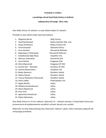 Protokół nr V/2011 z przebiegu obrad Sesji Rady Gminy w Gubinie odbytej dnia 24 lutego 2011 roku Stan Rady Gminy 15 radnych, w sesji udział wzięło 15 radnych. Ponadto w sesji udział wzięli zaproszeni goście: 1. Zbigniew Barski 2. Józef Bartkowiak 3. Alicja Antkiewicz 4. Anna Kowaluk 5. Jerzy Kwaśny 6. Bogusława Tulimowska 7. Kwiatkowska Bąk Alicja 8. Mariusz Jankowiak 9. Anna Piecha 10. Alina Maeciniak 11. Dorota Der – Rewiako 12. Joanna Nesterowicz 13. Beata Skowron 14. Halina Żaczek 15. Teresa Wojtowicz Pleszyniak 16. Daria Lidtke 17. Agata Bieńko 18. Elżbieta Smolenkiewicz 19. Maria Majchrzak 20. Piotr Eret 21. Agnieszka Kowalczuk 22. Edyta Zajkowska Wójt Gminy Radny Sejmiku Woj. Lub. Radca Prawny UG Skarbnik Gminy Kierownik Referatu Kierownik Referatu Inspektor UG Kierownik ZUK Księgowa ZUK Księgowa SP ZOZ Dyrektor SP ZOZ Inspektor UG Dyrektor Szkoły Dyrektor Szkoły Dyrektor Szkoły Podinspektor UG sołtys sołtys sołtys sołtys sołtys sołtys Stan Rady Gminy to 15-stu radnych, obecność 15 radnych sprawia, iż Sesja Rady Gminy jest prawomocna do podejmowania wszelkich uchwał, decyzji oraz ustaleń. Obecność na Sesji dokumentują listy obecności radnych i gości, które stanowią załącznik do niniejszego protokołu. Do punktu 1: O godzinie 10.35 Przewodniczący Rady Gminy pan Zbigniew Zygadło, dokonał otwarcia obrad Sesji Rady Gminy oraz powitał wszystkich obecnych radnych i zaproszonych gości. Stwierdził, iż przy obecności 15-stu radnych Sesja Rady Gminy jest w pełni prawomocna do podejmowania wszelkich uchwał, decyzji oraz ustaleń. Porządek obrad został przyjęty przez aklamację. Do punktu 2: W punkcie tym przedstawiono odpowiedzi na interpelacje radnych z poprzedniej IV sesji Rady Gminy. Odpowiedzi w imieniu pana Wójta Zbigniewa Barskiego udzielił pan Jerzy Kwaśny – Kierownik Ref. UG. Uwag do udzielonych odpowiedzi nie było, zostały one przyjęte do akceptującej wiadomości Rady Gminy. Do punktu 3: Interpelacje i zapytania radnych. 1. Radny Krzysztof Urban – zwrócił się o naprawę drogi przy przystanku PKS w Kosarzynie; 2. Radny Edward Szafrański – poprosił o interwencję w ENEA w sprawie uprzątnięcia gałęzi , pozostałych po przycięciu drzew w sąsiedztwie linii energetycznych; 3. Radna Mirosława Strzelbicka – interpelacja złożona na piśmie dotyczy naprawy drogi Witaszkowo – Kozów. 4. Radny Krzysztof Irisik – interpelacja złożona pisemnie dot. naprawienia usterek lamp ulicznych w miejscowości Czarnowice. 5. Radny Zbigniew Zygadło – wniósł o przedstawienie sprawozdania z działalności OPS , oraz informacji na temat złożonych wniosków unijnych przez OPS. Do punktu 4: Informacja Wójta o działaniach podejmowanych w okresie międzysesyjnym. Informacja została złożona w formie pisemnej i stanowi załącznik do niniejszego protokołu. Do punktu 5: Przedłożenie planu rzeczowo – finansowego SP ZOZ w Stargardzie Gubińskim. Materiały , przedstawiła pani Alina Marciniak Księgowa SP ZOZ, dokumentacja została wcześniej zaakceptowana bez uwag przez Komisję Zdrowia Rady Gminy. Do punktu 6: Przedłożenie planu rzeczowo – finansowego Gminnego Programu Profilaktyki i Rozwiązywania Problemów Alkoholowych oraz Gminnego Programu Profilaktyki Narkomanii na rok 2011. Informacja została przedłożona Radzie, przez panią Jadwigę Kobierecką inspektora Koordynatora , zgodnie z materiałami , które Radni otrzymali wcześniej. Rada Gminy przyjęła wyjaśnienia bez uwag. Do punktu 7: Podjęcie uchwały w sprawie budżetu Gminy Gubin na rok 2011. a. Przedstawienie opinii Regionalnej Izby Obrachunkowej o projekcie uchwały budżetowej; Opinię składu orzekającego Regionalnej Izby Obrachunkowej z dnia 26 stycznia 2011 roku przedstawiła pani Anna Kowaluk Skarbnik Gminy. Opinia została dołączona do niniejszego protokołu jako załącznik. b. Przedstawienie opinii i wniosków Komisji Rady Gminy. • Komisja Zdrowia – opinia pozytywna, złożona przez Przewodniczącego Komisji radnego Krzysztofa Irisika w formie pisemnej do protokołu. • Komisja Budżetu – opinia pozytywna, została złożona przez Przewodniczącego Komisji radnego Szymona Naglika w formie pisemnej do protokołu; • Komisja Rolnictwa- Przewodniczący Komisji pan Remigiusz Darmach , przedstawił pozytywną opinię Komisji ze wskazaniem, aby zarząd Gminy szukał rozwiązań , które mogłyby skutkować oszczędnościami np. poprzez prywatyzację ZUK oraz reformę oświaty. Należy podjąć działania aby poprawić relację pomiędzy wydatkami a przychodami , bo inaczej za rok lub dwa znajdziemy się w tragicznej sytuacji. Proszę także radnych aby przy składaniu interpelacji kładli większy nacisk na pomysły jak poprawić sytuację finansową gminy a mniejszy na roszczenia. c. Przedstawienie stanowiska Wójta Gminy do opinii i wniosków poszczególnych Komisji. Wójt Zbigniew Barski w swoim wystąpieniu wyjaśnił , iż nie zgadza się ze stanowiskiem Rady w sprawie Orlika, zaproponował aby zrezygnować z realizacji wszelkich innych inwestycji a zrealizować właśnie Orlika. d. Dyskusja. 1. Radny Szymon Naglik – radni stoją na stanowisku , aby w ogóle maksymalnie ograniczyć wydatki majątkowe. Ze względu na fakt, iż nie mamy odpowiednich dochodów ani zdolności kredytowej powinniśmy oszczędzać. Jeśli chodzi o Orlika, to nie mamy teraz możliwości zajęcia się tym projektem, są rzeczy ważniejsze jeśli chodzi o przyszłość gminy; 2. Radny Edward Szafrański – popieram Wójta w dążeniu do budowy Orlika; 3. Radny Stanisław Fudyma – popieram pozyskiwanie srodków unijnych , ale przy stanie finansów gminy często jest to po prostu mało realne; 4. Radny Remigiusz Darmach – oczywiście zgadzam się z poglądem , że lepiej robić inwestycje , które potem są refinansowane, ale droga jest taka , ze w pierwszej kolejności należy zabezpieczyć środki na projekt, potem zrealizować inwestycję a z