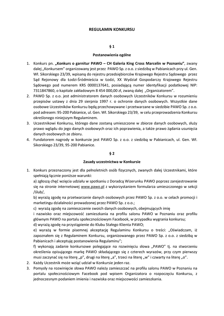 REGULAMIN KONKURSU §1 Postanowienia ogólne 1. Konkurs pn. „Konkurs o garnitur PAWO – CH Galeria King Cross Marcelin w Poznaniu”, zwany dalej „Konkursem” organizowany jest przez PAWO Sp. z o.o. z siedzibą w Pabianicach przy ul. Gen. Wł. Sikorskiego 23/39, wpisaną do rejestru przedsiębiorców Krajowego Rejestru Sądowego przez Sąd Rejonowy dla Łodzi-Śródmieścia w Łodzi, XX Wydział Gospodarczy Krajowego Rejestru Sądowego pod numerem KRS 0000137641, posiadającą numer identyfikacji podatkowej NIP: 7311847860, o kapitale zakładowym 8 454 000,00 zł, zwaną dalej „Organizatorem”. 2. PAWO Sp. z o.o. jest administratorem danych osobowych Uczestników Konkursu w rozumieniu przepisów ustawy z dnia 29 sierpnia 1997 r. o ochronie danych osobowych. Wszystkie dane osobowe Uczestników Konkursu będą przechowywane i przetwarzane w siedzibie PAWO Sp. z o.o. pod adresem: 95-200 Pabianice, ul. Gen. Wł. Sikorskiego 23/39, w celu przeprowadzenia Konkursu określonego niniejszym Regulaminem. 3. Uczestnikowi Konkursu, którego dane zostaną umieszczone w zbiorze danych osobowych, służy prawo wglądu do jego danych osobowych oraz ich poprawienia, a także prawo żądania usunięcia danych osobowych ze zbioru. 4. Fundatorem nagrody w konkursie jest PAWO Sp. z o.o. z siedzibą w Pabianicach, ul. Gen. Wł. Sikorskiego 23/39, 95-200 Pabianice. §2 Zasady uczestnictwa w Konkursie 1. Konkurs przeznaczony jest dla pełnoletnich osób fizycznych, zwanych dalej Uczestnikami, które spełniają łącznie poniższe warunki: a) zgłoszą chęć wzięcia udziału w spotkaniu z Doradcą Wizerunku PAWO poprzez zarejestrowanie się na stronie internetowej www.pawo.pl z wykorzystaniem formularza umieszczonego w sekcji /ślub/, b) wyrażą zgodę na przetwarzanie danych osobowych przez PAWO Sp. z o.o. w celach promocji i marketingu działalności prowadzonej przez PAWO Sp. z o.o.; c) wyrażą zgodę na zamieszczenie swoich danych osobowych, obejmujących imię i nazwisko oraz miejscowość zamieszkania na profilu salonu PAWO w Poznaniu oraz profilu głównym PAWO na portalu społecznościowym Facebook, w przypadku wygrania konkursu; d) wyrażą zgodę na przystąpienie do Klubu Stałego Klienta PAWO; e) wyrażą w formie pisemnej akceptację Regulaminu Konkursu o treści: „Oświadczam, iż zapoznałem się z Regulaminem Konkursu, organizowanego przez PAWO Sp. z o.o. z siedzibą w Pabianicach i akceptuję postanowienia Regulaminu”; f) wykonają zadanie konkursowe polegające na rozwinięciu słowa „PAWO” tj. na stworzeniu określenia opisującego markę PAWO składającego się z czterech wyrazów, przy czym pierwszy musi zaczynać się na literę „p”, drugi na literę „a”, trzeci na literę „w” i czwarty na literę „o”. 2. Każdy Uczestnik może wziąć udział w Konkursie jeden raz. 3. Pomysły na rozwinięcie słowa PAWO należy zamieszczać na profilu salonu PAWO w Poznaniu na portalu społecznościowym Facebook pod wpisem Organizatora o rozpoczęciu Konkursu, z jednoczesnym podaniem imienia i nazwiska oraz miejscowości zamieszkania. 4. W Konkursie nie mogą brać udziału osoby będące pracownikami PAWO Sp. z o.o. oraz członkowie ich najbliższej rodziny (małżonkowie, wstępni, zstępni i rodzeństwo). Osoby takie zostaną pominięte w przyznawaniu nagród. 5. Organizator zastrzega sobie możliwość wykluczenia Uczestnika, w stosunku, do którego powziął on podejrzenie, że działa on w sposób sprzeczny z zasadami Konkursu opisanymi w niniejszym Regulaminie albo w sposób sprzeczny z prawem. §3 Czas trwania konkursu 1. Konkurs trwa od 24.02.2015 do 02 kwietnia 2015. §4 Nagrody i zasady ich przyznania 1. Zwycięzcę Konkursu, spośród Uczestników, którzy spełnili łącznie warunki wskazane w § 2 ust. 1 niniejszego Regulaminu, wyłania Komisja Konkursowa. Zwycięzcą zostaje osoba, której rozwinięcie słowa PAWO zostanie najwyżej ocenione przez Komisję Konkursową. 2. Nagrodą w Konkursie jest jeden garnitur marki PAWO model z linii Between lub Respect o wartości 750,00 zł brutto (słownie: siedemset pięćdziesiąt złotych, 00/100). 3. Zwycięzca ma prawo wyłącznie do jednej nagrody. 4. Pula nagród w Konkursie jest zamknięta. 5. Nagroda, z chwilą jej przekazania, nie podlega opodatkowaniu na zasadach określonych w art. 30 ust. 1 pkt 2 ustawy o podatku dochodowym od osób fizycznych, ponieważ jednorazowa wartość wygranej nie przekracza kwoty 760 zł, która zgodnie z treścią przepisu art. 21 ust. 1 pkt 68 ustawy o podatku dochodowym od osób fizycznych stanowi wartość wolną od opodatkowania podatkiem dochodowym w przypadku wygranych w konkursach. §5 Rozstrzygnięcie konkursu 1. 2. 3. Rozstrzygnięcie Konkursu nastąpi 15 kwietnia 2015. Informacja o Zwycięzcy Konkursu, który nabył prawo do nagrody opisanej w § 4 pkt 2 regulaminu, zawierająca wyłącznie imię i nazwisko, zostanie zamieszczona na portalu społecznościowym Facebook na profilu salonu PAWO w Poznaniu oraz głównym profilu PAWO. Nagroda zostanie wręczona w terminie 2 tygodni od dnia rozstrzygnięcia konkursu. Przyznawana Nagroda nie podlega zamianie na jej równowartość pieniężną, jak i przekazaniu przez zwycięzcę Konkursu na rzecz osób trzecich przed odbiorem nagrody. §6 Odpowiedzialność organizatora 1. Organizator nie ponosi odpowiedzialności za niemożność odbioru Nagrody z przyczyn leżących po stronie wyłonionego zwycięzcy. 2. Organizator nie ponosi odpowiedzialności za jakiekolwiek zdarzenia losowe uniemożliwiające zwycięzcy odbiór nagrody. 3. W razie rezygnacji przez zwycięzcę z odbioru nagrody, Organizator nie wypłaca ekwiwalentu pieniężnego nagrody. 4. Organizator nie ponosi odpowiedzialności za: - udział w Konkursie przez osoby nieuprawnione do wzięcia udziału w konkursie, - problemy w funkcjonowaniu Konkursu, jeżeli nastąpiły one wskutek zdarzeń, których Organizator przy zachowaniu należytej staranności nie był w