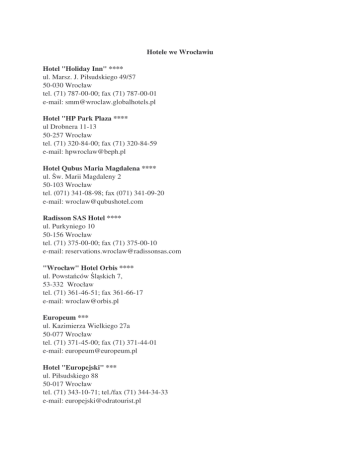 Hotele we Wrocławiu Hotel "Holiday Inn" **** ul. Marsz. J. Piłsudskiego 49/57 50-030 Wrocław tel. (71) 787-00-00; fax (71) 787-00-01 e-mail: [email protected] Hotel "HP Park Plaza **** ul Drobnera 11-13 50-257 Wrocław tel. (71) 320-84-00; fax (71) 320-84-59 e-mail: [email protected] Hotel Qubus Maria Magdalena **** ul. w. Marii Magdaleny 2 50-103 Wrocław tel. (071) 341-08-98; fax (071) 341-09-20 e-mail: [email protected] Radisson SAS Hotel **** ul. Purkyniego 10 50-156 Wrocław tel. (71) 375-00-00; fax (71) 375-00-10 e-mail: [email protected] "Wrocław" Hotel Orbis **** ul. Powsta ców l skich 7, 53-332 Wrocław tel. (71) 361-46-51; fax 361-66-17 e-mail: [email protected] Europeum *** ul. Kazimierza Wielkiego 27a 50-077 Wrocław tel. (71) 371-45-00; fax (71) 371-44-01 e-mail: [email protected] Hotel "Europejski" *** ul. Piłsudskiego 88 50-017 Wrocław tel. (71) 343-10-71; tel./fax (71) 344-34-33 e-mail: [email protected] Hotel "Gem" *** ul. Baudouina de Courtenay 16 51-606 Wrocław tel. (71) 372 90 13, 372 92 13; fax (71) 372 90 02 e-mail: [email protected] Hotel "Mercure Panorama " *** pl. Dominika ski 1 50-159 Wrocław tel. (71) 32-32-700; fax (71) 344-36-81 e-mail: [email protected] Hotel "Polonia" *** ul. Piłsudskiego 66 50-020 Wrocław tel. (71) 343-10-21; tel./fax (71) 344-73-10 e-mail: [email protected] "Monopol"Hotel Orbis ** ul. H. Modrzejewskiej 2 50-071 Wrocław tel. (71) 343-70-41; fax (71) 343-51-03 e-mail: [email protected] Hotel "Tumski" ** Wyspa Słodowa 10 50-266 Wrocław tel.: (71) 322-60-90, 322-60-88; fax (71) 322-61-13 e-mail: [email protected] Hotel "Saigon" ul. Wita Stwosza 22/23 50-148 Wrocław tel. (71) 344-28-81 e-mail: [email protected] ZNP - DOM NAUCZYCIELA ul. Nauczycielska 2 50-381 Wrocław tel./fax 321-95-02 *** Centrum Informacji Turystycznej Rynek 14; 50-101 Wrocław tel. (71) 344-31-11, 344-11-09; fax (71) 344-29-62 e-mail: [email protected]