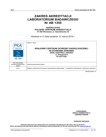 PCA Zakres akredytacji Nr AB 1355 ZAKRES AKREDYTACJI LABORATORIUM BADAWCZEGO Nr AB 1355 wydany przez POLSKIE CENTRUM AKREDYTACJI 01-382 Warszawa, ul. Szczotkarska 42 Wydanie nr 5, Data wydania: 21 marca 2016 r. Nazwa i adres KRAJOWE CENTRUM OCHRONY RADIOLOGICZNEJ W OCHRONIE ZDROWIA DZIAŁ KONTROLI JAKOŚCI ul. Smugowa 6 91-433 Łódź AB 1355 Kod identyfikacji dziedziny/przedmiotu badań N/14 Dziedzina/przedmiot badań: Badania właściwości fizycznych wyposażenia medycznego – urządzenia radiologiczne, medycyna nuklearna Wersja strony: A KIEROWNIK DZIAŁU AKREDYTACJI LABORATORIÓW TADEUSZ MATRAS Niniejszy dokument jest załącznikiem do Certyfikatu Akredytacji Nr AB 1355 z dnia 21.03.2016 r. Status akredytacji oraz aktualność zakresu akredytacji można potwierdzić na stronie internetowej PCA www.pca.gov.pl Dział Akredytacji Laboratoriów Wydanie nr 5, 21 marca 2016 r. str. 1/6 PCA Zakres akredytacji Nr AB 1355 Przedmiot badań/wyrób Urządzenie radiologiczne do radiografii ogólnej analogowej Urządzenie radiologiczne do radiografii ogólnej cyfrowej Urządzenie radiologiczne do zdjęć pantomograficznych oraz cefalometrii z analogową rejestracją obrazu Urządzenie radiologiczne do zdjęć panoramicznych oraz cefalometrii z cyfrową rejestracją obrazu Dział Kontroli Jakości ul. Smugowa 6, 91-433 Łódź Rodzaj działalności/ badane cechy/ metoda Testy specjalistyczne Dokumenty odniesienia Załącznik do rozporządzenia Ministra Zdrowia z dnia 12 listopada 2015 r. zmieniające rozporządzenie w sprawie warunków bezpiecznego stosowania promieniowania jonizującego dla wszystkich rodzajów ekspozycji medycznej (Dz. U. 2015 poz. 2040) PB-R wydanie 7 z dnia 04.12.2015 r. Załącznik do rozporządzenia Ministra Zdrowia z dnia 12 listopada 2015 r. zmieniające rozporządzenie w sprawie warunków bezpiecznego stosowania promieniowania jonizującego dla wszystkich rodzajów ekspozycji medycznej (Dz. U. 2015 poz. 2040) PB-R wydanie 7 z dnia 04.12.2015 r. Załącznik do rozporządzenia Ministra Zdrowia z dnia 12 listopada 2015 r. zmieniające rozporządzenie w sprawie warunków bezpiecznego stosowania promieniowania jonizującego dla wszystkich rodzajów ekspozycji medycznej (Dz. U. 2015 poz. 2040) PB-S wydanie 7 z dnia 04.12.2015 r. Załącznik do rozporządzenia Ministra Zdrowia z dnia 12 listopada 2015 r. zmieniające rozporządzenie w sprawie warunków bezpiecznego stosowania promieniowania jonizującego dla wszystkich rodzajów ekspozycji medycznej (Dz. U. 2015 poz. 2040) PB-S wydanie 7 z dnia 04.12.2015 r. Wersja strony: A Dział Akredytacji Laboratoriów Wydanie nr 5, 21 marca 2016 r. str. 2/6 PCA Zakres akredytacji Nr AB 1355 Przedmiot badań/wyrób Urządzenie radiologiczne do zdjęć wewnątrzustnych Urządzenie radiologiczne do Stomatologicznej tomografii komputerowej wiązki stożkowej Urządzenie radiologiczne do Fluoroskopii i angiografii Urządzenie radiologiczne do mammografii analogowej Rodzaj działalności/ badane cechy/ metoda Testy specjalistyczne Dokumenty odniesienia Załącznik do rozporządzenia Ministra Zdrowia z dnia 12 listopada 2015 r. zmieniające rozporządzenie w sprawie warunków bezpiecznego stosowania promieniowania jonizującego dla wszystkich rodzajów ekspozycji medycznej (Dz. U. 2015 poz. 2040) PB-S wydanie 7 z dnia 04.12.2015 r. Załącznik do rozporządzenia Ministra Zdrowia z dnia 12 listopada 2015 r. zmieniające rozporządzenie w sprawie warunków bezpiecznego stosowania promieniowania jonizującego dla wszystkich rodzajów ekspozycji medycznej (Dz. U. 2015 poz. 2040) PB-S wydanie 7 z dnia 04.12.2015 r. Załącznik do rozporządzenia Ministra Zdrowia z dnia 12 listopada 2015 r. zmieniające rozporządzenie w sprawie warunków bezpiecznego stosowania promieniowania jonizującego dla wszystkich rodzajów ekspozycji medycznej (Dz. U. 2015 poz. 2040) PB-F wydanie 7 z dnia 04.12.2015 r. Załącznik do rozporządzenia Ministra Zdrowia z dnia 12 listopada 2015 r. zmieniające rozporządzenie w sprawie warunków bezpiecznego stosowania promieniowania jonizującego dla wszystkich rodzajów ekspozycji medycznej (Dz. U. 2015 poz. 2040) PB-M wydanie 7 z dnia 04.12.2015 r. Wersja strony: A Dział Akredytacji Laboratoriów Wydanie nr 5, 21 marca 2016 r. str. 3/6 PCA Zakres akredytacji Nr AB 1355 Przedmiot badań/wyrób Urządzenie radiologiczne do mammografii cyfrowej Urządzenie radiologiczne do tomografii konwencjonalnej Urządzenie radiologiczne do tomografii komputerowej Monitory stosowane do prezentacji obrazów medycznych Rodzaj działalności/ badane cechy/ metoda Testy specjalistyczne Dokumenty odniesienia Załącznik do rozporządzenia Ministra Zdrowia z dnia 12 listopada 2015 r. zmieniające rozporządzenie w sprawie warunków bezpiecznego stosowania promieniowania jonizującego dla wszystkich rodzajów ekspozycji medycznej (Dz. U. 2015 poz. 2040) PB-M wydanie 7 z dnia 04.12.2015 r. Załącznik do rozporządzenia Ministra Zdrowia z dnia 12 listopada 2015 r. zmieniające rozporządzenie w sprawie warunków bezpiecznego stosowania promieniowania jonizującego dla wszystkich rodzajów ekspozycji medycznej (Dz. U. 2015 poz. 2040) PB-V wydanie 3 z dnia 04.12.2015 r. Załącznik do rozporządzenia Ministra Zdrowia z dnia 12 listopada 2015 r. zmieniające rozporządzenie w sprawie warunków bezpiecznego stosowania promieniowania jonizującego dla wszystkich rodzajów ekspozycji medycznej (Dz. U. 2015 poz. 2040) PB-T wydanie 6 z dnia 04.12.2015 r. Załącznik do rozporządzenia Ministra Zdrowia z dnia 12 listopada 2015 r. zmieniające rozporządzenie w sprawie warunków bezpiecznego stosowania promieniowania jonizującego dla wszystkich rodzajów ekspozycji medycznej (Dz. U. 2015 poz. 2040) PB-D wydanie 1 z dnia 04.12.2015 r. Wersja strony: A Dział Akredytacji Laboratoriów Wydanie nr 5, 21 marca 2016 r. str. 4/6 PCA Zakres akredytacji Nr AB 1355 Przedmiot badań/wyrób Urządzenie radiologiczne do medycyny nuklearnej – mierniki aktywności bezwzg