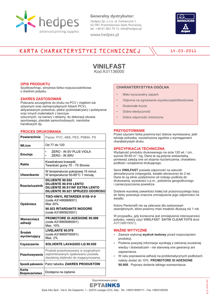 Generalny dystrybutor: Hedpes Sp. z o.o. ul. Folwarczna 1, 62-081 Przeźmierowo (koło Poznania), tel. +48 61 663 79 15, [email protected] KARTA CHARAKTERYSTYKI TECHNICZNEJ 14.03.2011 VINILFAST Kod A31136000 OPIS PRODUKTU CHARAKTERYSTYKA OGÓLNA Szybkoschnąc, winylowa farba rozpuszczalnikowa o średnim połysku. ZAKRES ZASTOSOWAŃ Polecana szczególnie do druku na PCV ( miękkim lub sztywnym oraz samoprzylepnych foliach PCV), aktywowanym poliestrze, pleksi (polimetakrylan) i polistyrenie oraz innych materiałach z tworzyw sztucznych, na banery i reklamy, do dekoracji obuwia sportowego, plandek samochodowych, namiotów handlowych itp. Mało wyczuwalny zapach • Odporna na zgrzewanie wysokoczęstotliwościowe • Doskonałe krycie • Dobra elestyczność • Dobra odporność chemiczna PRZYGOTOWANIE PROCES DRUKOWANIA Powierzchnie Papier, PVC, ABS, PES, PMMA, PS Wł./cm Od 77 do 120 Emulsja • • Rakla Kwadratowa krawędź. Twardość gumy 70 - 75 Shores Utwardzanie W temperaturze pokojowej 15 minut. W temperaturze 50-60°C 1 minutę. Przed użyciem farba powinna być dobrze wymieszana, jeśli istnieje potrzeba, rozcieńczona zgodnie z wymaganiami charakterystyki druku. SPECYFIKACJA TECHNICZNA ZERO - IN SV PLUS VIOLA ZERO - IN SRV Wydajność produktu drukowanego na sicie 120 wł. / cm, wynosi 50-60 m2 / kg. Dane te są jedynie wskazówką, ponieważ zależą one od stopnia rozcieńczenia, charakteru podłoża i urządzenia drukującego. DILUENTE 90.924 DILUENTE 90.918 LENTO Rozcieńczalnik DILUENTE 90.911NF EXTRA LENTO DILUENTE 90.921 SPRUZZO ODOROSO TIXO-VINYL RETARDER 8159 -V-9 (code A31490888001) Max 30% Opóźniacz • 90.923 RITARDANTE INODORE (code A31890923001) Seria VINILFAST posiada odporność na warunki atmosferyczne (niepogoda, światło słoneczne) do 2 lat. Dane te są silnie uzależnione od rodzaju podłoża do drukowania, wysokości n.p.m., położenia geograficznego i zanieczyszczenia powietrza. Dodanie wysokiej zawartości białej lub przezroczystego bazy do farby powoduje znaczne zmniejszenie jego odporności na światło. Kolory Pantone® nie są zalecane dla zastosowań zewnętrznych, które powinny mieć trwałość dłuższą niż 1 rok W przypadku, gdy konieczne jest zmniejszenie intensywności połysku, należy użyć VINILFAST SATIN CLEAR TOYS (kod A31136810001). Wzmacniacz adhezji PROMOTORE DI ADESIONE 90.908 (code A318909080001) Max. 10% Środek wyrównujący LIVE LLANTE 90.970 (code A318909700001) Max. 2% WAŻNE WYTYCZNE Czyszczenie SOLVENTE LAVAGGIO LQ 90.920 ź ź Produkt przechowywany w oryginalnym Przechowywanie zaplombowanym opakowaniu posiada dwuletnią zdatność do magazynowania. ź Sposób pakowania Patrz tabelka ZAKRES PRODUKTÓW Karta Bezpieczeństwa Zawsze wykonaj wydruk testowy przed rozpoczęciem produkcji. Podanie powyżej informacje wynikają z zebranej wcześniej wiedzy i doświadczeń - nie stanowią one gwarancji ani zapewnienia. W celu poprawenia adhezji na problematycznych podłożach należy dodać do 10% PROMOTORE DI ADESIONE 90.908. Poprzez dodanie takiego wzmacniacza Dostępna na żądanie Epta Inks SpA - Via A. De Gasperim, 1 - 22070 Luisago (CO), Italy - Tel. +390319090111 - Fax +3903192005 strona 1/2 Wyprodukowano przez: Generalny dystrybutor: Hedpes Sp. z o.o. ul. Folwarczna 1, 62-081 Przeźmierowo (koło Poznania), tel. +48 61 663 79 15, [email protected] KARTA CHARAKTERYSTYKI TECHNICZNEJ 14.03.2011 VINILFAST Kod A31136000 ZAKRES PRODUKTÓW CZERNIE I BIELE INNE PRODUKTY KOD PRODUKT OPAKOWANIE KOD PRODUKT OPAKOWANIE A3113610000- WHITE TOYS 1 Kg i 5 Kg A31136800005 TRANSPARENT BASE TOYS 5 Kg A3113610100- OPAQUE WHITE 1 Kg i 5 Kg A31136810001 SATIN CLEAR TOYS 1 Kg A3113670000- BLACK TOYS 1 Kg i 5 Kg A31136701001 OPAQUE BLACK TOYS 1 Kg A31136710001 WELDING BLACK TOYS 1 Kg W celu uzyskania kolorów metalicznych lub fluoroscencyjnych, należy dodać pigmentów (kod A31196000) do VINILFAST BRONZE BINDER TOYS A31126850001 według następujących wytycznych procentowych: KOLORY KRYJĄCE KOD PRODUKT OPAKOWANIE A31136281001 LEMON YELLOW TOYS 1 Kg A31136200Y001 PRIMEROSE YELL. TOYS 1 Kg A31136202Y001 CHROME YELLOW TOYS 1 Kg A31136302Y001 SCARLET TOYS 1 Kg A31136303Y001 RED TOYS 1 Kg A31136305Y001 CARMINE RED TOYS 1 Kg A31136343001 PINK TOYS 1 Kg A31136400001 LIGHT BLUE TOYS 1 Kg A31136401001 COBALT BLUE TOYS 1 Kg ź ź ź 10-15% proszek srebrny 20-25% proszek złoty 20-30% pigment fluoroscencyjny A31136403001 ULTRAMARINE BLUE TOYS 1 Kg A31136404001 BRILLIANT BLUE TOYS 1 Kg A31136405001 DARK BLUE TOYS 1 Kg A31136440001 VIOLET 1 Kg A31136500001 LEAF GREEN TOYS 1 Kg UWAGA! A31136503Y001 DARK GREEN TOYS 1 Kg A31136541Y001 GREEN TOYS 1 Kg Informacje podane w niniejszej Karcie Charakterystyki Technicznej nie są kompletne, a każda osoba, używająca produktu do celów innych niż zalecane w tej Karcie, bez uprzedniego otrzymania pisemnego potwierdzenia przydatności produktu do zamierzonego celu, robi to na własne ryzyko. FARBY - PROCESOWE 4-KOLOROWE KOD PRODUKT OPAKOWANIE A31136297001 YELLOW EUROPE TOYS 1 Kg A31136397001 MAGENTA EUROPE TOYS 1 Kg A31136497001 CYAN EUROPE TOYS 1 Kg A31136797001 BLACK EUROPE TOYS 1 Kg A31136880001 THIXOTROPIC GEL TOYS 1 Kg Staramy się, by wszystkie porady udzielane na temat produktu były poprawne, nie mamy jednak wpływu ani na jakość, ani na stan podłoża, na którym przebiega proces drukowania, ani na wiele innych czynników wpływających na użytkowanie i zastosowanie produktu. Dlatego też, dopóki pisemnie nie potwierdzimy zdatności użycia produktu do zamierzonego przez drukarza celu innego niż opisanego w tej Karcie, nie ponosimy odpowiedzialności za wydajność produktu, ani za jakiekolwiek straty lub szkody wynikające z użytkowania produktu. Informacje zawarte w tej specyfikacji mogą podlegać zmianom w świetle nowych doświadczeń oraz naszej polityki ciągłego rozwoju produktu. Epta Inks SpA - Via A. De Gasperim, 1 - 22070 Luisago (CO), Italy - Tel. +390319090111 - Fax +3903192005 stron