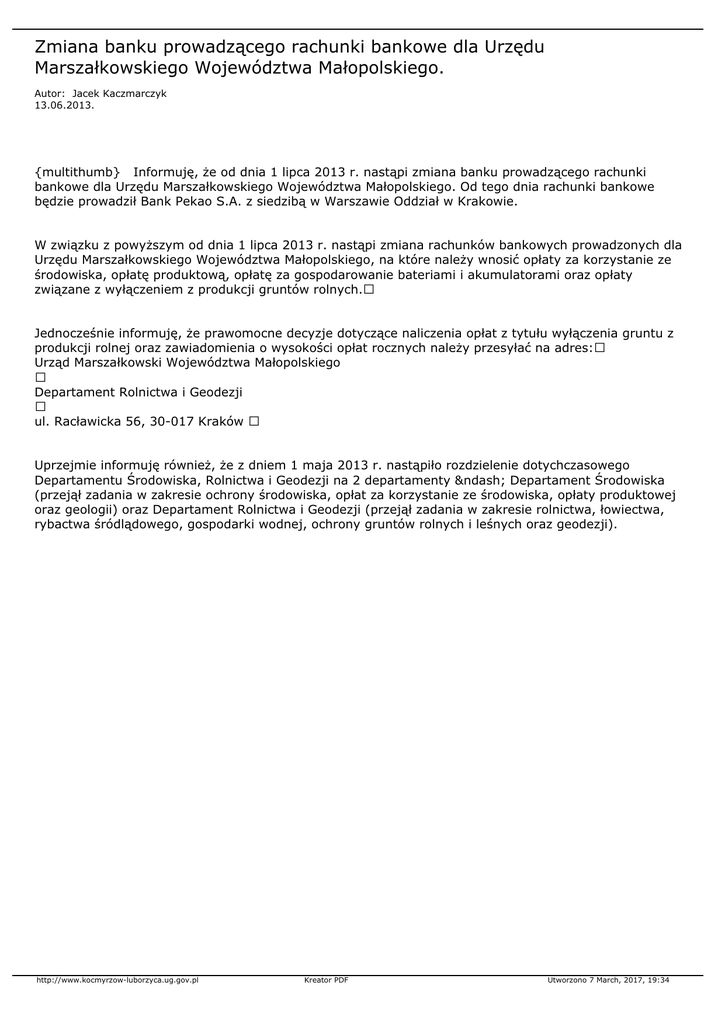 bankowe dla Urzędu Marszałkowskiego Województwa Małopolskiego. Od tego dnia rachunki bankowe