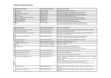 Zasadnicza Szkoła Zawodowa Numer realizowanego programu Wykorzystywany podręcznik 1 Język polski 2 Język niemiecki 3 Historia i wiedza o społeczeństwie 4 Matematyka 5 Fizyka i astronomia 6 Geografia z ochroną i kształtowaniem środowiska 7 Podstawy przedsiębiorczości 8 Technologia informacyjna 9 Przysposobienie obronne 10 Religia DKOS-4015-188/02 DKOS-4015-186/02 DKOS-4015-205/02 DKOS-5002-18/03 DKOS-5002-59/03 DKLOS-4015-210/02 DKOS-5002-23/03 DKOS-5002-34/03 DKOS-4015-1/02 AZ-5-01/1 20.09.2001 Bernardyna Banaś, Język polski, wyd. Operon "Delfin" Hartmut Aufderstrasse, Jutta Mueller, Thomas Storz, wyd. Hueber Szymon Olszaniec, Historia i wiedza o społeczeństwie, wyd. Operon ZSZ E. Leśniak, Cz. Białkowski Matematyka krok po kroku wyd. Respolona S. Brzezowski Fizyka i astronomia wyd. Operon E.Osuch, W.Osuch "Geografia z ochrona i kształtowaniem środowiska" Biernacka M., Korba J., Smutek Z. "Podstawy przedsiębiorczości" Operon Krawczyński E., Wilk M. "Technologia informacyjna" M.Goniewicz, A.W.Nowak-Kowal "Przysposobienie Obronne" red. Z. Marek "Ze Zmartwychwstałym w społeczeństwie" WAM, Kraków kl.I red. Z. Marek "Ze Zmartwychwstałym w rodzinie" WAM, Kraków - kl II i kl. III Lp Przedmioty zawodowe Numer realizowanego programu Wykorzystywany podręcznik Organizacja, bezpieczeństwo i prawo pracy 512(05)/SZ/MENiS/2002,05,08 W. Żabicki Kucharz małej gastronomi Organizacja, bezpieczeństwo i higiena pracy wyd. WSiP Podstawy żywienia człowieka 512(05)/SZ/MENiS/2002,05,08 Superczyńska E "Zasady żywienia człowieka" Technologia gastronomiczna z towaroznawstwem 512(05)/SZ/MENiS/2002,05,08 Konarzewska M "Technologia Gastronomiczna z towaroznawstwem", Kopta A "Technologia Gastronomiczna z towaroznawstwem" Rachunkowość w małej gastronomii 512(05)/SZ/MENiS/2002,05,08 Krześniak K." Gospodarka i rachunkowość przedsiębiorstw gastronomicznych"; Mielczarczyk Z., Urbańska B. "Gospodarka i rachunkowość w gastronomii" Wyposażenie techniczne 512(05)/SZ/MENiS/2002,05,08 Konarzewska M "Wyposarzenie techniczne zakładów gastronomicznych" Komputer w sklepia Organizacja i technika sprzedaży 522[01] /ZSZ,SP/ MEN / 2007.02.08 522[01] /ZSZ,SP/ MEN / 2007.02.08 Adamczyk E "Kasa fiskalna i komputer w sklepie" Strzyżewska E. "Organizacja sprzedaży" Promocja 522[01] /ZSZ,SP/ MEN / 2007.02.08 Przydatek E.J "Promocja" Towaroznawstwo 522[01] /ZSZ,SP/ MEN / 2007.02.08 Rawdanowicz H. "Ogólne wiadomości z towaroznawstwa" Kołożyn-Krajewska D., Sikora T. "Towaroznawstwo żywności" Miller P. Rawdanowicz H.:"Towaroznawstwo artykułów nieżywnościowych" Przedsiębiorstwo w gospodarce rynkowej 741[01] /SZ,LZ/MEN/2000,11,10 "Funkcjonowanie przedsiębiorstwa w gospodarce rynkowej" Technologia w produkcji cukierniczej 741[01] /SZ,LZ/MEN/2000,11,10 Wyczański Sławomir "Cukiernictwo" Technika w produkcji cukierniczej 741[01] /SZ,LZ/MEN/2000,11,10 Bernard Deschamps, Jean-Clude Deschaintre "Ciastkarstwo" Przedsiębiorstwo w gospodarce rynkowej 741[02]/SZ/MEN/2000.12.05 Komosa A. „Funkcjonowanie przedsiębiorstwa w warunkach gospodarki rynkowej” cz. I – Planowanie działalności gospodarczej Komosa A. „Funkcjonowanie przedsiębiorstwa w warunkach gospodarki rynkowej” cz. 2 – Zarządzanie przedsiębiorstwem Komosa A. "Funkcjonowanie przedsiębiorstwa w warunkach gospodarki rynkowej” cz. 3 Wybrane zagadnienia statystyki, analiza efektywności ekonomicznej przedsiębiorstwa Pietraszewski Marian „Funkcjonowanie przedsiębiorstwa w warunkach gospodarki rynkowej” cz. I i cz. II Produkcja piekarska 741[02]/SZ/MEN/2000.12.05 Ambroziak Z "produkcja piekarsko-ciastkarska" Reński A "Aparatura i urządzenia techniczne w piekarstwie" Wyposażenie techniczne piekarni 741[02]/SZ/MEN/2000.12.05 Ambroziak Z "produkcja piekarsko-ciastkarska" Reński A "Aparatura i urządzenia techniczne w piekarstwie" Piekarz Cukiernik Sprzedawca Kucharz małej gastronomii Lp Przedmioty ogólnokształcące
