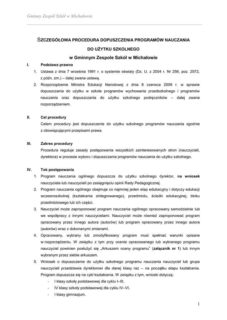 Gminny Zespół Szkół w Michałowie SZCZEGÓŁOWA PROCEDURA DOPUSZCZENIA PROGRAMÓW NAUCZANIA DO UŻYTKU SZKOLNEGO w Gminnym Zespole Szkół w Michałowie I. Podstawa prawna 1. Ustawa z dnia 7 września 1991 r. o systemie oświaty (Dz. U. z 2004 r. Nr 256, poz. 2572, z późn. zm.) – dalej zwana ustawą. 2. Rozporządzenie Ministra Edukacji Narodowej z dnia 8 czerwca 2009 r. w sprawie dopuszczania do użytku w szkole programów wychowania przedszkolnego i programów nauczania oraz dopuszczania do użytku szkolnego podręczników – dalej zwane rozporządzeniem. II. Cel procedury Celem procedury jest dopuszczenie do użytku szkolnego programów nauczania zgodnie z obowiązującymi przepisami prawa. III. Zakres procedury Procedura reguluje zasady postępowania wszystkich zainteresowanych stron (nauczycieli, dyrektora) w procesie wyboru i dopuszczania programów nauczania do użytku szkolnego. IV. Tok postępowania 1. Program nauczania ogólnego dopuszcza do użytku szkolnego dyrektor, na wniosek nauczyciela lub nauczycieli po zasięgnięciu opinii Rady Pedagogicznej. 2. Program nauczania ogólnego obejmuje co najmniej jeden etap edukacyjny i dotyczy edukacji wczesnoszkolnej (kształcenia zintegrowanego), przedmiotu, ścieżki edukacyjnej, bloku przedmiotowego lub ich części. 3. Nauczyciel może zaproponować program nauczania ogólnego opracowany samodzielnie lub we współpracy z innymi nauczycielami. Nauczyciel może również zaproponować program opracowany przez innego autora (autorów) lub program opracowany przez innego autora (autorów) wraz z dokonanymi zmianami. 4. Opracowany, wybrany lub zmodyfikowany program musi spełniać warunki opisane w rozporządzeniu. W związku z tym przy ocenie opracowanego lub wybranego programu nauczyciel powinien posłużyć się „Arkuszem oceny programu” (załącznik nr 1) lub innym wybranym przez siebie arkuszem. 5. Wniosek o dopuszczenie do użytku szkolnego programu nauczania nauczyciel lub grupa nauczycieli przedstawia dyrektorowi dla danej klasy raz – na początku etapu kształcenia. Program dopuszcza się na cykl kształcenia. W związku z tym, wnioski dotyczą: - I klasy szkoły podstawowej dla cyklu I–III, - IV klasy szkoły podstawowej dla cyklu IV–VI, - I klasy gimnazjum. 1 Gminny Zespół Szkół w Michałowie W kolejnych latach szkolny zestaw programów jest aktualizowany, ale jeżeli program nie ulega zmianie, nie ponawiamy wniosku. 6. Wniosek, o którym mowa w pkt 5 nauczyciel lub zespół nauczycieli przedkłada dyrektorowi szkoły do 10 czerwca każdego roku, dla programów, które będą obowiązywały w kolejnym roku szkolnym, wg wzoru (załącznik nr 2). 7. Dyrektor szkoły dokonuje analizy przedstawionych wniosków i w ciągu 14 dni podejmuje następujące możliwe decyzje: 7.1. W przypadku stwierdzenia, że zaproponowany przez nauczyciela lub zespół nauczycieli program spełnia wymagania opisane w rozporządzeniu oraz jest dostosowany do możliwości i potrzeb uczniów, dla których jest przeznaczony, dyrektor przekazuje program do sekretariatu szkoły, gdzie zostaje on umieszczony w teczce „Proponowane programy nauczania ogólnego na lata szkolne ……… (np. 2012–2015)” Programy te są do wglądu wszystkich członków Rady Pedagogicznej w celu ostatecznego zaopiniowania. O swojej decyzji dyrektor informuje zainteresowanego nauczyciela ustnie. 7.2. W przypadku wątpliwości, czy przedstawiony program spełnia wszystkie wymagania rozporządzenia, dyrektor zwraca się o opinię o programie do: - nauczyciela mianowanego lub dyplomowanego, posiadającego wykształcenie wyższe i kwalifikacje wymagane do prowadzenia zajęć edukacyjnych, dla których program jest przeznaczony, lub - konsultanta lub doradcy metodycznego, lub - zespołu przedmiotowego funkcjonującego w szkole. O swojej decyzji dyrektor informuje zainteresowanego nauczyciela ustnie. 7.2.1. Opinia o programie powinna być wydana w ciągu 21 dni, jednak nie później niż do 25 lipca i powinna zawierać w szczególności ocenę zgodności programu nauczania ogólnego z podstawą programową kształcenia ogólnego i dostosowania programu do potrzeb i możliwości uczniów, dla których jest przeznaczony. 7.2.2. Opinia nauczyciela lub zespołu przedmiotowego funkcjonującego w szkole, o których mowa w pkt 7.2. jest sporządzana nieodpłatnie w ramach innych zadań nauczycieli, o których mowa w art. 42. ust.2. ustawy Karta Nauczyciela i wg wzoru (załączniki nr 3 i 4). 7.2.3. Opinia konsultanta lub doradcy metodycznego jest sporządzana na zasadach obowiązujących w placówce, w której zatrudniony jest konsultant lub doradca metodyczny. 7.2.4. W przypadku pozytywnej opinii, dyrektor postępuje jak w pkt 7.1. 7.2.5. W przypadku opinii negatywnej, dyrektor do dnia 31 lipca informuje pisemnie (załącznik nr 5) zainteresowanego nauczyciela o powodach negatywnej opinii i zaleca wybór innego programu lub dokonanie zmiany w programie zaopiniowanym negatywnie (w zależności od treści opinii, o której mowa w pkt 7.2.1.) w terminie do 20 sierpnia. 7.2.6. Powtórnie wybrany lub zmodyfikowany program podlega postępowaniu jak w pkt 7.1. 8. Przed sierpniowym posiedzeniem Rady Pedagogicznej wszyscy jej członkowie mają możliwość zapoznania się z proponowanymi programami nauczania ogólnego zgromadzonymi w teczce, o której mowa w pkt 7.1. 2 Gminny Zespół Szkół w Michałowie 9. Na sierpniowym posiedzeniu Rady Pedagogicznej dyrektor szkoły zasięga opinii Rady na temat przedstawionych programów nauczania ogólnego. Wszystkie opinie są wyrażane w formie ustnej i protokołowane. 10. Dyrektor po wysłuchaniu wszystkich opinii dopuszcza do użytku szkolnego wszystkie przedstawione programy i włącza je do szkolnego zestawu programów nauczania na dany rok. V. Termin obowiązywania procedury Procedura obowiązuje od dnia 1 września 2012 roku do odwołania. VI. Załączniki 1. Arkusz oceny programu 2. Wniosek o dopuszczenie do użytku szkolne