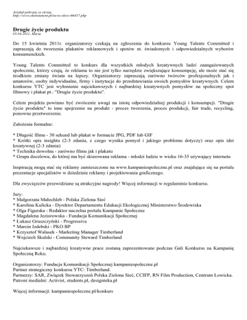 Artykuł pobrany ze strony http://www.ekonsument.pl/news-show-66417.php Drugie życie produktu 05.04.2011, Maria Do 15 kwietnia 2011r. organizatorzy czekają na zgłoszenia do konkursu Young Talents Committed i zapraszają do tworzenia plakatów reklamowych i spotów nt. świadomych i odpowiedzialnych wyborów konsumenckich. Young Talents Committed to konkurs dla wszystkich młodych kreatywnych ludzi zaangażowanych społecznie, którzy czują, że reklama to nie jest tylko narzędzie zwiększające konsumpcję, ale może stać się środkiem zmiany świata na lepszy. Organizatorzy zapraszają zarówno twórców profesjonalnych jak i amatorów, osoby indywidualne, firmy i instytucje do przedstawiania swoich pomysłów kreatywnych. Celem konkursu YTC jest wyłonienie najciekawszych i najbardziej kreatywnych pomysłów na społeczny spot filmowy i plakat pt.: "Drugie życie produktu". Celem projektu powinno być zwrócenie uwagi na istotę odpowiedzialnej produkcji i konsumpcji. "Drugie życie produktu" to inne spojrzenie na produkt - proces tworzenia, proces produkcji, fair trade, recycling, ponowne przetworzenie. Założenia formalne: * Długość filmu - 30 sekund lub plakat w formacie JPG, PDF lub GIF * Krótki opis insightu (2-3 zdania, z czego wynika pomysł i jakiego problemu dotyczy) oraz opis idei kreatywnej (2-3 zdania) * Technika dowolna - zarówno filmu jak i plakatu * Grupa docelowa, do której ma być skierowana reklama - młodzi ludzie w wieku 16-35 używający internetu Inspiracją mogą stać się reklamy zamieszczone na www.kampaniespoleczne.pl oraz znajdujące się na portalu prezentacje specjalistów w dziedzinie reklamy i projektowania graficznego. Dla zwycięzców przewidziane są atrakcyjne nagrody! Więcej informacji w regulaminie konkursu. Jury: * Małgorzata Małochleb - Polska Zielona Sieć * Karolina Kulicka - Dyrektor Departamentu Edukacji Ekologicznej Ministerstwo Środowiska * Olga Figurska - Redaktor naczelna portalu Kampanie Społeczne * Magdalena Jeziorowska - Fundacja Komunikacji Społecznej * Łukasz Gruszczyński - Progressiva * Marcin Izdebski - PKO BP * Krzysztof Walasek - Marketing Manager Timberland * Wojciech Skulski - Community Steward Timberland Najciekawsze i najbardziej kreatywne prace zostaną zaprezentowane podczas Gali Konkursu na Kampanię Społeczną Roku. Organizatorzy: Fundacja Komunikacji Społecznej kampaniespoleczne.pl Partner strategiczny konkursu YTC: Timberland. Partnerzy: SAR, Związek Stowarzyszeń Polska Zielona Sieć, CCIFP, RN Film Production, Centrum Łowicka. Patroni medialni: Activist, students.pl, designteka.pl Więcej informacji: kampaniespoleczne.pl/konkurs Fundacja Komunikacji Społecznej Zuzanna Szabrańska tel.22/ 823 60 93 [email protected]