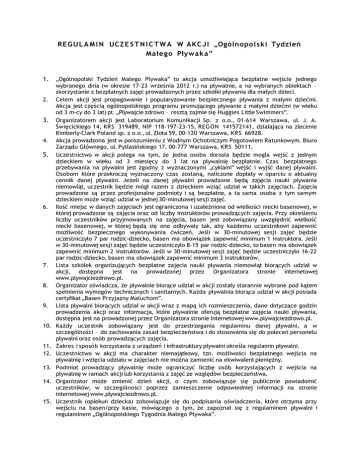 REG U L A M I N UCZ E S T N I C T W A W AK C J I „Ogólnopols ki Tydzień Małego Pływak a” 1. 2. 3. 4. 5. 6. 7. 8. 9. 10. 11. 12. 13. 14. 15. „Ogólnopolski Tydzień Małego Pływaka” to akcja umożliwiająca bezpłatne wejście jednego wybranego dnia (w okresie 17-23 września 2012 r.) na pływalnie, a na wybranych obiektach – skorzystanie z bezpłatnych zajeć prowadzonych przez szkółki pływania dla małych dzieci. Celem akcji jest propagowanie i popularyzowanie bezpiecznego pływania z małymi dziećmi. Akcja jest cześcią ogólnopolskiego programu promującego pływanie z małymi dziećmi (w wieku od 3 m-cy do 3 lat) pt. „Pływajcie zdrowo – resztą zajmie się Huggies Little Swimmers”. Organizatorem akcji jest Laboratorium Komunikacji Sp. z o.o., 01-614 Warszawa, ul. J. A. Święcickiego 14, KRS 319489, NIP 118-197-23-15, REGON 141572141, działająca na zlecenie Kimberly-Clark Poland sp. z o.o., ul. Złota 59, 00-120 Warszawa, KRS 66928. Akcja prowadzona jest w porozumieniu z Wodnym Ochotniczym Pogotowiem Ratunkowym. Biuro Zarządu Głównego, ul. Pytlasińskiego 17, 00-777 Warszawa, KRS 50111. Uczestnictwo w akcji polega na tym, że jedna osoba dorosła będzie mogła wejść z jednym dzieckiem w wieku od 3 miesięcy do 3 lat na pływalnię bezpłatnie. Czas bezpłatnego przebywania na pływalni jest zgodny z wyznaczonymi „cyklami” wejść i wyjść danej pływalni. Osobom które przekroczą wyznaczony czas zostaną, naliczone dopłaty w oparciu o aktualny cennik danej pływalni. Jeżeli na danej pływalni prowadzone będą zajęcia nauki pływania niemowląt, uczestnik będzie mógł razem z dzieckiem wziąć udział w takich zajęciach. Zajęcia prowadzone są przez profesjonalne podmioty i są bezpłatne, a ta sama osoba z tym samym dzieckiem może wziąć udział w jednej 30-minutowej sesji zajęć. Ilość miejsc w danych zajęciach jest ograniczona i uzależniona od wielkości niecki basenowej, w której prowadzone są zajęcia oraz od liczby instruktorów prowadzących zajęcia. Przy określeniu liczby uczestników przyjmowanych na zajęcia, basen jest zobowiązany uwzględnić wielkość niecki basenowej, w której będą się one odbywały tak, aby każdemu uczestnikowi zapewnić możliwość bezpiecznego wykonywania ćwiczeń. Jeśli w 30-minutowej sesji zajęć będzie uczestniczyło 7 par rodzic-dziecko, basen ma obowiązek zapewnić minimum 1 instruktora. Jeśli w 30-minutowej sesji zajęć będzie uczestniczyło 8-15 par rodzic-dziecko, to basen ma obowiązek zapewnić minimum 2 instruktorów. Jeśli w 30-minutowej sesji zajęć będzie uczestniczyło 16-22 par rodzic-dziecko, basen ma obowiązek zapewnić minimum 3 instruktorów. Lista szkółek organizujących bezpłatne zajęcia nauki pływania niemowląt biorących udział w akcji, dostępna jest na prowadzonej przez Organizatora stronie internetowej www.plywajciezdrowo.pl. Organizator oświadcza, że pływalnie biorące udział w akcji zostały starannie wybrane pod kątem spełnienia wymogów technicznych i sanitarnych. Każda pływalnia biorąca udział w akcji posiada certyfikat „Basen Przyjazny Maluchom”. Lista pływalni biorących udział w akcji wraz z mapą ich rozmieszczenia, dane dotyczące godzin prowadzenia akcji oraz informacja, które pływalnie oferują bezpłatne zajęcia nauki pływania, dostępna jest na prowadzonej przez Organizatora stronie internetowej www.plywajciezdrowo.pl. Każdy uczestnik zobowiązany jest do przestrzegania regulaminu danej pływalni, a w szczególności – do zachowania zasad bezpieczeństwa i do stosowania się do poleceń personelu pływalni oraz osób prowadzących zajęcia. Zakres i sposób korzystania z urządzeń i infrastruktury pływalni określa regulamin pływalni. Uczestnictwo w akcji ma charakter niemajątkowy, tzn. możliwości bezpłatnego wejścia na pływalnię i wzięcia udziału w zajęciach nie można zamienić na ekwiwalent pieniężny. Podmiot prowadzący pływalnię może ograniczyć liczbę osób korzystających z wejścia na pływalnię w ramach akcji lub korzystania z zajęć ze względów bezpieczeństwa. Organizator może zmienić dzień akcji, o czym zobowiązuje się publicznie powiadomić uczestników, w szczególności poprzez zamieszczenie odpowiedniej informacji na stronie internetowej www.plywajciezdrowo.pl. Uczestnik (opiekun dziecka) zobowiązuje się do podpisania oświadczenia, które otrzyma przy wejściu na basen/przy kasie, mówiącego o tym, że zapoznał się z regulaminem pływalni i regulaminem „Ogólnopolskiego Tygodnia Małego Pływaka”.