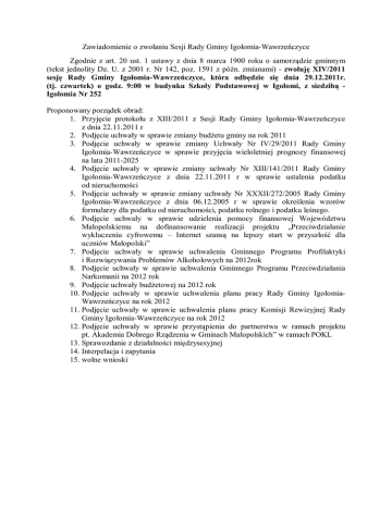 Zawiadomienie o zwołaniu Sesji Rady Gminy Igołomia-Wawrzeńczyce Zgodnie z art. 20 ust. 1 ustawy z dnia 8 marca 1900 roku o samorządzie gminnym (tekst jednolity Dz. U. z 2001 r. Nr 142, poz. 1591 z późn. zmianami) - zwołuję XIV/2011 sesję Rady Gminy Igołomia-Wawrzeńczyce, która odbędzie się dnia 29.12.2011r. (tj. czwartek) o godz. 9:00 w budynku Szkoły Podstawowej w Igołomi, z siedzibą Igołomia Nr 252 Proponowany porządek obrad: 1. Przyjęcie protokołu z XIII/2011 z Sesji Rady Gminy Igołomia-Wawrzeńczyce z dnia 22.11.2011 r 2. Podjęcie uchwały w sprawie zmiany budżetu gminy na rok 2011 3. Podjęcie uchwały w sprawie zmiany Uchwały Nr IV/29/2011 Rady Gminy Igołomia-Wawrzeńczyce w sprawie przyjęcia wieloletniej prognozy finansowej na lata 2011-2025 4. Podjęcie uchwały w sprawie zmiany uchwały Nr XIII/141/2011 Rady Gminy Igołomia-Wawrzeńczyce z dnia 22.11.2011 r w sprawie ustalenia podatku od nieruchomości 5. Podjęcie uchwały w sprawie zmiany uchwały Nr XXXII/272/2005 Rady Gminy Igołomia-Wawrzeńczyce z dnia 06.12.2005 r w sprawie określenia wzorów formularzy dla podatku od nieruchomości, podatku rolnego i podatku leśnego. 6. Podjęcie uchwały w sprawie udzielenia pomocy finansowej Województwu Małopolskiemu na dofinansowanie realizacji projektu „Przeciwdziałanie wykluczeniu cyfrowemu – Internet szansą na lepszy start w przyszłość dla uczniów Małopolski” 7. Podjęcie uchwały w sprawie uchwalenia Gminnego Programu Profilaktyki i Rozwiązywania Problemów Alkoholowych na 2012rok 8. Podjęcie uchwały w sprawie uchwalenia Gminnego Programu Przeciwdziałania Narkomanii na 2012 rok 9. Podjęcie uchwały budżetowej na 2012 rok 10. Podjęcie uchwały w sprawie uchwalenia planu pracy Rady Gminy IgołomiaWawrzeńczyce na rok 2012 11. Podjęcie uchwały w sprawie uchwalenia planu pracy Komisji Rewizyjnej Rady Gminy Igołomia-Wawrzeńczyce na rok 2012 12. Podjęcie uchwały w sprawie przystąpienia do partnerstwa w ramach projektu pt. Akademia Dobrego Rządzenia w Gminach Małopolskich” w ramach POKL 13. Sprawozdanie z działalności międzysesyjnej 14. Interpelacja i zapytania 15. wolne wnioski