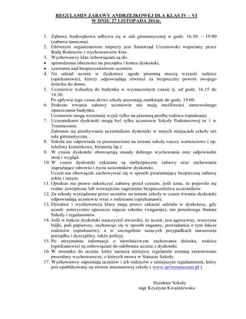 REGULAMIN ZABAWY ANDRZEJKOWEJ DLA KLAS IV – VI W DNIU 27 LISTOPADA 2014r. 1. Zabawa Andrzejkowa odbywa się w sali gimnastycznej w godz. 16.30. – 19.00 (zabawa taneczna). 2. Głównym organizatorem imprezy jest Samorząd Uczniowski wspierany przez Radę Rodziców i wychowawców klas. 3. Wychowawcy klas zobowiązani są do: sprawdzenia obecności na początku i końcu dyskoteki, czuwania nad bezpieczeństwem uczniów. 4. Na udział ucznia w dyskotece zgodę pisemną muszą wyrazić rodzice (opiekunowie), którzy odpowiadają również za bezpieczny powrót swojego dziecka do domu. 5. Uczniowie wchodzą do budynku w wyznaczonym czasie tj. od godz. 16.15 do 16.30. Po upływie tego czasu drzwi szkoły pozostają zamknięte do godz. 19.00. 6. Podczas trwania zabawy uczniowie nie mają możliwości samowolnego opuszczania budynku. Uczniowie mogą wcześniej wyjść tylko na pisemną prośbę rodzica (opiekuna). 7. Uczestnikami dyskoteki mogą być tylko uczniowie Szkoły Podstawowej nr 1 w Trzemesznie. Zabrania się przebywania uczestnikom dyskoteki w innych miejscach szkoły niż sala gimnastyczna. 8. Szkoła nie odpowiada za pozostawione na terenie szkoły rzeczy wartościowe ( np. telefony komórkowe, biżuterię itp.). 9. W czasie dyskoteki obowiązują zasady dobrego wychowania oraz odpowiedni strój i wygląd. 10. W czasie dyskoteki zakazane są niebezpieczne zabawy oraz zachowania zagrażające zdrowiu i życiu uczestników dyskoteki. Uczeń ma obowiązek zachowywać się w sposób gwarantujący bezpieczną zabawę sobie i innym. 11. Opiekun ma prawo zakończyć zabawę przed czasem, jeśli uzna, że pojawiło się realne zewnętrzne lub wewnętrzne zagrożenie bezpieczeństwa uczestników. 12. Za szkody wyrządzone przez uczniów na terenie szkoły w czasie trwania dyskoteki odpowiadają uczniowie wraz z rodzicami (opiekunami). 13. Dyrektor i wychowawca klasy mają prawo zakazać udziału w dyskotece, gdy uczeń: notorycznie opuszcza zajęcia szkolne (wagaruje), nie przestrzega Statutu Szkoły i regulaminów. 14. Jeśli w trakcie dyskoteki nauczyciel stwierdzi, że uczeń: jest agresywny, wszczyna bójki, pali papierosy, zachowuje się w sposób naganny, powiadamia o tym fakcie rodziców (opiekunów), a w szczególnie rażących przypadkach naruszenia porządku i dyscypliny, także policję. 15. Po otrzymaniu informacji o niewłaściwym zachowania dziecka, rodzice (opiekunowie) są zobowiązani do odebrania ucznia z dyskoteki. 16. W stosunku do ucznia, który narusza niniejszy regulamin zostaną zastosowane procedury wychowawcze, o których mowa w Statucie Szkoły. 17. Wychowawcy zapoznają uczniów i ich rodziców z niniejszym regulaminem, który jest opublikowany na stronie internetowej szkoły ( www.sp1trzemeszno.pl ). Dyrektor Szkoły mgr Krystyna Kwaśniewska