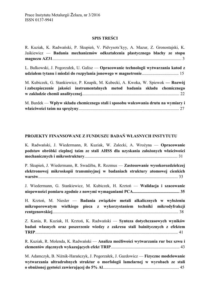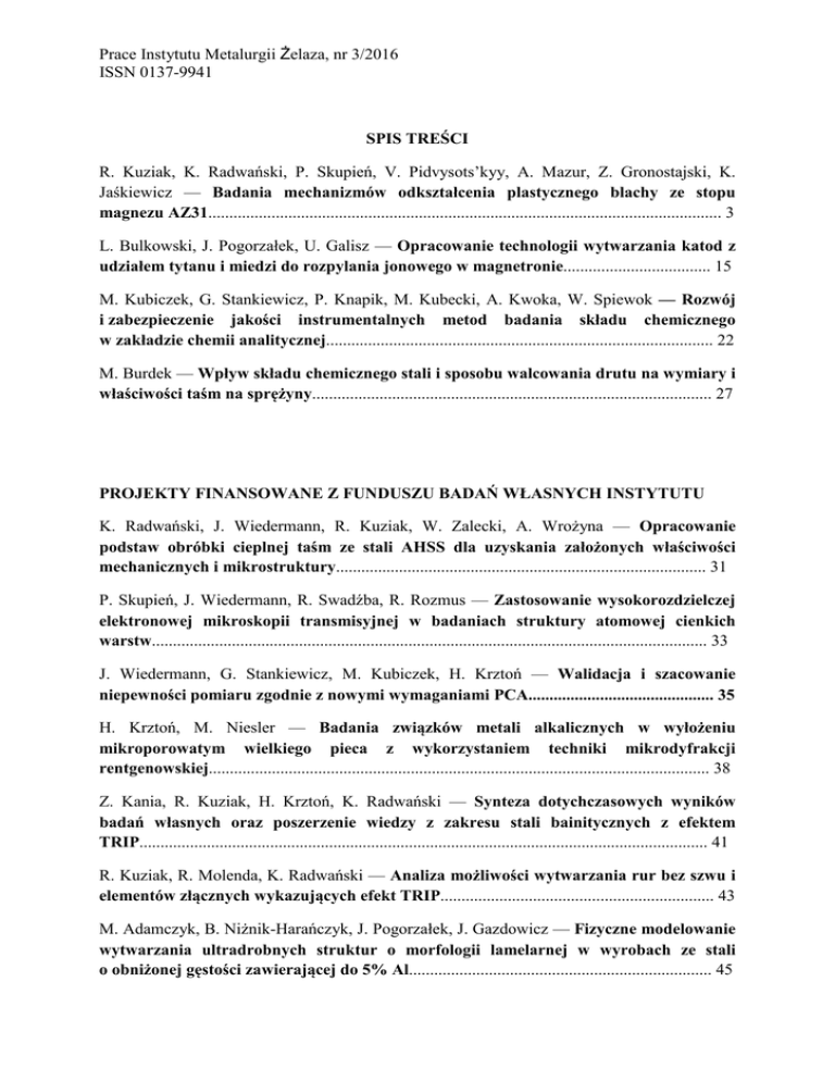 Prace Instytutu Metalurgii Żelaza, nr 3/2016 ISSN 0137-9941 SPIS TREŚCI R. Kuziak, K. Radwański, P. Skupień, V. Pidvysots’kyy, A. Mazur, Z. Gronostajski, K. Jaśkiewicz — Badania mechanizmów odkształcenia plastycznego blachy ze stopu magnezu AZ31.......................................................................................................................... 3 L. Bulkowski, J. Pogorzałek, U. Galisz — Opracowanie technologii wytwarzania katod z udziałem tytanu i miedzi do rozpylania jonowego w magnetronie................................... 15 M. Kubiczek, G. Stankiewicz, P. Knapik, M. Kubecki, A. Kwoka, W. Spiewok — Rozwój i zabezpieczenie jakości instrumentalnych metod badania składu chemicznego w zakładzie chemii analitycznej............................................................................................ 22 M. Burdek — Wpływ składu chemicznego stali i sposobu walcowania drutu na wymiary i właściwości taśm na sprężyny............................................................................................... 27 PROJEKTY FINANSOWANE Z FUNDUSZU BADAŃ WŁASNYCH INSTYTUTU K. Radwański, J. Wiedermann, R. Kuziak, W. Zalecki, A. Wrożyna — Opracowanie podstaw obróbki cieplnej taśm ze stali AHSS dla uzyskania założonych właściwości mechanicznych i mikrostruktury........................................................................................ 31 P. Skupień, J. Wiedermann, R. Swadźba, R. Rozmus — Zastosowanie wysokorozdzielczej elektronowej mikroskopii transmisyjnej w badaniach struktury atomowej cienkich warstw.................................................................................................................................... 33 J. Wiedermann, G. Stankiewicz, M. Kubiczek, H. Krztoń — Walidacja i szacowanie niepewności pomiaru zgodnie z nowymi wymaganiami PCA............................................ 35 H. Krztoń, M. Niesler — Badania związków metali alkalicznych w wyłożeniu mikroporowatym wielkiego pieca z wykorzystaniem techniki mikrodyfrakcji rentgenowskiej....................................................................................................................... 38 Z. Kania, R. Kuziak, H. Krztoń, K. Radwański — Synteza dotychczasowych wyników badań własnych oraz poszerzenie wiedzy z zakresu stali bainitycznych z efektem TRIP....................................................................................................................................... 41 R. Kuziak, R. Molenda, K. Radwański — Analiza możliwości wytwarzania rur bez szwu i elementów złącznych wykazujących efekt TRIP................................................................. 43 M. Adamczyk, B. Niżnik-Harańczyk, J. Pogorzałek, J. Gazdowicz — Fizyczne modelowanie wytwarzania ultradrobnych struktur o morfologii lamelarnej w wyrobach ze stali o obniżonej gęstości zawierającej do 5% Al........................................................................ 45 Prace Instytutu Metalurgii Żelaza, nr 3/2016 ISSN 0137-9941 Dobrzański, H. Purzyńska, A. Zieliński — Ocena wpływu odstawień i uruchomień na mikrostrukturę oraz trwałość eksploatacyjną materiału wirników turbin parowych w stanie wyjściowym oraz po długotrwałej eksploatacji w warunkach pełzania................ 48 H. Purzyńska, J. Dobrzański, A. Zieliński, R. Rozmus — Prędkość pełzania i proces wydzieleniowy węglików materiału wirników turbin parowych z niskostopowych stali Cr-Mo-V po eksploatacji znacznie przekraczającej obliczeniowy czas pracy................. 51 M. Dziuba-Kałuża, J. Dobrzański, H. Purzyńska, A. Zieliński, R. Rozmus — Trwałość resztkowa stali 1Cr-0,5Mo po długotrwałej eksploatacji w warunkach pełzania wykazującej uszkodzenia wewnętrzne w postaci pustek.................................................... 55 A. Zieliński, R. Kuziak, M. Miczka, H. Purzyńska — Weryfikacja metodą numeryczną trwałości eksploatacyjnej stali nowej generacji oszacowanej na podstawie analizy ilościowej obrazu mikrostruktury....................................................................................... 57 W. Szulc, M. Miczka — Wspomaganie działań i doradztwo w zakresie pozyskiwania środków na prace b+r z budżetu unijnego dla Polski na lata 2014–2020......................... 61