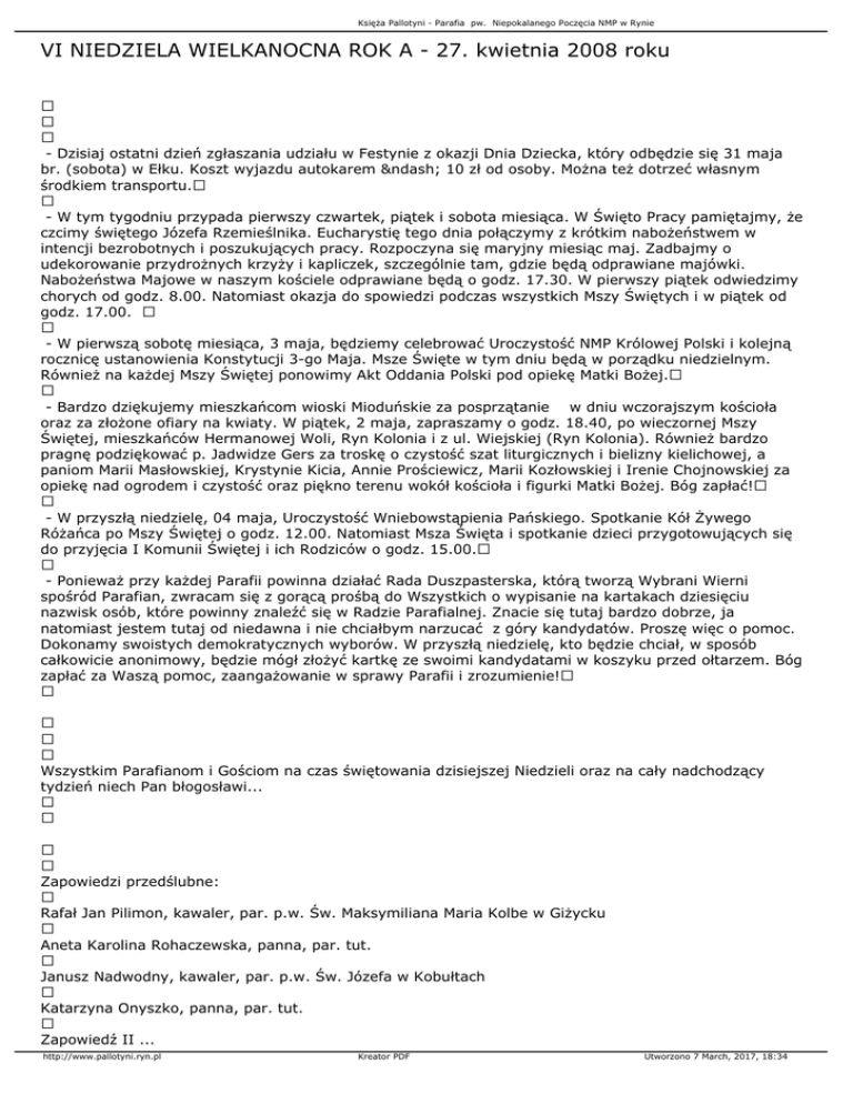 Księża Pallotyni - Parafia pw. Niepokalanego Poczęcia NMP w Rynie VI NIEDZIELA WIELKANOCNA ROK A - 27. kwietnia 2008 roku - Dzisiaj ostatni dzień zgłaszania udziału w Festynie z okazji Dnia Dziecka, który odbędzie się 31 maja br. (sobota) w Ełku. Koszt wyjazdu autokarem – 10 zł od osoby. Można też dotrzeć własnym środkiem transportu. - W tym tygodniu przypada pierwszy czwartek, piątek i sobota miesiąca. W Święto Pracy pamiętajmy, że czcimy świętego Józefa Rzemieślnika. Eucharystię tego dnia połączymy z krótkim nabożeństwem w intencji bezrobotnych i poszukujących pracy. Rozpoczyna się maryjny miesiąc maj. Zadbajmy o udekorowanie przydrożnych krzyży i kapliczek, szczególnie tam, gdzie będą odprawiane majówki. Nabożeństwa Majowe w naszym kościele odprawiane będą o godz. 17.30. W pierwszy piątek odwiedzimy chorych od godz. 8.00. Natomiast okazja do spowiedzi podczas wszystkich Mszy Świętych i w piątek od godz. 17.00. - W pierwszą sobotę miesiąca, 3 maja, będziemy celebrować Uroczystość NMP Królowej Polski i kolejną rocznicę ustanowienia Konstytucji 3-go Maja. Msze Święte w tym dniu będą w porządku niedzielnym. Również na każdej Mszy Świętej ponowimy Akt Oddania Polski pod opiekę Matki Bożej. - Bardzo dziękujemy mieszkańcom wioski Mioduńskie za posprzątanie w dniu wczorajszym kościoła oraz za złożone ofiary na kwiaty. W piątek, 2 maja, zapraszamy o godz. 18.40, po wieczornej Mszy Świętej, mieszkańców Hermanowej Woli, Ryn Kolonia i z ul. Wiejskiej (Ryn Kolonia). Również bardzo pragnę podziękować p. Jadwidze Gers za troskę o czystość szat liturgicznych i bielizny kielichowej, a paniom Marii Masłowskiej, Krystynie Kicia, Annie Prościewicz, Marii Kozłowskiej i Irenie Chojnowskiej za opiekę nad ogrodem i czystość oraz piękno terenu wokół kościoła i figurki Matki Bożej. Bóg zapłać! - W przyszłą niedzielę, 04 maja, Uroczystość Wniebowstąpienia Pańskiego. Spotkanie Kół Żywego Różańca po Mszy Świętej o godz. 12.00. Natomiast Msza Święta i spotkanie dzieci przygotowujących się do przyjęcia I Komunii Świętej i ich Rodziców o godz. 15.00. - Ponieważ przy każdej Parafii powinna działać Rada Duszpasterska, którą tworzą Wybrani Wierni spośród Parafian, zwracam się z gorącą prośbą do Wszystkich o wypisanie na kartakach dziesięciu nazwisk osób, które powinny znaleźć się w Radzie Parafialnej. Znacie się tutaj bardzo dobrze, ja natomiast jestem tutaj od niedawna i nie chciałbym narzucać z góry kandydatów. Proszę więc o pomoc. Dokonamy swoistych demokratycznych wyborów. W przyszłą niedzielę, kto będzie chciał, w sposób całkowicie anonimowy, będzie mógł złożyć kartkę ze swoimi kandydatami w koszyku przed ołtarzem. Bóg zapłać za Waszą pomoc, zaangażowanie w sprawy Parafii i zrozumienie! Wszystkim Parafianom i Gościom na czas świętowania dzisiejszej Niedzieli oraz na cały nadchodzący tydzień niech Pan błogosławi... Zapowiedzi przedślubne: Rafał Jan Pilimon, kawaler, par. p.w. Św. Maksymiliana Maria Kolbe w Giżycku Aneta Karolina Rohaczewska, panna, par. tut. Janusz Nadwodny, kawaler, par. p.w. Św. Józefa w Kobułtach Katarzyna Onyszko, panna, par. tut. Zapowiedź II ... http://www.pallotyni.ryn.pl Kreator PDF Utworzono 7 March, 2017, 18:34 Księża Pallotyni - Parafia pw. Niepokalanego Poczęcia NMP w Rynie http://www.pallotyni.ryn.pl Kreator PDF Utworzono 7 March, 2017, 18:34