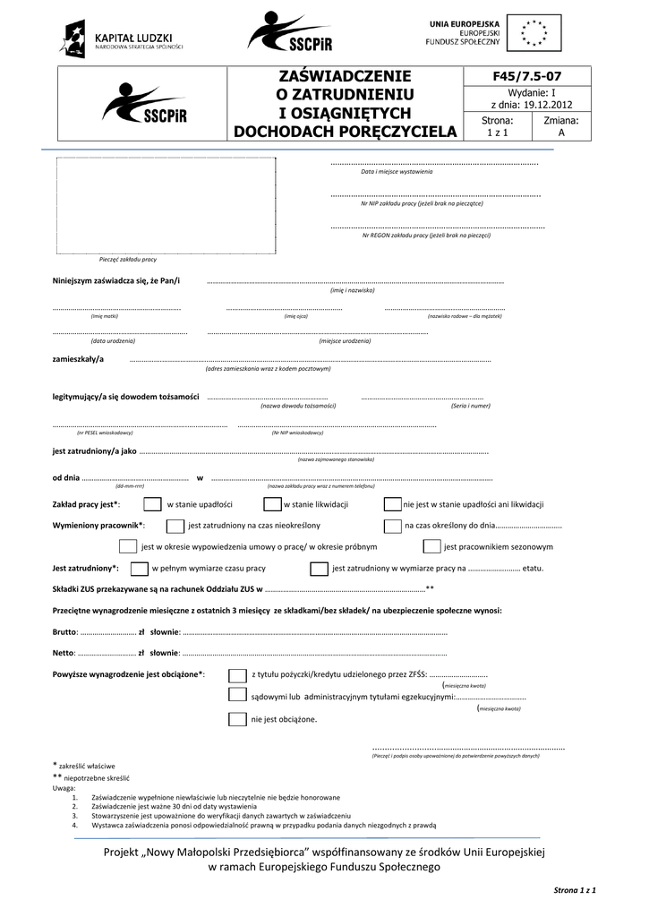 ZAŚWIADCZENIE O ZATRUDNIENIU I OSIĄGNIĘTYCH DOCHODACH PORĘCZYCIELA F45/7.5-07 Wydanie: I z dnia: 19.12.2012 Strona: 1z1 Zmiana: A ……………………………………………………………………………….. Data i miejsce wystawienia …………………………………….………………………………………….. Nr NIP zakładu pracy (jeżeli brak na pieczątce) …………………………………………………………………………….……. Nr REGON zakładu pracy (jeżeli brak na pieczęci) Pieczęć zakładu pracy Niniejszym zaświadcza się, że Pan/i ……………………………………….………………………………………………………………………………………… (imię i nazwisko) ………………………………………………………. ………………………………….……………… (Imię matki) …………………………….………………….……….. (nazwisko rodowe – dla mężatek) ……………………………….………………………………………………………………. (data urodzenia) zamieszkały/a …………….………………..…………………… (imię ojca) (miejsce urodzenia) …………….…………………..…………………………………………………………………………………………………………………………… (adres zamieszkania wraz z kodem pocztowym) legitymujący/a się dowodem tożsamości ……………………….………………..………… ……………………………….…………………… (nazwa dowodu tożsamości) ………………………………………………………….…..…………… (Seria i numer) ………………………..………….………………………………………………… (nr PESEL wnioskodawcy) (Nr NIP wnioskodawcy) jest zatrudniony/a jako …………………………………………………………………………………….………………………………………………………………….. (nazwa zajmowanego stanowiska) od dnia …………………………....…………….… w ……………….…….…………………..………………………………………………………………………………. (dd-mm-rrrr) Zakład pracy jest*: (nazwa zakładu pracy wraz z numerem telefonu) w stanie upadłości Wymieniony pracownik*: w stanie likwidacji nie jest w stanie upadłości ani likwidacji jest zatrudniony na czas nieokreślony na czas określony do dnia……………….………….. jest w okresie wypowiedzenia umowy o pracę/ w okresie próbnym Jest zatrudniony*: w pełnym wymiarze czasu pracy jest pracownikiem sezonowym jest zatrudniony w wymiarze pracy na ………………..…… etatu. Składki ZUS przekazywane są na rachunek Oddziału ZUS w ……………..………………………………………………………** Przeciętne wynagrodzenie miesięczne z ostatnich 3 miesięcy ze składkami/bez składek/ na ubezpieczenie społeczne wynosi: Brutto: ………………………. zł słownie: …………………………………………………………………………………………………………………… Netto: ……………….………. zł słownie: …………………………………………………………………………………………………………………… Powyższe wynagrodzenie jest obciążone*: z tytułu pożyczki/kredytu udzielonego przez ZFŚS: ……………………….. (miesięczna kwota) sądowymi lub administracyjnym tytułami egzekucyjnymi:…………………………….. (miesięczna kwota) nie jest obciążone. ..........................………………………………………………… (Pieczęć i podpis osoby upoważnionej do potwierdzenie powyższych danych) * zakreślić właściwe ** niepotrzebne skreślić Uwaga: 1. 2. 3. 4. Zaświadczenie wypełnione niewłaściwie lub nieczytelnie nie będzie honorowane Zaświadczenie jest ważne 30 dni od daty wystawienia Stowarzyszenie jest upoważnione do weryfikacji danych zawartych w zaświadczeniu Wystawca zaświadczenia ponosi odpowiedzialność prawną w przypadku podania danych niezgodnych z prawdą Projekt „Nowy Małopolski Przedsiębiorca” współfinansowany ze środków Unii Europejskiej w ramach Europejskiego Funduszu Społecznego Strona 1 z 1