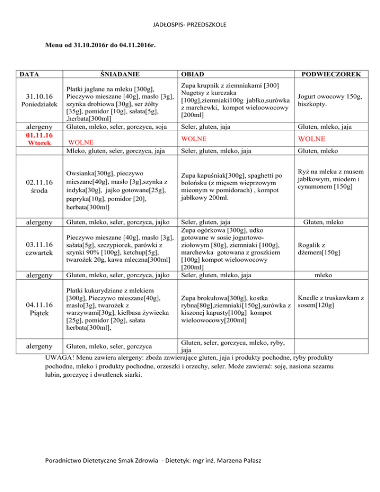JADŁOSPIS- PRZEDSZKOLE Menu od 31.10.2016r do 04.11.2016r. ŚNIADANIE DATA 31.10.16 Poniedziałek alergeny 01.11.16 Wtorek Płatki jaglane na mleku [300g], Pieczywo mieszane [40g], masło [3g], szynka drobiowa [30g], ser żółty [35g], pomidor [10g], sałata[5g], ,herbata[300ml] Gluten, mleko, seler, gorczyca, soja WOLNE Mleko, gluten, seler, gorczyca, jaja OBIAD Zupa krupnik z ziemniakami [300] Nugetsy z kurczaka [100g],ziemniaki100g jabłko,surówka z marchewki, kompot wieloowocowy [200ml] Jogurt owocowy 150g, biszkopty. Seler, gluten, jaja Gluten, mleko, jaja WOLNE WOLNE Seler, gluten, mleko, jaja Gluten, mleko Owsianka[300g], pieczywo mieszane[40g], masło [3g],szynka z indyka[30g], jajko gotowane[25g], papryka[10g], pomidor [20], herbata[300ml] Zupa kapuśniak[300g], spaghetti po bolońsku (z mięsem wieprzowym mieonym w pomidorach) , kompot jabłkowy 200ml. alergeny Gluten, mleko, seler, gorczyca, jajko 03.11.16 czwartek Pieczywo mieszane [40g], masło [3g], sałata[5g], szczypiorek, parówki z szynki 90% [100g], ketchup[5g], twarożek 20g, kawa mleczna[300ml] alergeny Gluten, mleko, seler, gorczyca, jajko Seler, gluten, jaja Zupa ogórkowa [300g], udko gotowane w sosie jogurtowoziołowym [80g], ziemniaki [100g], marchewka gotowana z groszkiem [100g] kompot wieloowocowy [200ml] Seler, gluten, mleko, jaja 04.11.16 Piątek Płatki kukurydziane z mlekiem [300g], Pieczywo mieszane[40g], masło[3g], twarożek z warzywami[30g], kiełbasa żywiecka [25g], pomidor [20g], sałata herbata[300ml], 02.11.16 środa PODWIECZOREK Zupa brokułowa[300g], kostka rybna[80g],ziemniaki[150g],surówka z kiszonej kapusty[100g] kompot wieloowocowy[200ml] Ryż na mleku z musem jabłkowym, miodem i cynamonem [150g] Gluten, mleko Rogalik z dżemem[150g] mleko Knedle z truskawkam z sosem[120g] Gluten, seler, gorczyca, mleko, ryby, jaja UWAGA! Menu zawiera alergeny: zboża zawierające gluten, jaja i produkty pochodne, ryby produkty pochodne, mleko i produkty pochodne, orzeszki i orzechy, seler. Może zawierać: soję, nasiona sezamu łubin, gorczycę i dwutlenek siarki. alergeny Gluten, mleko, seler, gorczyca Poradnictwo Dietetyczne Smak Zdrowia - Dietetyk: mgr inż. Marzena Pałasz