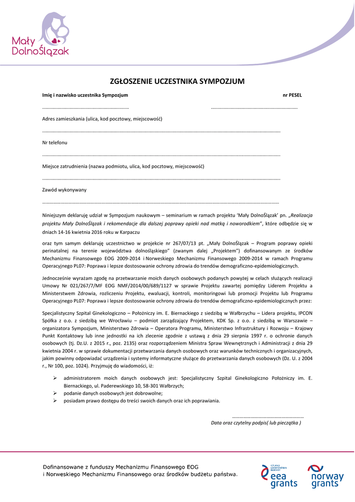 ZGŁOSZENIE UCZESTNIKA SYMPOZJUM Imię i nazwisko uczestnika Sympozjum ................................................................ nr PESEL ................................................................ Adres zamieszkania (ulica, kod pocztowy, miejscowość) ................................................................................................................................................................................ Nr telefonu ................................................................................................................................................................................ Miejsce zatrudnienia (nazwa podmiotu, ulica, kod pocztowy, miejscowość) ................................................................................................................................................................................ Zawód wykonywany ………………………………………………………………………………………………………………………………………………………………………… Niniejszym deklaruję udział w Sympozjum naukowym – seminarium w ramach projektu ‘Mały DolnoŚlązak’ pn. „Realizacja projektu Mały DolnoŚlązak i rekomendacje dla dalszej poprawy opieki nad matką i noworodkiem”, które odbędzie się w dniach 14-16 kwietnia 2016 roku w Karpaczu oraz tym samym deklaruję uczestnictwo w projekcie nr 267/07/13 pt. „Mały DolnoŚlązak – Program poprawy opieki perinatalnej na terenie województwa dolnośląskiego” (zwanym dalej „Projektem”) dofinansowanym ze środków Mechanizmu Finansowego EOG 2009-2014 i Norweskiego Mechanizmu Finansowego 2009-2014 w ramach Programu Operacyjnego PL07: Poprawa i lepsze dostosowanie ochrony zdrowia do trendów demograficzno-epidemiologicznych. Jednocześnie wyrażam zgodę na przetwarzanie moich danych osobowych podanych powyżej w celach służących realizacji Umowy Nr 021/267/7/MF EOG NMF/2014/00/689/1127 w sprawie Projektu zawartej pomiędzy Liderem Projektu a Ministerstwem Zdrowia, rozliczeniu Projektu, ewaluacji, kontroli, monitoringowi lub promocji Projektu lub Programu Operacyjnego PL07: Poprawa i lepsze dostosowanie ochrony zdrowia do trendów demograficzno-epidemiologicznych przez: Specjalistyczny Szpital Ginekologiczno – Położniczy im. E. Biernackiego z siedzibą w Wałbrzychu – Lidera projektu, IPCON Spółka z o.o. z siedzibą we Wrocławiu – podmiot zarządzający Projektem, KDK Sp. z o.o. z siedzibą w Warszawie – organizatora Sympozjum, Ministerstwo Zdrowia – Operatora Programu, Ministerstwo Infrastruktury i Rozwoju – Krajowy Punkt Kontaktowy lub inne jednostki na ich zlecenie zgodnie z ustawą z dnia 29 sierpnia 1997 r. o ochronie danych osobowych (tj. Dz.U. z 2015 r., poz. 2135) oraz rozporządzeniem Ministra Spraw Wewnętrznych i Administracji z dnia 29 kwietnia 2004 r. w sprawie dokumentacji przetwarzania danych osobowych oraz warunków technicznych i organizacyjnych, jakim powinny odpowiadać urządzenia i systemy informatyczne służące do przetwarzania danych osobowych (Dz. U. z 2004 r., Nr 100, poz. 1024). Przyjmuję do wiadomości, iż: administratorem moich danych osobowych jest: Specjalistyczny Szpital Ginekologiczno Położniczy im. E. Biernackiego, ul. Paderewskiego 10, 58-301 Wałbrzych; podanie danych osobowych jest dobrowolne; posiadam prawo dostępu do treści swoich danych oraz ich poprawiania. …………………….…………………………… Data oraz czytelny podpis( lub pieczątka ) Imię i nazwisko uczestnika Sympozjum …………………………………………………………………………… Wyrażam zgodę na wykorzystywanie i rozpowszechnianie mojego wizerunku, w tym w formie przetworzonej, przez Specjalistyczny Szpital Ginekologiczno – Położniczy im. E. Biernackiego z siedzibą w Wałbrzychu – Lidera Projektu, KDK Sp. z o.o. z siedzibą w Warszawie – organizatora Sympozjum oraz Operatora Programu – Ministerstwo Zdrowia w następujących celach i na następujących polach eksploatacji: 1) 2) 3) 4) 5) 6) 7) 8) 9) utrwalanie lub zwielokrotnianie w całości lub w części jakimikolwiek środkami i w jakiejkolwiek formie, niezależnie od formatu, systemu lub standardu, w tym techniką drukarską, techniką reprograficzną, techniką cyfrową lub poprzez wprowadzanie do pamięci komputera; wprowadzanie do obrotu, użyczenie, najem lub dzierżawa oryginału lub egzemplarzy; publiczne rozpowszechnianie, w szczególności publiczne wyświetlanie, odtwarzanie, nadawanie i reemitowanie w dowolnym systemie lub standardzie, a także publiczne udostępnianie w taki sposób, aby każdy mógł mieć do nich dostęp w miejscu i czasie przez siebie wybranym; wprowadzanie do sieci multimedialnych oraz Internetu, w tym umieszczanie na stronie internetowej www.zdrowie.gov.pl; www.mz.gov.pl, www.eog.gov.pl, www.eeagrants.org; publikacja i wyświetlanie w całości lub w części w Internecie i innych mediach w związku z informacją i promocją Projektu; umieszczanie w publikacjach drukowanych (w tym m.in. ulotki, foldery, plakaty) związanych z informacją i promocją Projektu; umieszczanie w publikacjach elektronicznych oraz aplikacjach elektronicznych związanych z informacją i promocją Projektu; umieszczanie w prezentacjach i materiałach prasowych (w tym m. in. informacje prasowe, ogłoszenia prasowe, artykuły sponsorowane) związanych z informacją i promocją Projektu; umieszczanie w spotach i filmach reklamowych związanych z informacją i promocją Projektu. ……………………………………… Data oraz czytelny podpis ( lub pieczątka) Planowanie wyżywienia na Sympozjum naukowe - seminarium w ramach projektu ‘Mały DolnoŚlązak’ pn. „Realizacja projektu Mały DolnoŚlązak i rekomendacje dla dalszej poprawy opieki nad matką i noworodkiem” Szanowni Państwo, W trosce o Państwa zdrowie i zachowanie preferencji żywieniowych, p