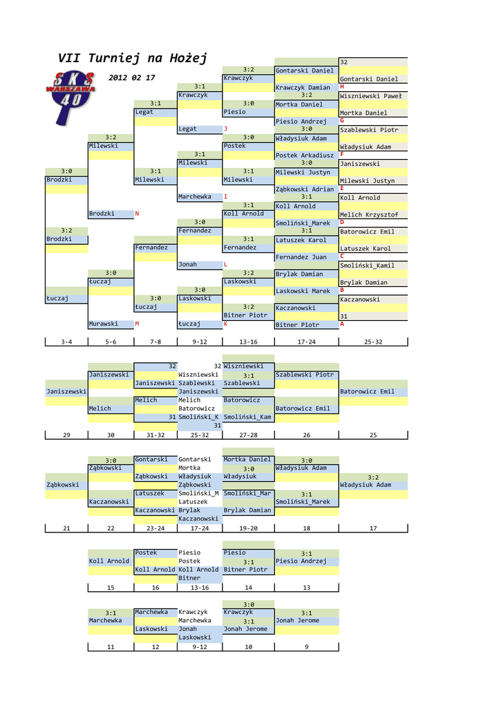 VII Turniej na Hożej 2012 02 17 3:1 Legat 2 3:1 Krawczyk 2 Legat 3:2 Milewski 2 3:0 Brodzki 3:1 Milewski 3:1 Milewski 1 Marchewka Brodzki N 3:0 Fernandez 1 3:2 Brodzki 1 Fernandez 2 Jonah 3:0 Łuczaj 1 Łuczaj Murawski 3-4 5-6 3:0 Łuczaj 3:0 Laskowski 2 M Łuczaj 7-8 32 Janiszewski 2 Janiszewski 2 Janiszewski 1 Melich 1 Melich 2 31 1 1 29 30 31-32 21 3:0 Piesio J 3:0 Postek 2 3:1 Milewski I 3:1 Koll Arnold 2 3:1 Fernandez Gontarski Daniel 2 Krawczyk Damian 3:2 Mortka Daniel 2 Piesio Andrzej 3:0 Władysiuk Adam 2 Postek Arkadiusz 3:0 Milewski Justyn 1 Ząbkowski Adrian 3:1 Koll Arnold 1 Smoliński_Marek 3:1 Latuszek Karol 2 Fernandez Juan L 3:2 Laskowski 1 Brylak Damian 2 Laskowski Marek 3:2 Bitner Piotr K Kaczanowski 2 Bitner Piotr 13-16 17-24 32 Wiszniewski Szablewski Janiszewski Melich Batorowicz Smoliński_K 31 25-32 Wiszniewski 3:1 Szablewski Gontarski 2 Ząbkowski 1 Latuszek Kaczanowski 1 Kaczanowski 2 1 22 23-24 Gontarski Mortka Władysiuk Ząbkowski Smoliński_M Latuszek Brylak Kaczanowski 17-24 Mortka Daniel 3:0 Władysiuk Adam 3:0 Władysiuk 2 Postek Koll Arnold 1 Koll Arnold 2 2 15 16 Piesio Piesio Postek 3:1 Koll Arnold Bitner Piotr Bitner 13-16 14 3:0 Ząbkowski 2 Ząbkowski 1 9-12 3:2 Krawczyk 1 3:1 Marchewka 1 11 Marchewka 1 Laskowski 1 12 Krawczyk Marchewka Jonah Laskowski 9-12 32 2 Gontarski Daniel H Wiszniewski Paweł 2 Mortka Daniel G Szablewski Piotr 2 Władysiuk Adam F Janiszewski 2 Milewski Justyn E Koll Arnold 1 Melich Krzysztof D Batorowicz Emil 2 Latuszek Karol C Smoliński_Kamil 2 Brylak Damian B Kaczanowski 1 31 A 25-32 Szablewski Piotr 2 Batorowicz Emil 2 Batorowicz Batorowicz Emil Smoliński_Kam 1 27-28 26 Smoliński_Mar 3:1 Smoliński_Marek Brylak Damian 1 19-20 3:0 Krawczyk 3:1 Jonah Jerome 10 18 3:1 Piesio Andrzej 1 13 3:1 Jonah Jerome 2 9 25 3:2 Władysiuk Adam 1 17 Janczewski Grzegorz 32 Gontarski Daniel Bitner Piotr Wiszniewski Paweł Laskowski Marek Mortka Daniel Marchewka Adam Fernandez Juan Szablewski Piotr Władysiuk Adam Murawski Michał Legat Mateusz Janiszewski Stanisław Smoliński_Marek Milewski Justyn Brodzki Maciej Koll Arnold Melich Krzysztof Ząbkowski Adrian Łuczaj Marek Batorowicz Emil Latuszek Karol Postek Arkadiusz Jonah Jerome Smoliński_Kamil Brylak Damian Piesio Andrzej Krawczyk Damian Kaczanowski Stanisław 31 Barnaś Paweł 1 3:0 2 3:2 2 3:2 2 3:0 Janczewski 1 Janczewski 1 Bitner A Laskowski 2 Marchewka B Fernandez 1 2 3:2 Murawski C 2 3:0 Legat 1 1 3:0 Smoliński_M D 1 3:0 Brodzki 1 1 3:1 Ząbkowski E 2 3:1 Łuczaj 1 1 Postek F 2 3:0 Jonah 1 1 3:0 Piesio G 2 3:0 Krawczyk 1 2 Barnaś H 2 3:0 Marchewka 3:2 Murawski 1 3:0 Legat 3:1 Brodzki 1 3:0 Łuczaj 3:0 Jonah 2 3:0 Barnaś 1 2 3:0 3 Janczewski 4 5 1 I 6 3:2 7 Janczewski 8 9 10 11 Murawski M 12 13 J 14 3:1 15 Janczewski 16 17 1 18 3:2 19 Brodzki 20 21 2 K 22 3:0 23 Barnaś 24 25 26 3:1 27 Barnaś N 28 29 L 30 31 32 Janczewski Grzegorz Barnaś Paweł Brodzki Maciej Łuczaj Marek Milewski Justyn Murawski Michał Fernandez Juan Legat Mateusz Jonah Jerome Krawczyk Damian Marchewka Adam Laskowski Marek Piesio Andrzej Bitner Piotr Koll Arnold Postek Arkadiusz Władysiuk Adam Smoliński_Marek Mortka Daniel Brylak Damian Ząbkowski Adrian Kaczanowski Gontarski Daniel Latuszek Karol Batorowicz Emil Szablewski Piotr Wiszniewski Paweł Smoliński_Kamil Janiszewski Melich Krzysztof wyniki turnieju 1-2 3:0 Milewski 1 Milewski Murawski 5-6 Legat Fernandez 7-8 Fernandez 2 Mortka Brylak 19-20 Mortka 1 Gontarski Latuszek 23-24 Gontarski 1 Wiszniewsk Wiszniewsk Smoliński_ 1 27-28 32 31 31-32 Janczewski Barnaś Brodzki Milewski Fernandez Postek Jonah Marchewka Wiszniewski Piesio Łuczaj Murawski Legat Ząbkowski Krawczyk Bitner Gontarski Kaczanowski Melich Janiszewski Władysiuk Batorowicz Brylak Laskowski Mortka Smoliński_K Latuszek Szablewski Smoliński_M Koll Arnold 31 32 lista startowa
