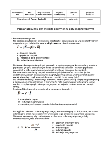 Nr ćwiczenia 206 data 19.03.2013 Imię i nazwisko Adrian Moczulski Prowadzący: dr Roman Cegielski Wydział Elektryczny Semestr II grupa: I2 nr lab.: 5 przygotowanie wykonanie ocena Pomiar stosunku e/m metodą odchyleń w polu magnetycznym 1. Podstawy teoretyczne. Na posiadającą ładunek elektryczny cząsteczkę, poruszającą się w polu elektrycznym i magnetycznym działa siła, zwana siłą Lorentza, określona wzorem: & q - ładunek cząstki v - prędkość cząstki E - natężenie pola elektrycznego B - indukcja magnetyczna Działanie obu wymienionych pól, prowadzi w ogólnym przypadku do zmiany wektora prędkości (w polu elektrycznym może się zmieniać kierunek i wartość prędkości, natomiast w polu magnetycznym wartość prędkości pozostaje bez zmian). Badanie zachowania się cząstek naładowanych (elektronów, protonów, jonów dodatnich) w polach elektrycznym i magnetycznym pozwala wyznaczyć tak zwany nabój właściwy, czyli stosunek ładunku cząstki, do jej masy (q/m). Do określenia naboju właściwego elektronu można posłużyć się lampą oscyloskopową z odchylaniem magnetycznym w kierunku Y. Pole magnetyczne wytwarzane jest w wyniku przepływu prądu elektrycznego przez uzwojenie umieszczone na zewnątrz lampy. Indukcja B jest wprost proporcjonalna do natężenia prądu I: & I - natężenie prądu B - indukcja magnetyczna c - współczynnik proporcjonalności (określany empirycznie) Po wyjściu z obszaru pola magnetycznego, elektrony biegną po linii prostej, na końcu uderzając w ekran fluorescencyjny wywołując jego świecenie w punkcie uderzenia. Warunek równowagi siły odchylającej w obszarze pola magnetycznego i siły bezwładności wyraża się równaniem: & R - promień krzywizny toru v - prędkość cząstki m - masa cząstki e - ładunek cząstki B - indukcja magnetyczna Szukaną wartość e/m możemy przedstawić w postaci: & Prędkość możemy wyrazić przy pomocy napięcia, przyrównując energię kinetyczną do pracy wykonanej przez pole elektryczne pomiędzy katodą i anodą: & & & & Biorąc pod uwagę, że w warunkach doświadczenia y << l oraz d << R można napisać: & Zatem promień krzywizny R można zapisać w postaci: & l - odległość ekranu lampy oscyloskopowej od środka cewki d - średnica cewki odchylającej y - odchylenie plamki na ekranie względem położenia przy B = 0 & Ostateczne wyrażenie, z którego możemy obliczyć stosunek e/m zostało przekształcone do postaci: & Wielkość została podana i wynosi: (8,3 ± 0,1 )*1011 [A3 s kg-1 m-2 ] 2. Wyniki pomiarów 3. Obliczenia 4. Dyskusja błędów i wyniki. Z uwagi na dużą liczbę pomiarów - dokonanie 3 niezależnych pomiarów dla każdego z 22 natężeń prądu cewek odchylających (czyli ogólnie 66 pomiarów), wartość stosunku e/m można obliczyć na podstawie średniej arytmetycznej z dokonanych pomiarów. Dokładnością pomiaru w takim wypadu będzie wartość odchylenia standardowego od średniej dokonanych pomiarów. Otrzymane wartości pomiaru i błędu pomiarowego: • Średnia arytmetyczna z otrzymanych po obliczeniach wyników: 1,70835 · 1011 [C/kg] • Odchylenie standardowe od średniej uzyskanych wyników: 0,127307715 · 1011 [C/kg] Zaokrąglone wartości pomiaru i błędu pomiarowego: • Średnia arytmetyczna z otrzymanych po obliczeniach wyników: 1,71 · 1011 [C/kg] • Odchylenie standardowe od średniej uzyskanych wyników: 0,13 · 1011 [C/kg] Wartość stosunku e/m elektronu zbadana metodą odchyleń w polu magnetycznym e/m = (1,71 ± 0,13) · 1011 [C/kg] wartość tablicowa: (1,758882012 ± 0,00000015) · 1011 C/kg 5. Wnioski Na podstawie dokonanych pomiarów oraz przeprowadzonych obliczeń, z powodzeniem udało się wyznaczyć stosunek ładunku elektronu do jego masy, czyli nabój właściwy elektronu. Błąd względny, jakim obarczona jest podana wartość to zaledwie 8%, co jest zadowalającą wartością, świadczącą o precyzyjnym dokonaniu pomiarów. Różnica pomiędzy wartością tablicową, a uzyskanym wynikiem, wynosząca zaledwie 2% świadczy o rzetelnym przeprowadzeniu doświadczenia. Uzyskano wartość bardzo zbliżoną do wartości tablicowej.