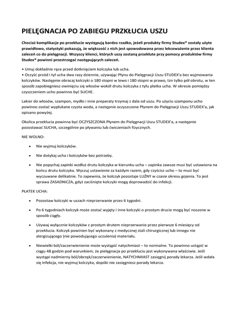 PIELĘGNACJA PO ZABIEGU PRZKŁUCIA USZU Chociaż komplikacje po przekłucie występują bardzo rzadko, jeżeli produkty firmy Studex® zostały użyte prawidłowo, statystyki pokazują, że większośd z nich jest spowodowana przez lekceważenie przez klienta zaleceo co do pielęgnacji. Wszyscy klienci, których uszy zostaną przekłute przy pomocy produktów firmy Studex® powinni przestrzegad następujących zaleceo. • Umyj dokładnie ręce przed dotknięciem kolczyka lub ucha. • Oczyśd przód i tył ucha dwa razy dziennie, używając Płynu do Pielęgnacji Uszu STUDEX'a bez wyjmowania kolczyków. Następnie obracaj kolczyki o 180 stopni w lewo i 180 stopni w prawo, tzn tylko pół obrotu, w ten sposób zapobiegniesz owinięciu się włosów wokół drutu kolczyka z tyłu płatka ucha. W okresie pomiędzy czyszczeniem ucho powinno byd SUCHE. Lakier do włosów, szampon, mydło i inne preparaty trzymaj z dala od uszu. Po użyciu szamponu ucho powinno zostad wypłukane czysta woda, a następnie oczyszczone Płynem do Pielęgnacji Uszu STUDEX'a, jak opisano powyżej. Okolica przekłucia powinna byd OCZYSZCZONA Płynem do Pielęgnacji Uszu STUDEX'a, a następnie pozostawad SUCHA, szczególnie po pływaniu lub dwiczeniach fizycznych. NIE WOLNO: Nie wyjmuj kolczyków. Nie dotykaj ucha i kolczyków bez potrzeby. Nie popychaj zapinki wzdłuż drutu kolczyka w kierunku ucha – zapinka zawsze musi byd ustawiona na koocu drutu kolczyka. Wyczuj ustawienie za każdym razem, gdy czyścisz ucho – to musi byd wyczuwane delikatnie. To zapewnia, że kolczyk pozostaje LUŹNY w czasie okresu gojenia. To jest sprawa ZASADNICZA, gdyż zaciśnięte kolczyki mogą doprowadzid do infekcji. PŁATEK UCHA: Pozostaw kolczyki w uszach nieprzerwanie przez 6 tygodni. Po 6 tygodniach kolczyk może zostad wyjęty i inne kolczyki o prostym drucie mogą byd noszone w sposób ciągły. Używaj wyłącznie kolczyków z prostym drutem nieprzerwanie przez pierwsze 6 miesięcy od przekłucia. Kolczyk powinien byd wykonany z medycznej stali chirurgicznej lub innego nie alergizującego (nie powodującego uczulenia) materiału. Niewielki ból/zaczerwienienie może wystąpid natychmiast – to normalne. To powinno ustąpid w ciągu 48 godzin pod warunkiem, że pielęgnacja po przekłuciu jest wykonywana właściwie. Jeśli wystąpi nadmierny ból/obrzęk/zaczerwienienie, NATYCHMIAST zasięgnij porady lekarza. Jeśli wdała się infekcja, nie wyjmuj kolczyka, dopóki nie zasięgniesz porady lekarza. CHRZĄSTKA UCHA: Pozostaw kolczyki w uszach nieprzerwanie przez 12 tygodni. Po 12 tygodniach kolczyk może zostad wyjęty i inne kolczyki z prostym drutem mogą byd noszone w sposób ciągły. Używaj wyłącznie kolczyków z prostym drutem, nieprzerwanie przez pierwsze 12 miesięcy od przekłucia. Kolczyk powinien byd wykonany z medycznej stali chirurgicznej lub innego nie alergizującego (nie powodującego uczulenia) materiału. Z powodu właściwości chrząstki ucha, szczególna dbałośd powinna byd zachowana w okresie gojenia. Niewielki ból/zaczerwienienie może wystąpid natychmiast – to normalne. To powinno ustąpid w ciągu 48 godzin pod warunkiem, że pielęgnacja po przekłuciu jest wykonywana właściwie. Jeśli wystąpi nadmierny ból/obrzęk/zaczerwienienie, NATYCHMIAST zasięgnij porady lekarza. Jeśli wdała się infekcja, nie wyjmuj kolczyka, dopóki nie zasięgniesz porady lekarza. WAŻNE: Zaniedbanie właściwego postępowania zgodnie z Instrukcją Pielęgnacji Uszu po Przekłuciu lub nie zasięgnięcie porady medycznej NATYCHMIAST gdy pojawi się problem, może spowodowad trwałe uszkodzenie chrząstki ucha.