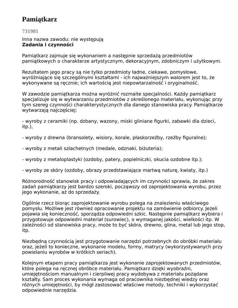 Pamiątkarz 731901 Inna nazwa zawodu: nie występują Zadania i czynności Pamiątkarz zajmuje się wykonaniem a następnie sprzedażą przedmiotów pamiątkowych o charakterze artystycznym, dekoracyjnym, zdobniczym i użytkowym. Rezultatem jego pracy są nie tylko przedmioty ładne, ciekawe, pomysłowe, wyróżniające się szczególnymi kształtami - ich najważniejszym walorem jest to, że wykonywane są ręcznie; ich wartością jest niepowtarzalność i oryginalność. W zawodzie pamiątkarza można wyróżnić rozmaite specjalności. Każdy pamiątkarz specjalizuje się w wytwarzaniu przedmiotów z określonego materiału, wykonując przy tym szereg czynności charakterystycznych dla danego stanowiska pracy. Pamiątkarze wytwarzają najczęściej: - wyroby z ceramiki (np. dzbany, wazony, miski gliniane figurki, zabawki dla dzieci, itp.), - wyroby z drewna (bransolety, wisiory, korale, płaskorzeźby, rzeźby figuralne); - wyroby z metali szlachetnych (medale, odznaki, biżuteria); - wyroby z metaloplastyki (ozdoby, patery, popielniczki, okucia ozdobne itp.); - wyroby ze skóry (ozdoby, obrazy przedstawiające martwą naturę, kwiaty, itp.) Różnorodność stanowisk pracy i odpowiadających im czynności sprawia, że zakres zadań pamiątkarzy jest bardzo szeroki, począwszy od zaprojektowania wyrobu, przez jego wykonanie, aż do sprzedaży. Ogólnie rzecz biorąc zaprojektowanie wyrobu polega na znalezieniu właściwego pomysłu. Możliwe jest również opracowanie projektu na zamówienie odbiorcy. Jeżeli pojawia się konieczność, sporządza odpowiedni szkic. Następnie pamiątkarz wybiera i przygotowuje odpowiedni materiał (surowiec), o wymaganej jakości, wielkości itp. W zależności od stanowiska pracy, może to być skóra, drewno, glina, metal lub jego stop, itp. Niezbędną czynnością jest przygotowanie narzędzi potrzebnych do obróbki materiału oraz, jeżeli to konieczne, wykonanie modelu, formy, matrycy (wykorzystywanych przy powielaniu wyrobów w krótkich seriach). Kolejnym etapem pracy pamiątkarza jest wykonanie zaprojektowanych przedmiotów, które polega na ręcznej obróbce materiału. Pamiątkarz dzięki wyobraźni, umiejętnościom manualnym i cierpliwej pracy wydobywa z materiału pożądane kształty. Sam proces wykonania wymaga od pracownika niezbędnej wiedzy oraz różnych umiejętności, by mógł zastosować właściwe metody, techniki i wykorzystać odpowiednie narzędzia. Bardzo ważnym elementem przy wykonywaniu pamiątek jest właściwa kompozycja, czyli zachowanie odpowiednich wielkości, proporcji i kształtów oraz nadanie wyrobom cech indywidualnych. Ukoronowaniem całego procesu wykonania jest opracowanie powierzchni wyrobu, uzależnione od materiału, z którego zrobiono dany przedmiot. Zwykle opracowanie polega na wykańczaniu konturów, poprawianiu ewentualnych niedokładności, grawerowaniu, zdobieniu oraz wyrównywaniu powierzchni poprzez polerowanie, szlifowanie, nasycanie odpowiednimi substancjami chemicznymi, malowanie, itp. Ostatecznie, odpowiednio wykończony przedmiot pamiątkarz sprzedaje bezpośrednio zainteresowanemu odbiorcy (na targach, rynkach i innych przeznaczonych do tego miejscach), lub za pośrednictwem sklepów z pamiątkami, spółdzielni rzemieślniczych, czy różnych instytucji, takich jak „Cepelia” itp. Możliwe jest również wykonywanie pamiątek na zamówienie odbiorcy. Ważnym elementem pracy pamiątkarza jest ciągłe poszukiwanie nowych pomysłów i koncepcji.