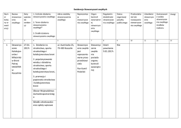 Ewidencja Stowarzyszeń zwykłych Num er kolej ny w ewid encji Nazwa stowarzysz enia zwykłego Daty wpisów do ewiden cji 1. Cel/cele działania stowarzyszenia zwykłego Adres siedziby stowarzyszenia zwykłego Reprezentac ja stowarzysze nia zwykłego Organ kontroli wewnętrzn ej stowarzysz enia zwykłego Regulamin działalności stowarzysze nia zwykłego Status organizacji pożytku publicznego Przekształce nie lub rozwiązanie stowarzysze nia zwykłego Likwidator stowarzysz enia zwykłego Zastosowani e wobec stowarzysze nia zwykłego środków nadzoru Uwagi 10 11 12 13 2. Teren działania stowarzyszenia zwykłego3) 3. Środki działania stowarzyszenia zwykłego 1 1 2 3 4 5 6 7 8 9 Stowarzys zenie Kolekcjon erów i Miłośnikó w Broni Palnej SHOOTER w Koszalinie 27.01. 2017r. 1. Działanie na strzelectwa, sportu strzeleckiego i kolekcjonerstwa broni ul. Austriacka 25, 75-430 Koszalin Stowarzysz enie zwykłe jest reprezento wane przez przedstawi ciela Stowarzys zenie zwykłe nie posiada organu kontroli wewnętrz nej Dzień powstania 9.01.2017r. Nie 2. popularyzowanie wiedzy z dziedziny strzelectwa, sportu strzeleckiego i kolekcjonerstwa broni, 3. promocja i popierania strzelectwa i kolekcjonerstwa broni Obszar Województwa Zachodniopomorskieg o Składki członkowskie oraz opłaty wpisowe Pan Kamil Polański