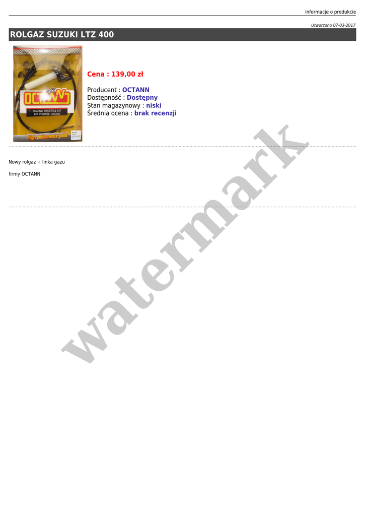 Informacje o produkcie Utworzono 07-03-2017 ROLGAZ SUZUKI LTZ 400 Cena : 139,00 zł Nowy rolgaz + linka gazu w at firmy OCTANN er m ar k Producent : OCTANN Dostępność : Dostępny Stan magazynowy : niski Średnia ocena : brak recenzji