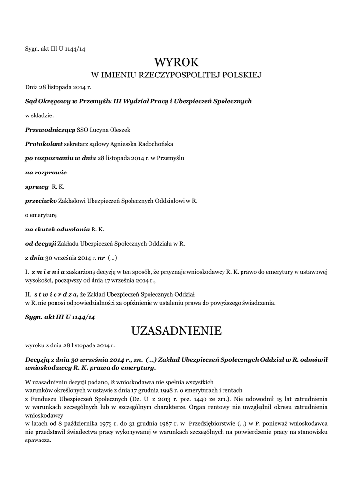 Sygn. akt III U 1144/14 WYROK W IMIENIU RZECZYPOSPOLITEJ POLSKIEJ Dnia 28 listopada 2014 r. Sąd Okręgowy w Przemyślu III Wydział Pracy i Ubezpieczeń Społecznych w składzie: Przewodniczący SSO Lucyna Oleszek Protokolant sekretarz sądowy Agnieszka Radochońska po rozpoznaniu w dniu 28 listopada 2014 r. w Przemyślu na rozprawie sprawy R. K. przeciwko Zakładowi Ubezpieczeń Społecznych Oddziałowi w R. o emeryturę na skutek odwołania R. K. od decyzji Zakładu Ubezpieczeń Społecznych Oddziału w R. z dnia 30 września 2014 r. nr (...) I. z m i e n i a zaskarżoną decyzję w ten sposób, że przyznaje wnioskodawcy R. K. prawo do emerytury w ustawowej wysokości, począwszy od dnia 17 września 2014 r., II. s t w i e r d z a, że Zakład Ubezpieczeń Społecznych Oddział w R. nie ponosi odpowiedzialności za opóźnienie w ustaleniu prawa do powyższego świadczenia. Sygn. akt III U 1144/14 UZASADNIENIE wyroku z dnia 28 listopada 2014 r. Decyzją z dnia 30 września 2014 r., zn. (...) Zakład Ubezpieczeń Społecznych Oddział w R. odmówił wnioskodawcy R. K. prawa do emerytury. W uzasadnieniu decyzji podano, iż wnioskodawca nie spełnia wszystkich warunków określonych w ustawie z dnia 17 grudnia 1998 r. o emeryturach i rentach z Funduszu Ubezpieczeń Społecznych (Dz. U. z 2013 r. poz. 1440 ze zm.). Nie udowodnił 15 lat zatrudnienia w warunkach szczególnych lub w szczególnym charakterze. Organ rentowy nie uwzględnił okresu zatrudnienia wnioskodawcy w latach od 8 października 1973 r. do 31 grudnia 1987 r. w Przedsiębiorstwie (...) w P. ponieważ wnioskodawca nie przedstawił świadectwa pracy wykonywanej w warunkach szczególnych na potwierdzenie pracy na stanowisku spawacza. Wnioskodawca R. K. w dniu 6 października 2014 r. złożył odwołanie od tej decyzji, domagając się jej zmiany. Na uzasadnienie podał, że decyzja jest dla niego krzywdząca. Przez cały okres zatrudnienia w Przedsiębiorstwie (...) w P., pracował w warunkach szczególnych jako spawacz. Okoliczność ta została potwierdzona świadectwem pracy. Dodatkowo odwołał się do zeznań świadków. W odpowiedzi na odwołanie organ rentowy wniósł o jego oddalenie z przyczyn, które stanowiły o wydaniu zaskarżonej decyzji. Ponownie stwierdzono, że wnioskodawca nie spełnia warunków do nabycia emerytury określonych w art. 184 ust. 1 i 2 w zw. z art. 27 i art. 32 ustawy z dnia 17 grudnia 1998 r. o emeryturach i rentach z Funduszu Ubezpieczeń Społecznych oraz w zw. z § 2 rozporządzenia Rady Ministrów z dnia 7 lutego 1983 r. w sprawie wieku emerytalnego dla pracowników zatrudnianych w szczególnych warunkach lub w szczególnym charakterze. Podniesiono, że spośród ustawowych warunków wnioskodawca wykazał 25-letni staż ubezpieczeniowy i nie przystąpił do otwartego funduszu emerytalnego. Natomiast na dzień złożenia wniosku emerytalnego nie udowodnił 15 lat pracy w warunkach szczególnych. Okresu zatrudnienia w latach od 8 października 1973 r. do 31 grudnia 1987 r. w Przedsiębiorstwie (...) w P. (14 lat, 2 miesiące i 24 dni) wnioskodawca nie potwierdził świadectwem wykonywania pracy w szczególnych warunkach. Za udowodnione przyjęto jedynie 6 lat, 7 miesięcy i 2 dni takiego zatrudnienia w Fabryce (...). Organ rentowy wskazał, że okresy pracy wykonywanej w warunkach szczególnych może potwierdzić jedynie zakład pracy, ewentualnie jego następca, na podstawie posiadanej dokumentacji i w ściśle określonej formie, zgodnie z § 2 ust. 2 powołanego rozporządzenia. Wnioskodawca przedstawił jedynie zwykłe świadectwa pracy. Sąd Okręgowy – Sąd Pracy i Ubezpieczeń Społecznych w P. ustalił następujący stan faktyczny: Wnioskodawca R. K. urodzony (...) wystąpił w dniu 17 września 2014 r. z wnioskiem o emeryturę, oświadczając że jest członkiem otwartego funduszu emerytalnego oraz że nie pozostaje w stosunku pracy. Na potwierdzenie okresów ubezpieczenia oraz charakteru zatrudnienia przedłożył świadectwa pracy, w tym świadectwo wykonywania pracy w szczególnych warunkach wystawione przez Fabrykę (...) SA z dnia 20 marca 2014 r. Decyzją z dnia 30 września 2014 r. ZUS O/R. odmówił wnioskodawcy prawa do emerytury. Organ rentowy nie uwzględnił okresu jego zatrudnienia w warunkach szczególnych w Przedsiębiorstwie (...) w P., gdyż nie przedstawił on świadectwa pracy wykonywanej w warunkach szczególnych. Natomiast za udowodnione przyjęto wnioskodawcy okresy składkowe w wymiarze 21 lat i 8 dni, okresy nieskładkowe w wymiarze 2 miesięcy i 18 dni oraz okresy uzupełniające (rola) w wymiarze 4 lata i 17 dni. Dowód: 1. Akta organu rentowego (emerytalne): - wniosek o emeryturę z dn. 17.09.2014 r. - decyzja odmowna z dn. 30.09.2014 r. Ponadto Sąd ustalił, że wnioskodawca R. K. w roku szkolnym 1972/73 ukończył zasadniczą szkołę zawodową o kierunku ślusarz-spawacz. W dniu 8 października 1973 r. został zaś zatrudniony w Przedsiębiorstwie (...) w P. na czas nieokreślony na stanowisku spawacza w Zakładzie (...). W tym zatrudnieniu pozostawał do 31 grudnia 1987 r. Pracował w brygadzie produkującej elementy instalacji grzewczych c.o. oraz wodno-kanalizacyjnych, wykonując wyłącznie prace spawacza. Przez okres kilku miesięcy, od 1 marca 1978 r. pracował jako spawacz przy produkcji pochłaniaczy – wentylatorów z blachy. Stąd w kolejnej umowie o pracę wskazano stanowisko blacharza-spawacza. Faktycznie jednak i przy tych robotach wykonywał wyłącznie prace spawalnicze. Uprawnienia spawacza gazowego były decydujące przy kwalifikowaniu go do tej pracy. Praca w Przedsiębiorstwie (...) w P. odbywała się w systemie brygadowym i rozdzielona była pomiędzy brygady wodno-kanalizacyjne, sanitarno-instalacyjne (centralnego ogrzewania) i elektryczne, które pracowały na budowach. Równocześnie w Przedsiębiorstwie funkcjonował Zakład (...), gdzie produkowano wszystkie elementy niezbędne do budowy kotłowni i instalacji grzewczych