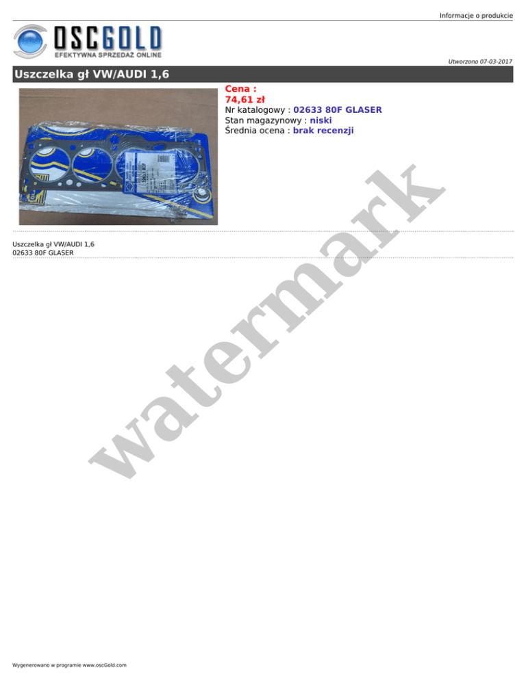 Informacje o produkcie Utworzono 07-03-2017 Uszczelka gł VW/AUDI 1,6 Cena : 74,61 zł w at Uszczelka gł VW/AUDI 1,6 02633 80F GLASER er m ar k Nr katalogowy : 02633 80F GLASER Stan magazynowy : niski Średnia ocena : brak recenzji Wygenerowano w programie www.oscGold.com