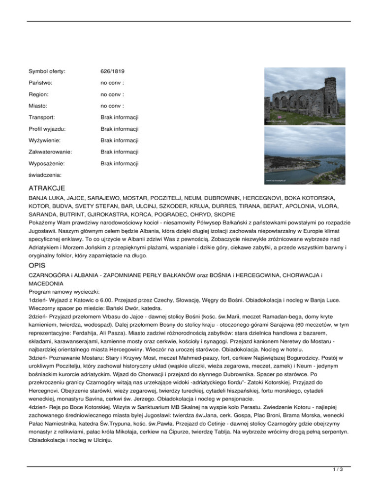 Symbol oferty: 626/1819 Państwo: no conv : Region: no conv : Miasto: no conv : Transport: Brak informacji Profil wyjazdu: Brak informacji Wyżywienie: Brak informacji Zakwaterowanie: Brak informacji Wyposażenie: Brak informacji świadczenia: ATRAKCJE BANJA LUKA, JAJCE, SARAJEWO, MOSTAR, POCZITELJ, NEUM, DUBROWNIK, HERCEGNOVI, BOKA KOTORSKA, KOTOR, BUDVA, SVETY STEFAN, BAR, ULCINJ, SZKODER, KRUJA, DURRES, TIRANA, BERAT, APOLONIA, VLORA, SARANDA, BUTRINT, GJIROKASTRA, KORCA, POGRADEC, OHRYD, SKOPIE Pokażemy Wam prawdziwy narodowościowy kocioł - niesamowity Półwysep Bałkański z państewkami powstałymi po rozpadzie Jugosławii. Naszym głównym celem będzie Albania, która dzięki długiej izolacji zachowała niepowtarzalny w Europie klimat specyficznej enklawy. To co ujrzycie w Albanii zdziwi Was z pewnością. Zobaczycie niezwykle zróżnicowane wybrzeże nad Adriatykiem i Morzem Jońskim z przepięknymi plażami, wspaniałe i dzikie góry, ciekawe zabytki, a przede wszystkim barwny i oryginalny folklor, który zapamiętacie na długo. OPIS CZARNOGÓRA i ALBANIA - ZAPOMNIANE PERŁY BAŁKANÓW oraz BOŚNIA i HERCEGOWINA, CHORWACJA i MACEDONIA Program ramowy wycieczki: 1dzień- Wyjazd z Katowic o 6.00. Przejazd przez Czechy, Słowację, Węgry do Bośni. Obiadokolacja i nocleg w Banja Luce. Wieczorny spacer po mieście: Bański Dwór, katedra. 2dzień- Przyjazd przełomem Vrbasu do Jajce - dawnej stolicy Bośni (kośc. św.Marii, meczet Ramadan-bega, domy kryte kamieniem, twierdza, wodospad). Dalej przełomem Bosny do stolicy kraju - otoczonego górami Sarajewa (60 meczetów, w tym reprezentacyjne: Ferdahija, Ali Pasza). Miasto zadziwi różnorodnością zabytków: stara dzielnica handlowa z bazarem, składami, karawanserajami, kamienne mosty oraz cerkwie, kościoły i synagogi. Przejazd kanionem Neretwy do Mostaru najbardziej orientalnego miasta Hercegowiny. Wieczór na uroczej starówce. Obiadokolacja. Nocleg w hotelu. 3dzień- Poznawanie Mostaru: Stary i Krzywy Most, meczet Mahmed-paszy, fort, cerkiew Najświętszej Bogurodzicy. Postój w urokliwym Poczitelju, który zachował historyczny układ (wąskie uliczki, wieża zegarowa, meczet, zamek) i Neum - jedynym bośniackim kurorcie adriatyckim. Wjazd do Chorwacji i przejazd do słynnego Dubrownika. Spacer po starówce. Po przekroczeniu granicy Czarnogóry witają nas urzekające widoki -adriatyckiego fiordu”- Zatoki Kotorskiej. Przyjazd do Hercegnovi. Obejrzenie starówki, wieży zegarowej, twierdzy tureckiej, cytadeli hiszpańskiej, fortu morskiego, cytadeli weneckiej, monastyru Savina, cerkwi św. Jerzego. Obiadokolacja i nocleg w pensjonacie. 4dzień- Rejs po Boce Kotorskiej. Wizyta w Sanktuarium MB Skalnej na wyspie koło Perastu. Zwiedzenie Kotoru - najlepiej zachowanego średniowiecznego miasta byłej Jugosławi: twierdza św.Jana, cerk. Gospa, Plac Broni, Brama Morska, wenecki Pałac Namiestnika, katedra Św.Trypuna, kośc. św.Pawła. Przejazd do Cetinje - dawnej stolicy Czarnogóry gdzie obejrzymy monastyr z relikwiami, pałac króla Mikołaja, cerkiew na Ćipurze, twierdzę Tablja. Na wybrzeże wrócimy drogą pełną serpentyn. Obiadokolacja i nocleg w Ulcinju. 1/3 5dzień- Poznajemy czarnogórskie wybrzeże. Przejazd do Budvy. Spacer po otoczonej murami starówce: cytadela z muzeum morskim, katedra św.Jana, romański kośc.św.Maria in Punta, cerk.św.Trójcy. Wizyta na słynnej Slovenskiej Plaży. Z punktu widokowego obejrzymy -wizytówkę” Czarnogóry - wyspę Svety Stefan. Kolejną ciekawostką będzie zbudowany przez Wenecjan Stary Bar. Popołudnie spędzimy na jednej z czarnogórskich plaż nad Zatoką Valdanos otoczoną gajem oliwnym. Pod wieczór wrócimy do Ulcinja, by pospacerować uliczkami starego miasta. Obiadokolacja, nocleg. 6dzień- Przejazd nad Jez. Szkoderskie (ostatnia oaza pelikanów na południu Europy), podzielone pomiędzy Albanią i Czarnogórą. Przekroczenie granicy i zwiedzenie Szkodry - dawnej stolicy Ilirów. Spacer do twierdzy Rozafa, z której roztacza się wspaniała panorama miasta, jeziora oraz rzek Bojana i Drina. Rejs po jeziorze. Przejazd do Kruje (zamek, muzeum narodowego bohatera - Skanderbega) i Durres - największego kurortu Albanii. Obiadokolacja. Nocleg w hotelu. 7dzień- Poznajemy miasto: wykopaliska rzymskie (amfiteatr, forum, łaźnie), mury obronne, meczet Fatim. Relaks na piaszczystej plaży. Przejazd do Tirany. Obejrzymy tu: Plac Skanderbega, pomnik największego bohatera Albanii, meczet Etehem Beya, pałac ostatniego króla - Ahmeda beg Zoga, Wielki Park i Narodową Galerię Sztuki. Powrót do Durres. Obiadokolacja. 8dzień- Opuszczamy Durres. Malowniczą doliną rzeki Osum docieramy do Beratu u stóp gór Tomori (2414m.npm) - miasta muzeum (lista UNESCO). Obejrzymy m.in.: twierdzę, kościół św.Teodora, cerkiew św.Trójcy, meczet królewski. Przejazd do starożytnej Apolonii. Obejrzymy tu ruiny teatru, bazylikę, baptysterium, pałac biskupi, ruiny domów, mury obronne i inne fortyfikacje. Pod wieczór dotrzemy do morskiego kurortu Vlore. Zakwaterowanie w hotelu, obiadokolacja. Chętni wieczorny spacer nadmorskimi bulwarami. 9dzień- Rano zwiedzimy Vlorę: Muzeum Niepodległości, meczet Muradi, Park Nadziei. Przejazd wzdłuż zatoki Vlores do Przyl. Karaburun (granica Adriatyku i Morza Jońskiego). Kąpiele. Przejazd najpiękniejszą częścią albańskiego wybrzeża przez przeł. Llogara do najmodniejszego kurortu Albanii - Sarandy (-pod nosem” greckiej wyspy Korfu). Obiadokolacja, nocleg. 10dzień- Atrakcje kurortu piękne plaże, kąpiele, bulwar. Wizyta w kośc. św.Mikołaja XIw. Wycieczka do starożytnego Butrintu: amfiteatr, baptysterium z kolorowymi mozaikami, łaźnie z czasów rzymskich. Widoki na jez. Butrint i Korfu. Odwiedzimy urzekający Syriikalter (Błękitne Oko) - miejsce wypływu podziemnej rzeki z głębokiej jaskini. Powrót do Sarandy na obiadokolację i nocleg. 11dzień- Opuszczamy Sarandę. Doliną Driny (postój przy średniowiecz
