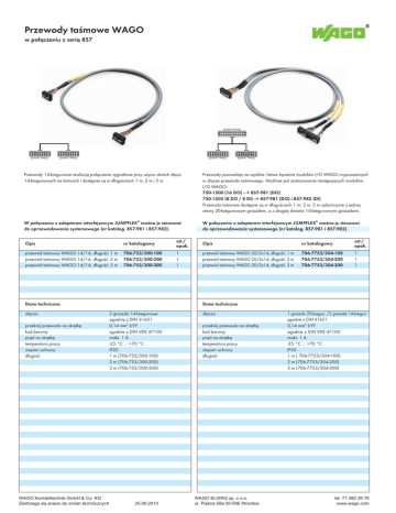 10 580 Przewody taśmowe WAGO w połączeniu z serią 857 gniazdo 20-bieg. gniazdo 14-bieg. gniazdo 14-bieg. gniazdo 14-bieg. gniazdo 14-bieg. Przewody 14-biegunowe realizują połączenie sygnałowe przy użyciu dwóch złącz 14-biegunowych na końcach i dostępne są w długościach 1 m, 2 m i 3 m. Przewody pozwalają na szybkie i łatwe łączenie modułów I/O WAGO wyposażonych w złącze przewodu taśmowego. Możliwe jest zastosowanie następujących modułów I/O WAGO: 750-1500 (16 DO) -- > 857-981 (DO) 750-1502 (8 DO / 8 DI) --> 857-981 (DO) i 857-982 (DI) Przewody taśmowe dostępne są w długościach 1 m, 2 m, 3 m zakończone z jednej strony 20-biegunowym gniazdem, a z drugiej dwoma 14-biegunowymi gniazdami. W połączeniu z adapterem interfejsowym JUMPFLEX® można je stosować do oprzewodowania systemowego (nr katalog. 857-981 i 857-982). W połączeniu z adapterem interfejsowym JUMPFLEX® można je stosować do oprzewodowania systemowego (nr katalog. 857-981 i 857-982). Opis nr katalogowy szt./ opak. Opis nr katalogowy szt./ opak. przewód taśmowy WAGO 14/14, długość: 1 m przewód taśmowy WAGO 14/14, długość: 2 m przewód taśmowy WAGO 14/14, długość: 3 m 706-753/300-100 706-753/300-200 706-753/300-300 1 1 1 przewód taśmowy WAGO 20/2x14, długość: 1 m przewód taśmowy WAGO 20/2x14, długość: 2 m przewód taśmowy WAGO 20/2x14, długość: 3 m 706-7753/304-100 706-7753/304-200 706-7753/304-300 1 1 1 Dane techniczne złącza przekrój przewodu na skrętkę kod barwny prąd na skrętkę temperatura pracy stopień ochrony długość Dane techniczne 2 gniazda 14-biegunowe zgodnie z DIN 41651 0,14 mm2 LiYY zgodnie z DIN VDE 47100 maks. 1 A -25 °C ... +70 °C IP20 1 m (706-753/300-100) 2 m (706-753/300-200) 3 m (706-753/300-300) złącza przekrój przewodu na skrętkę kod barwny prąd na skrętkę temperatura pracy stopień ochrony długość :$*2.RQWDNWWHFKQLN*PE+&R.* :$*2(/:$*VS]RR =DVWU]HJDVLĊSUDZRGR]PLDQWHFKQLF]Q\FK XO3LĊNQDD:URFáDZ 1 gniazdo 20-biegun. /2 gniazda 14-biegun. zgodnie z DIN 41651 0,14 mm2 LiYY zgodnie z DIN VDE 47100 maks. 1 A -25 °C ... +70 °C IP20 1 m ( 706-7753/304-100) 2 m (706-7753/304-200) 3 m (706-7753/304-300) WHO ZZZZDJRFRP