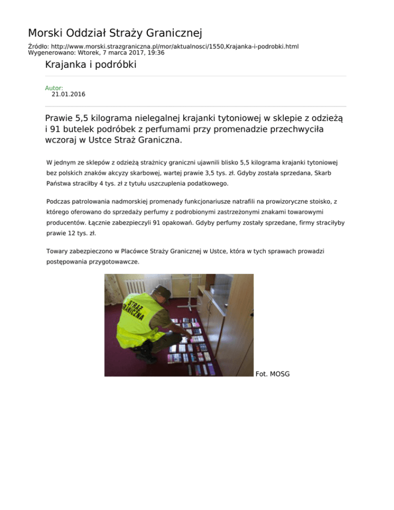 Morski Oddział Straży Granicznej Źródło: http://www.morski.strazgraniczna.pl/mor/aktualnosci/1550,Krajanka-i-podrobki.html Wygenerowano: Wtorek, 7 marca 2017, 19:36 Krajanka i podróbki Autor: 21.01.2016 Prawie 5,5 kilograma nielegalnej krajanki tytoniowej w sklepie z odzieżą i 91 butelek podróbek z perfumami przy promenadzie przechwyciła wczoraj w Ustce Straż Graniczna. W jednym ze sklepów z odzieżą strażnicy graniczni ujawnili blisko 5,5 kilograma krajanki tytoniowej bez polskich znaków akcyzy skarbowej, wartej prawie 3,5 tys. zł. Gdyby została sprzedana, Skarb Państwa straciłby 4 tys. zł z tytułu uszczuplenia podatkowego. Podczas patrolowania nadmorskiej promenady funkcjonariusze natrafili na prowizoryczne stoisko, z którego oferowano do sprzedaży perfumy z podrobionymi zastrzeżonymi znakami towarowymi producentów. Łącznie zabezpieczyli 91 opakowań. Gdyby perfumy zostały sprzedane, firmy straciłyby prawie 12 tys. zł. Towary zabezpieczono w Placówce Straży Granicznej w Ustce, która w tych sprawach prowadzi postępowania przygotowawcze. Fot. MOSG