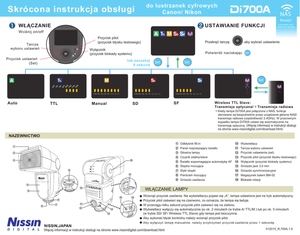 do lustrzanek cyfrowych Canon/ Nikon Skrócona instrukcja obsługi WŁĄCZANIE NAS Ready! USTAWIANIE FUNKCJI Compatible with Nissin Air System Wciśnij on/off Wyłącznik (przycisk blokady systemu) Set Przycisk ustawień (Set) 5 +0 .5 +1 .0 +1 .5 +2 .0 Przekręć tarczę -0 . 0 -1 .5 -1 .0 -2 . -2 .0 -1 .5 -1 .0 -0 .5 +0 .5 +1 .0 +1 .5 +2 .0 Przycisk pilot (przycisk błysku testowego) 1/128 1/64 1/32 1/16 1/ 8 1/ 4 1/ 2 1/ 1 Tarcza wyboru ustawień 1/128 1/64 1/32 1/16 1/ 8 1/ 4 1/ 2 1/ 1 lub zaczekaj 8 sekund Set Set aby wybrać ustawienie Potwierdź naciskając Set Set Auto Manual 1/128 1/64 1/32 1/16 1/ 8 1/ 4 1/ 2 1/ 1 SF SD .5 +0 .5 +1 .0 +1 .5 +2 .0 -0 .0 -1 .5 -1 .0 -2 .5 +0 .5 +1 .0 +1 .5 +2 .0 -0 .0 -1 .5 -1 .0 -2 .5 +0 .5 +1 .0 +1 .5 +2 .0 -2 1/128 1/64 1/32 1/16 1/ 8 1/ 4 1/ 2 1/ 1 1/128 1/64 1/32 1/16 1/ 8 1/ 4 1/ 2 1/ 1 TTL -0 .0 -1 .5 -1 .0 .5 +0 .5 +1 .0 +1 .5 +2 .0 -2 1/128 1/64 1/32 1/16 1/ 8 1/ 4 1/ 2 1/ 1 1/128 1/64 1/32 1/16 1/ 8 1/ 4 1/ 2 1/ 1 -0 .0 -1 .5 -1 .0 .5 +0 .5 +1 .0 +1 .5 +2 .0 -2 -0 .0 -1 .5 -1 .0 .5 +0 .5 +1 .0 +1 .5 +2 .0 -2 -0 .0 -1 .5 -1 .0 Set A B C 1/128 1/64 1/32 1/16 1/ 8 1/ 4 1/ 2 1/ 1 Wireless TTL Slave: Transmisja optyczna/*Transmisja radiowa *Kiedy lampa Di700A jest połączona z NAS, funkcje sterowane są bezpośrednio przez urządzenie główne NAS/ transmisja radiowa (częstotliwość 2.4GHz). W przeciwnym wypadku lampa Di700A ustawi się automatycznie na transmisję optyczną. (Więcej informacji w instrukcji obsługi na stronie www.nissindigital.com/download.html) NAZEWNICTWO 1 2 3 18 17 15 8 6 7 11 Tarcza wyboru ustawień 12 Przycisk ustawienia (set) 13 Przycisk pilot (przycisk błysku testowego) Światło wspomagające automatykę AF Stopka mocująca Styki stopki Pierścień mocujący 9 Gniazdo zasilacza 14 Wyłącznik (przycisk blokady systemu) 15 Gniazdo jack 3,5 mm 16 Gniazdo synchronizacyjne 17 Magazynek baterii BM-02 18 Blokada rotacji WŁĄCZANIE LAMPY 10 5 10 Wyświetlacz 2 Panel rozpraszający światło 3 Głowica lampy 4 Czujnik zdalny/slave 5 6 7 8 9 4 1 Odbłyśnik fill-in 11 12 14 13 16 Wcisnąć przycisk zasilania. Na wyświetlaczu pojawi się „A”, lampa ustawiona jest na tryb automatyczny. Przycisk pilot zaświeci się na czerwono, co oznacza, że lampa się ładuje. W przeciągu kilku sekund przycisk pilot zaświeci się na zielono. Wyświetlacz wyłączy się automatycznie po ok. 2 minutach (w trybie A/ TTL/M ) lub po ok. 5 minutach (w trybie SD/ SF/ Wireless TTL Slave) gdy lampa jest bezczynna. Aby wykonać błysk kontrolny należy wcisnąć przycisk pilot. Aby wyłączyć lampę manualnie, należy przytrzymać przycisk zasilania przez 1 sekundę. Więcej informacji w instrukcji obsługi na stronie www.nissindigital.com/download.html 012015_R.700A.1.0