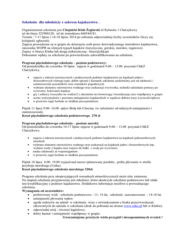 Szkolenie dla młodzieży z zakresu kajakarstwa . Organizatorem szkolenia jest Chojnicki Klub Żeglarski ul Rybacka 1 Charzykowy tel do biura 523988120, tel do instruktora 660544181. Termin : 7-11 lipiec i 14-18 lipiec 2014 po zebraniu odpowiedniej liczby uczestników (liczy się kolejność zgłoszeń). Zajęcia prowadzone są w grupie do dziesięciu osób przez doświadczonego instruktora kajakarstwa, ratownika WOPR na różnych typach kajaków (turystyczne, górskie, morskie, regatowe). Zapisy w biurze Klubu lub drogą elektroniczną : biuro@chkzpl . Dokonanie wpłaty za szkolenie po potwierdzeniu zakwalifikowania na szkolenie. Program pięciodniowego szkolenia – poziom podstawowy: Od poniedziałku do czwartku 10 lipiec zajęcia w godzinach 9.00 – 13.00 przystań ChKŻ Charzykowy. zajęcia z zakresu teoretycznych i praktycznych podstaw kajakarstwa na kajakach jedno i dwuosobowych różnego typu; dobór sprzętu i kierunek szkolenia uzależniony jest od zdolności i zainteresowań uczestników oraz warunków pogodowych wybrane elementy ratownictwa wodnego oraz asekuracji (wywrotka, techniki udzielania pomocy po wywrotce, holowanie kajaka) gry i zabawy (wszystko na wodzie!) z akcentem na równowagę i koordynację oraz współpracę w grupie ocena wytrzymałości i poziomu umiejętności kajakarskich w aspekcie doboru trasy wycieczki/spływu w przerwie zajęć herbata ze słodkim poczęstunkiem. Piątek 11 lipca 9.00- 16.00 spływ Brdą lub Chociną (w zależności od nabytych umiejętności i zainteresowań). Koszt pięciodniowego szkolenia podstawowego 270 zł Program pięciodniowego szkolenia – poziom morski: Od poniedziałku do czwartku 14-17 lipiec zajęcia w godzinach 9.00 – 13.00 przystań ChKŻ Charzykowy. zajęcia z zakresu teoretycznych i praktycznych podstaw kajakarstwa na kajakach jednoosobowych morskich wybrane elementy ratownictwa wodnego oraz asekuracji na kajakach jedno i dwuosobowych (np. wylanie wody z kajaka oraz wejście do łódki z wody po wywrotce) nauka eskimoski ze wspomaganiem w przerwie zajęć herbata ze słodkim poczęstunkiem Piątek 18 lipca 8.00- 19.00 wyjazd nad morze (planowany posiłek) , próby pływania w strefie przyboju morskiego (Ustka). Koszt pięciodniowego szkolenia morskiego 320zł. Program szkolenia przy niesprzyjających warunkach atmosferycznych może ulec zmianom. Na stopień szkolenia przyjmowana jest młodzież, która ukończyła szkolenie podstawowe lub zdała test kwalifikacyjny z podstaw kajakarstwa. Dodatkowe informacje możliwe u prowadzącego szkolenie. Wymagania od uczestników: preferowany wiek : szkolenie podstawowe - 11- 14 lat, szkolenie zaawansowane - 14-18 lat umiejętność pływania wpław zgoda rodziców na udział w szkoleniu wraz z oświadczeniem o braku przeciwwskazań zdrowotnych do udziału w szkoleniu (druk do pobrania na stronie www.chkz.pl lub w Klubie). odpowiedni strój , również kąpielowy. dobry humor i umiejętność współpracy w grupie. Gwarantujemy przeżycie wielu przygód i niezapomnianych wrażeń !