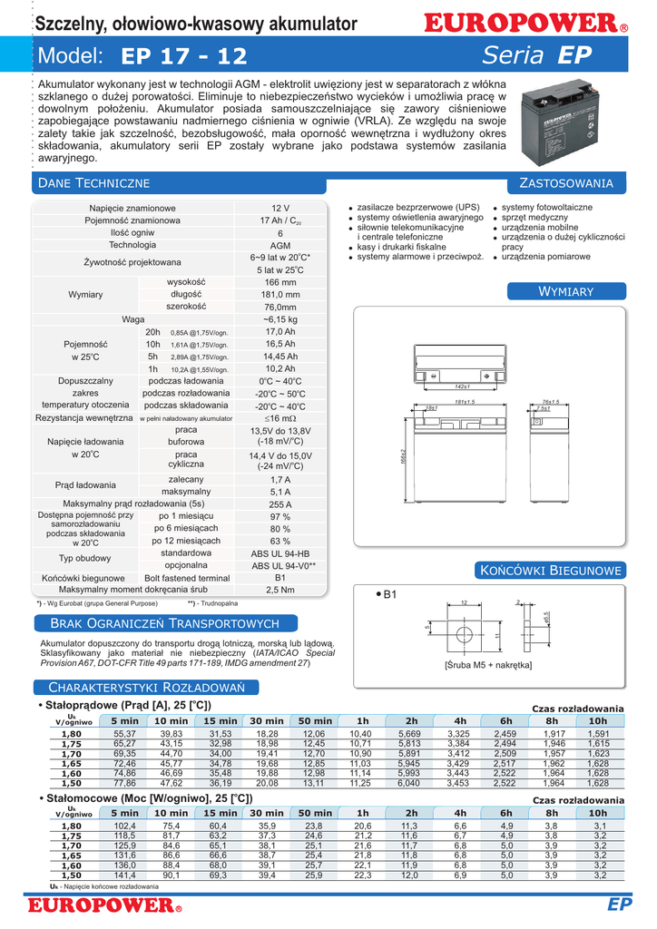 EUROPOWER Szczelny, o³owiowo-kwasowy akumulator Model: EP 17 - 12 R Seria EP Akumulator wykonany jest w technologii AGM - elektrolit uwiêziony jest w separatorach z w³ókna szklanego o du¿ej porowatoœci. Eliminuje to niebezpieczeñstwo wycieków i umo¿liwia pracê w dowolnym po³o¿eniu. Akumulator posiada samouszczelniaj¹ce siê zawory ciœnieniowe zapobiegaj¹ce powstawaniu nadmiernego ciœnienia w ogniwie (VRLA). Ze wzglêdu na swoje zalety takie jak szczelnoœæ, bezobs³ugowoœæ, ma³a opornoœæ wewnêtrzna i wyd³u¿ony okres sk³adowania, akumulatory serii EP zosta³y wybrane jako podstawa systemów zasilania awaryjnego. DANE TECHNICZNE ZASTOSOWANIA ¯ywotnoœæ projektowana wysokoœæ d³ugoœæ szerokoœæ Waga Pojemnoœæ o w 25 C Dopuszczalny zakres temperatury otoczenia Rezystancja wewnêtrzna 20h 0,85A @1,75V/ogn. 10h 1,61A @1,75V/ogn. 5h 2,89A @1,75V/ogn. 1h 10,2A @1,55V/ogn. podczas ³adowania podczas roz³adowania podczas sk³adowania w pe³ni na³adowany akumulator praca buforowa praca cykliczna Napiêcie ³adowania o w 20 C zalecany maksymalny Maksymalny pr¹d roz³adowania (5s) Dostêpna pojemnoœæ przy po 1 miesi¹cu samoroz³adowaniu po 6 miesi¹cach podczas sk³adowania po 12 miesi¹cach w 20oC standardowa Typ obudowy opcjonalna Koñcówki biegunowe Bolt fastened terminal Maksymalny moment dokrêcania œrub *) - Wg Eurobat (grupa General Purpose) WYMIARY 142±1 181±1.5 76±1.5 7.5±1 18±1 14,4 V do 15,0V o (-24 mV/ C) 1,7 A 5,1 A 255 A 97 % 80 % 63 % ABS UL 94-HB ABS UL 94-V0** B1 2,5 Nm Pr¹d ³adowania systemy fotowoltaiczne sprzêt medyczny urz¹dzenia mobilne urz¹dzenia o du¿ej cyklicznoœci pracy ! urz¹dzenia pomiarowe ! ! ! ! KOÑCÓWKI BIEGUNOWE B1 **) - Trudnopalna 2 12 ø5.5 Wymiary ! zasilacze bezprzerwowe (UPS) ! systemy oœwietlenia awaryjnego ! si³ownie telekomunikacyjne i centrale telefoniczne ! kasy i drukarki fiskalne ! systemy alarmowe i przeciwpo¿. 166±2 12 V 17 Ah / C20 6 AGM o 6~9 lat w 20 C* o 5 lat w 25 C 166 mm 181,0 mm 76,0mm ~6,15 kg 17,0 Ah 16,5 Ah 14,45 Ah 10,2 Ah o o 0 C ~ 40 C o o -20 C ~ 50 C o o -20 C ~ 40 C £16 mW 13,5V do 13,8V o (-18 mV/ C) Napiêcie znamionowe Pojemnoœæ znamionowa Iloœæ ogniw Technologia 11 5 BRAK OGRANICZEÑ TRANSPORTOWYCH Akumulator dopuszczony do transportu drog¹ lotnicz¹, morsk¹ lub l¹dow¹. Sklasyfikowany jako materia³ nie niebezpieczny (IATA/ICAO Special Provision A67, DOT-CFR Title 49 parts 171-189, IMDG amendment 27) [Œruba M5 + nakrêtka] CHARAKTERYSTYKI ROZ£ADOWAÑ o • Sta³opr¹dowe (Pr¹d [A], 25 [ C]) Uk V/ogniwo 1,80 1,75 1,70 1,65 1,60 1,50 5 min 55,37 65,27 69,35 72,46 74,86 77,86 10 min 39,83 43,15 44,70 45,77 46,69 47,62 15 min 31,53 32,98 34,00 34,78 35,48 36,19 30 min 18,28 18,98 19,41 19,68 19,88 20,08 50 min 12,06 12,45 12,70 12,85 12,98 13,11 1h 10,40 10,71 10,90 11,03 11,14 11,25 2h 5,669 5,813 5,891 5,945 5,993 6,040 4h 3,325 3,384 3,412 3,429 3,443 3,453 6h 2,459 2,494 2,509 2,517 2,522 2,522 Czas roz³adowania 8h 10h 1,917 1,591 1,946 1,615 1,957 1,623 1,962 1,628 1,964 1,628 1,964 1,628 50 min 23,8 24,6 25,1 25,4 25,7 25,9 1h 20,6 21,2 21,6 21,8 22,1 22,3 2h 11,3 11,6 11,7 11,8 11,9 12,0 4h 6,6 6,7 6,8 6,8 6,8 6,9 6h 4,9 4,9 5,0 5,0 5,0 5,0 Czas roz³adowania 8h 10h 3,8 3,1 3,8 3,2 3,9 3,2 3,9 3,2 3,9 3,2 3,9 3,2 o • Sta³omocowe (Moc [W/ogniwo], 25 [ C]) Uk V/ogniwo 1,80 1,75 1,70 1,65 1,60 1,50 5 min 102,4 118,5 125,9 131,6 136,0 141,4 10 min 75,4 81,7 84,6 86,6 88,4 90,1 15 min 60,4 63,2 65,1 66,6 68,0 69,3 30 min 35,9 37,3 38,1 38,7 39,1 39,4 Uk - Napiêcie koñcowe roz³adowania EUROPOWER R EP EP 17 - 12 ¯ywotnoœæ akumulatora przy pracy buforowej ¯ywotnoœæ akumulatora przy pracy cyklicznej 10 Temperatura: 20[oC] Napiêcie ³adowania 2.275 V/ogniwo 6 5 120 100 4 3 Pojemnoœæ [%] Projektowana ¿ywotnoœæ [lata] 8 2 80 60 g³êbokoœæ roz³adowania 100[%] 40 1 g³êbokoœæ roz³adowania 80[%] g³êbokoœæ roz³adowania 50[%] g³êbokoœæ roz³adowania 30[%] 20 0.5 20 30 40 0 50 0 200 400 600 o Temperatura pracy [ C] 800 1000 1200 Liczba cykli Charakterystyki roz³adowania akumulatora Charakterystyki samoroz³adowania akumulatora 100 13.0 Temperatura: 25[oC] Zachowana pojemnoœæ [%] 12.0 Napiêcie [V] 11.0 2.89[A] 1.61[A] 0.85[A] 4.25[A] 10.0 10.2[A] 9.0 8.0 51[A] 34[A] 7.0 1 2 3 5 10 5[oC] 60 40[oC] 30[oC] 20[oC] 40 17[A] 20 30 80 60 2 3 [min] 5 10 20 30 0 2 4 6 8 10 12 14 16 18 20 Okres sk³adowania [miesi¹ce] [h] Czas roz³adowania 0.15 0.12 0.09 0.06 Napiêcie ³adowania 13.0 Poziom na ³adowania 12.0 15.0 120 0.18 14.0 100 80 Roz³adowanie 100% (0.05C[A] x 20[h]) 50% (0.05C[A] x 10[h]) £adowanie sta³onapiêciowe: 2.275[V/ogniwo] sta³opr¹dowe: 0.1C[A] o Temperatura: 20[ C] 11.0 10.0 0.03 60 40 20 Napiêcie ³adowania 120 Poziom na³ad 0.15 0.12 0.09 0.06 0 0 5 10 15 20 Czas ³adowania [h] 25 owania 13.0 100 12.0 80 Roz³adowanie 100% (0.05C[A] x 20[h]) 50% (0.05C[A] x 10[h]) £adowanie sta³onapiêciowe: 2.45[V/ogniwo] sta³opr¹dowe: 0.1C[A] o Temperatura: 20[ C] 11.0 10.0 60 40 0.03 20 Pr¹d ³adowania Pr¹d ³adowania 0 140 Poziom na³adowania akumulatora [%] 14.0 0.21 Napiêcie ³adowania [V] 0.18 140 Pr¹d ³adowania [CxA] 15.0 Charakterystyki ³adowania przy pracy cyklicznej Poziom na³adowania akumulatora [%] 0.21 Napiêcie ³adowania [V] Pr¹d ³adowania [CxA] Charakterystyki ³adowania przy pracy buforowej 0 0 0 0 5 10 15 20 Czas ³adowania [h] 25 0 Dopuszczalne koñcowe napiêcia roz³adowania akumulatora Pr¹d roz³adowania [A] 3.4 > I 3.4 £ I < 8.5 8.5 £ I < 17 Koñcowe napiêcie roz³adowania [V/ogniwo] 1.75 1.70 1.55 17 £ I 1.30 Pb *) C - pojemnoœæ akumulatora data wydania: 17.11.1998; numer zmiany: 5; data zmiany: 30.11.2009 EUROPOWER R EP