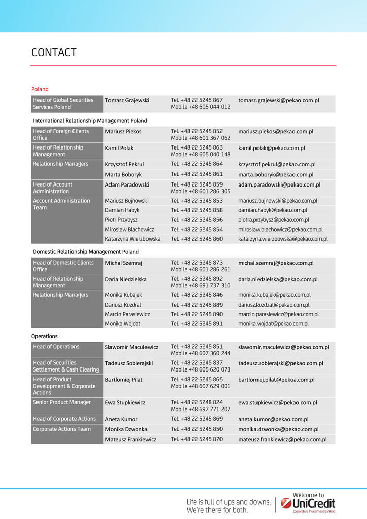 CONTACT Poland Head of Global Securities Services Poland Tomasz Grajewski Tel. +48 22 5245 867 Mobile +48 605 044 012 [email protected] International Relationship Management Poland Head of Foreign Clients Office Mariusz Piekos Tel. +48 22 5245 852 Mobile +48 601 367 062 [email protected] Head of Relationship Management Kamil Polak Tel. +48 22 5245 863 Mobile +48 605 040 148 [email protected] Relationship Managers Krzysztof Pekrul Tel. +48 22 5245 864 [email protected] Marta Boboryk Tel. +48 22 5245 861 [email protected] Head of Account Administration Adam Paradowski Tel. +48 22 5245 859 Mobile +48 601 286 305 [email protected] Account Administration Team Mariusz Bujnowski Tel. +48 22 5245 853 [email protected] Damian Habyk Tel. +48 22 5245 858 [email protected] Piotr Przybysz Tel. +48 22 5245 856 [email protected] Miroslaw Blachowicz Tel. +48 22 5245 854 [email protected] Katarzyna Wierzbowska Tel. +48 22 5245 860 [email protected] Domestic Relationship Management Poland Head of Domestic Clients Office Michal Szemraj Tel. +48 22 5245 873 Mobile +48 601 286 261 [email protected] Head of Relationship Management Daria Niedzielska Tel. +48 22 5245 892 Mobile +48 691 737 310 [email protected] Relationship Managers Monika Kubajek Tel. +48 22 5245 846 [email protected] Dariusz Kuzdral Tel. +48 22 5245 889 [email protected] Marcin Parasiewicz Tel. +48 22 5245 890 [email protected] Monika Wojdat Tel. +48 22 5245 891 [email protected] Slawomir Maculewicz Tel. +48 22 5245 851 Mobile +48 607 360 244 [email protected] Head of Securities Tadeusz Sobierajski Settlement & Cash Clearing Tel. +48 22 5245 837 Mobile +48 605 620 073 [email protected] Head of Product Development & Corporate Actions Bartlomiej Pilat Tel. +48 22 5245 865 Mobile +48 607 629 001 [email protected] Senior Product Manager Ewa Stupkiewicz Tel. +48 22 5248 824 Mobile +48 697 771 207 [email protected] Head of Corporate Actions Aneta Kumor Tel. +48 22 5245 869 [email protected] Corporate Actions Team Monika Dzwonka Tel. +48 22 5245 850 [email protected] Mateusz Frankiewicz Tel. +48 22 5245 870 [email protected] Operations Head of Operations Foreign Payments Incoming Payments and Bank-to-bank Transfers Tomasz Olczak Tel. +48 22 6560 763 Fax +48 22 5714 803 [email protected] Foreign Payments Investigations Tomasz Olczak Tel. +48 22 6560 763 Fax +48 22 5714 803 [email protected] Loro Accounts Maintenance Tomasz Olczak Tel. +48 22 6560 763 Fax +48 22 5714 803 [email protected] Tel. +48 22 5827 713 [email protected] Tel. +48 22 5827 714 [email protected] Foreign Exchange and Money Markets Foreign Exchange and Money Marcin Bilbin Markets Krzysztof Zadura Imprint: Bank Polska Kasa Opieki SA ul. Grzybowska 53/57 00-950, Warsaw, Poland Switchboard: +48 22 656 0000 SWIFT BIC: PKOPPLPW BLZ: GSS Contact Details: Corporate & Investment Banking Bank Polska Kasa Opieki SA Global Transaction Banking Global Securities Services ul. Zwirki i Wigury 31 02-091, Warsaw, Poland http://gss.unicreditgroup.eu